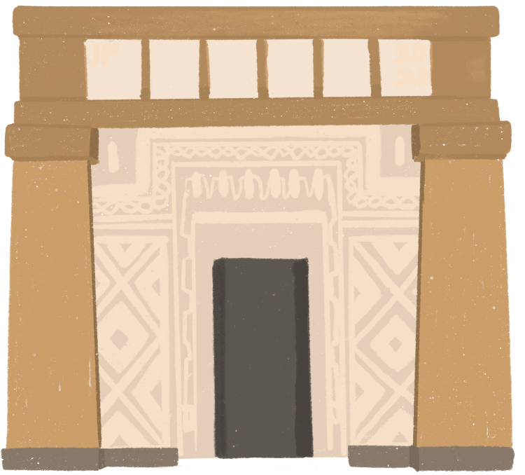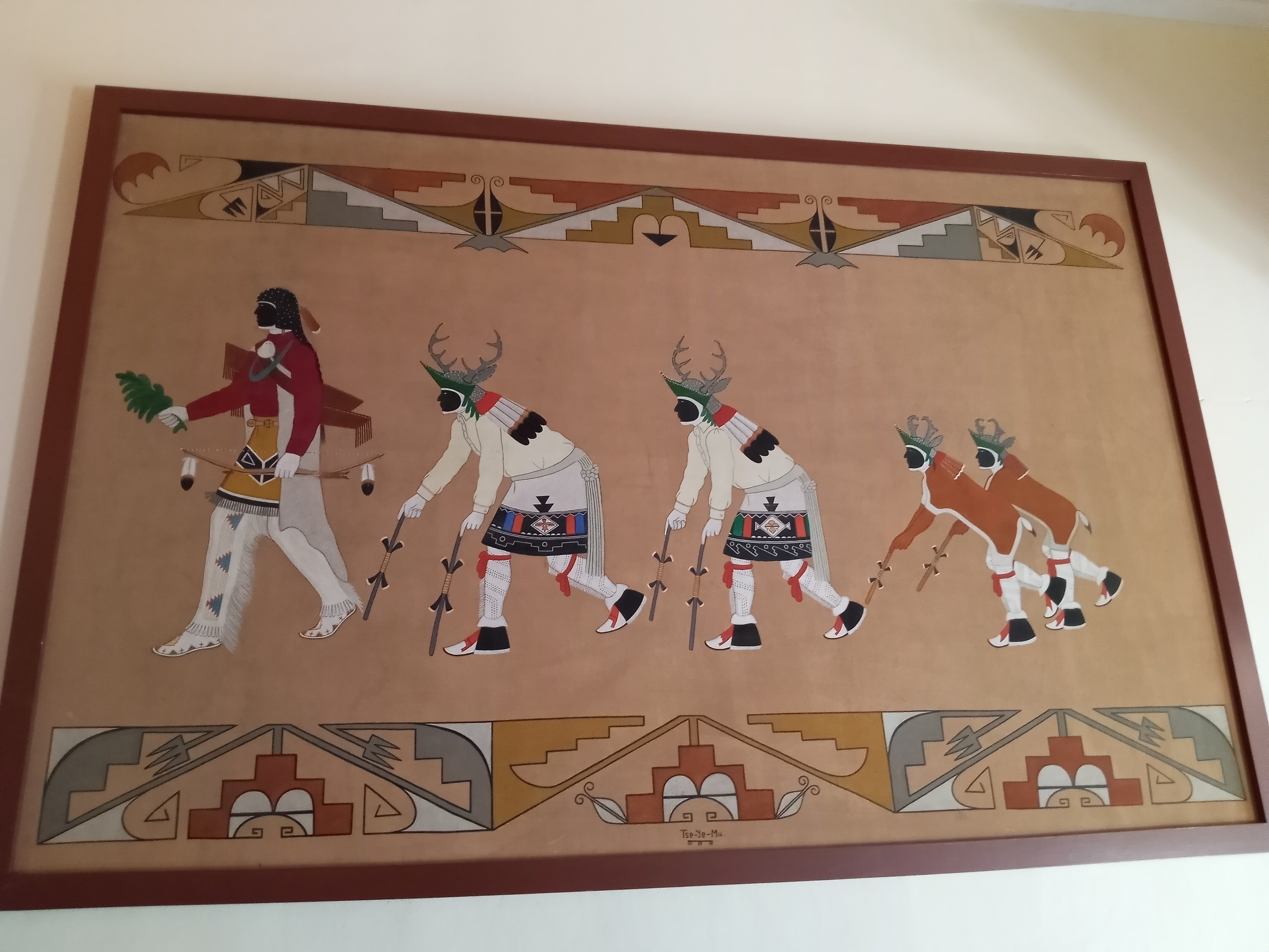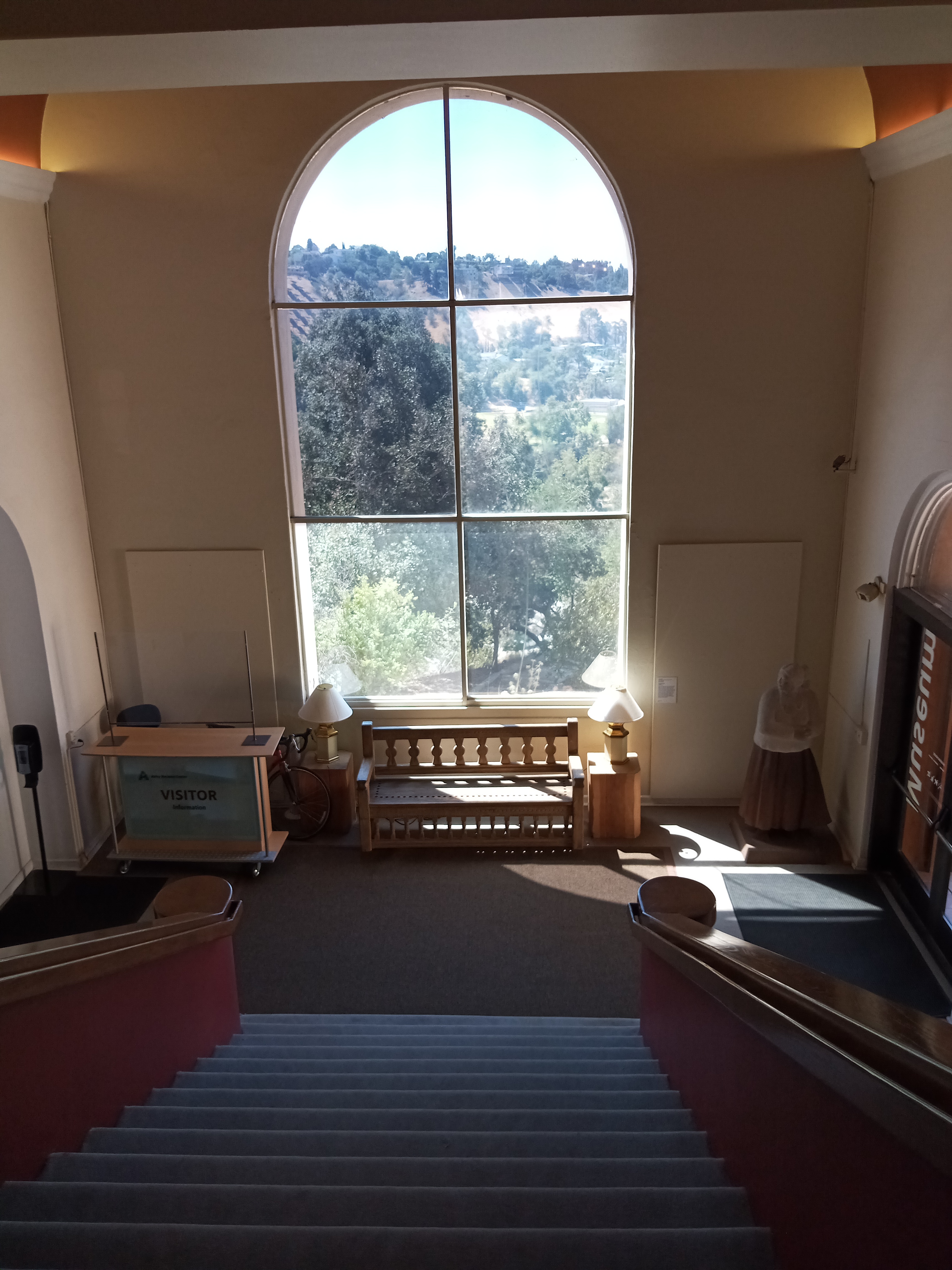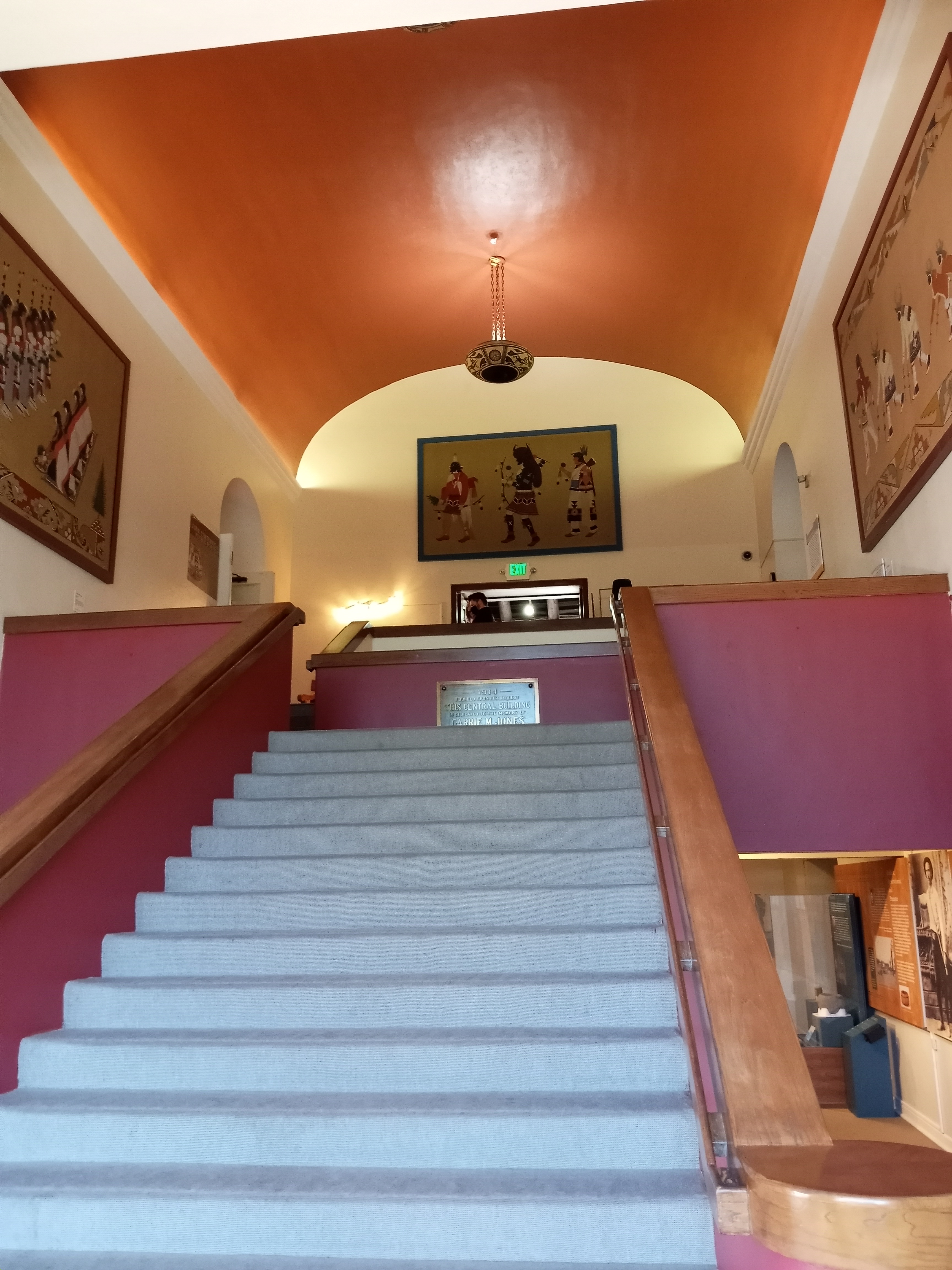 The tunnel ends at a small, rickety elevator that takes you up into the museum. A jarring transition occurs as soon as the door slides open, when you are deposited in the spacious and well-lit lobby of the museum. A grand staircase takes up most of the room, while a giant arched window reveals the surrounding hills and sky. Murals adorn the walls above the stairway, depicting Native American dancers in traditional dress.