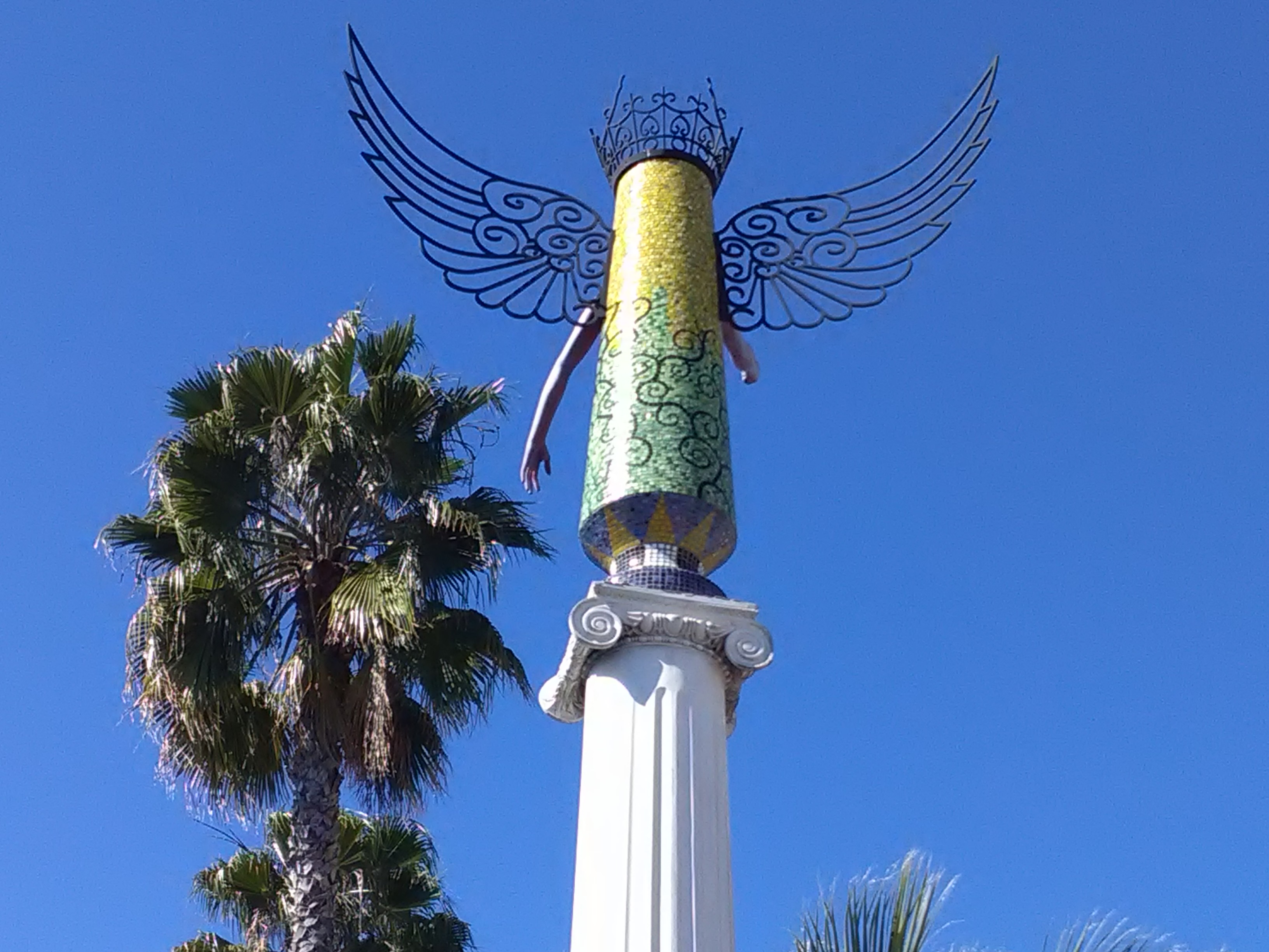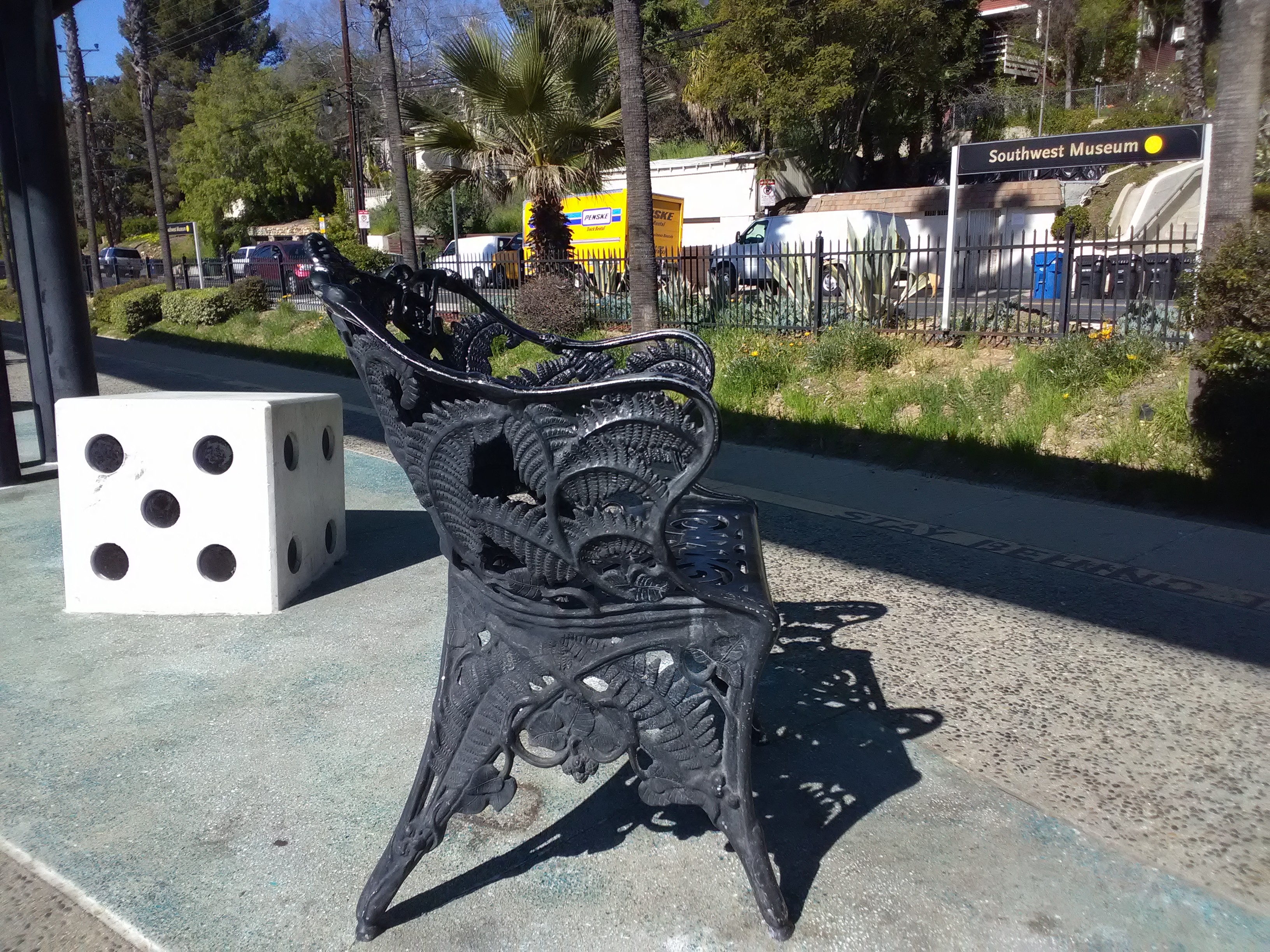 The station, located along the A Line, is wedged on a hillside between two quiet streets, with a stairway connecting both to the platform. Palm trees and flowers line the tracks, it’s tranquil, and the station has some rather whimsical pieces of public art. There’s a die partially buried in the cement, some false pedestals, intricate chairs to sit on, and atop a few ionic columns are abstract, winged figures wearing crowns (I liken them to pineapple princesses) pointing in seemingly random directions. It’s cheesy, but also rather endearing.
