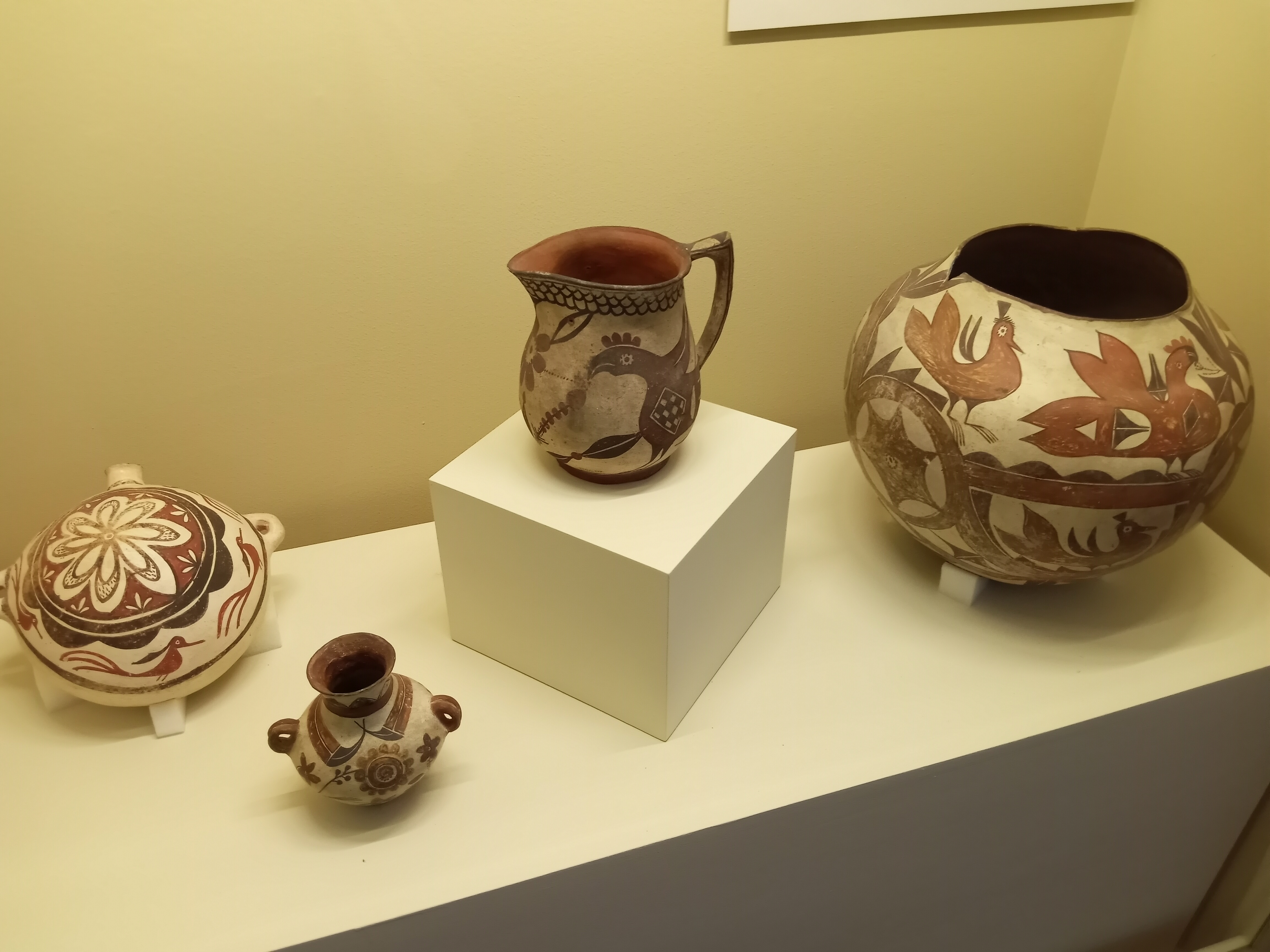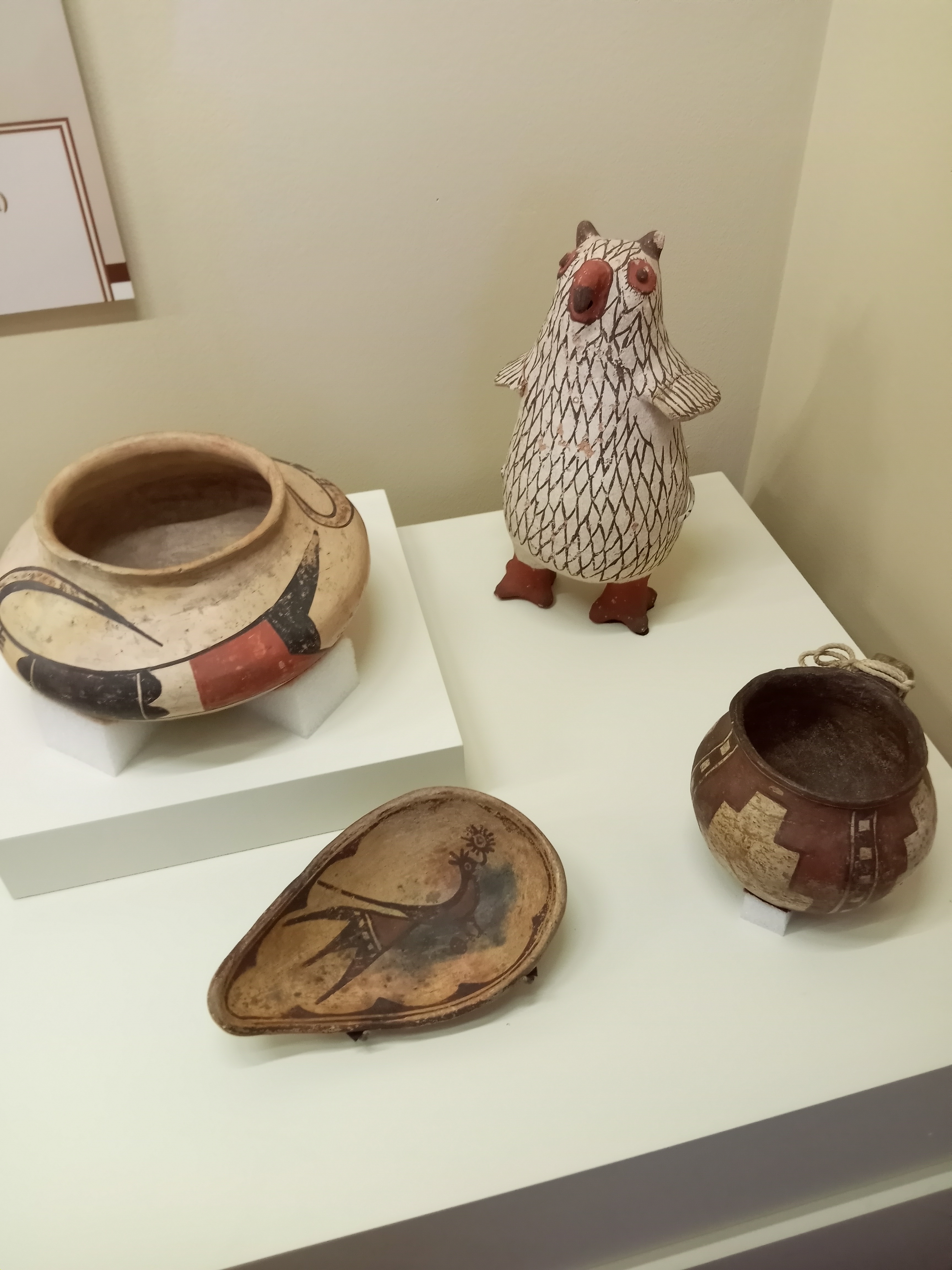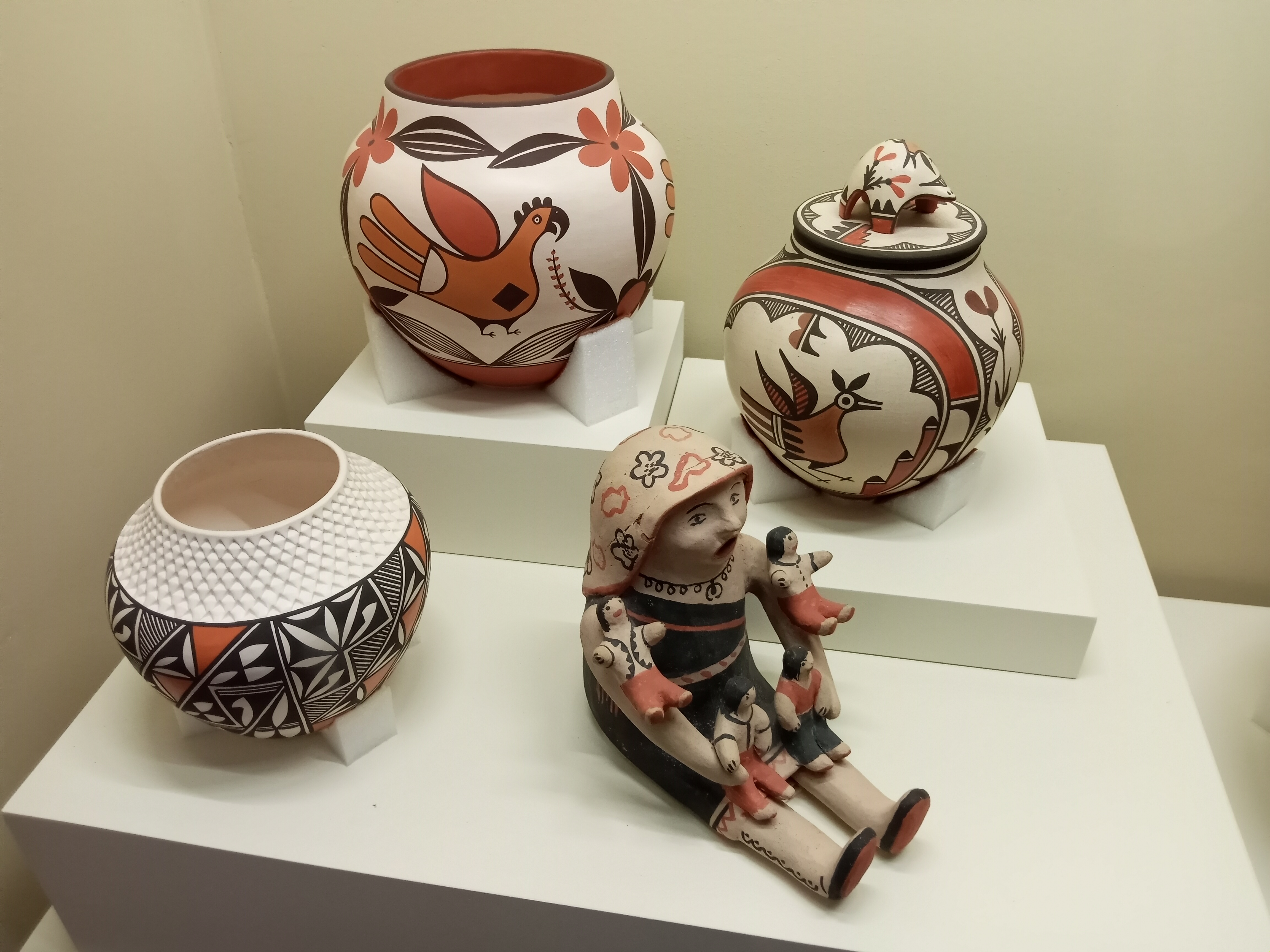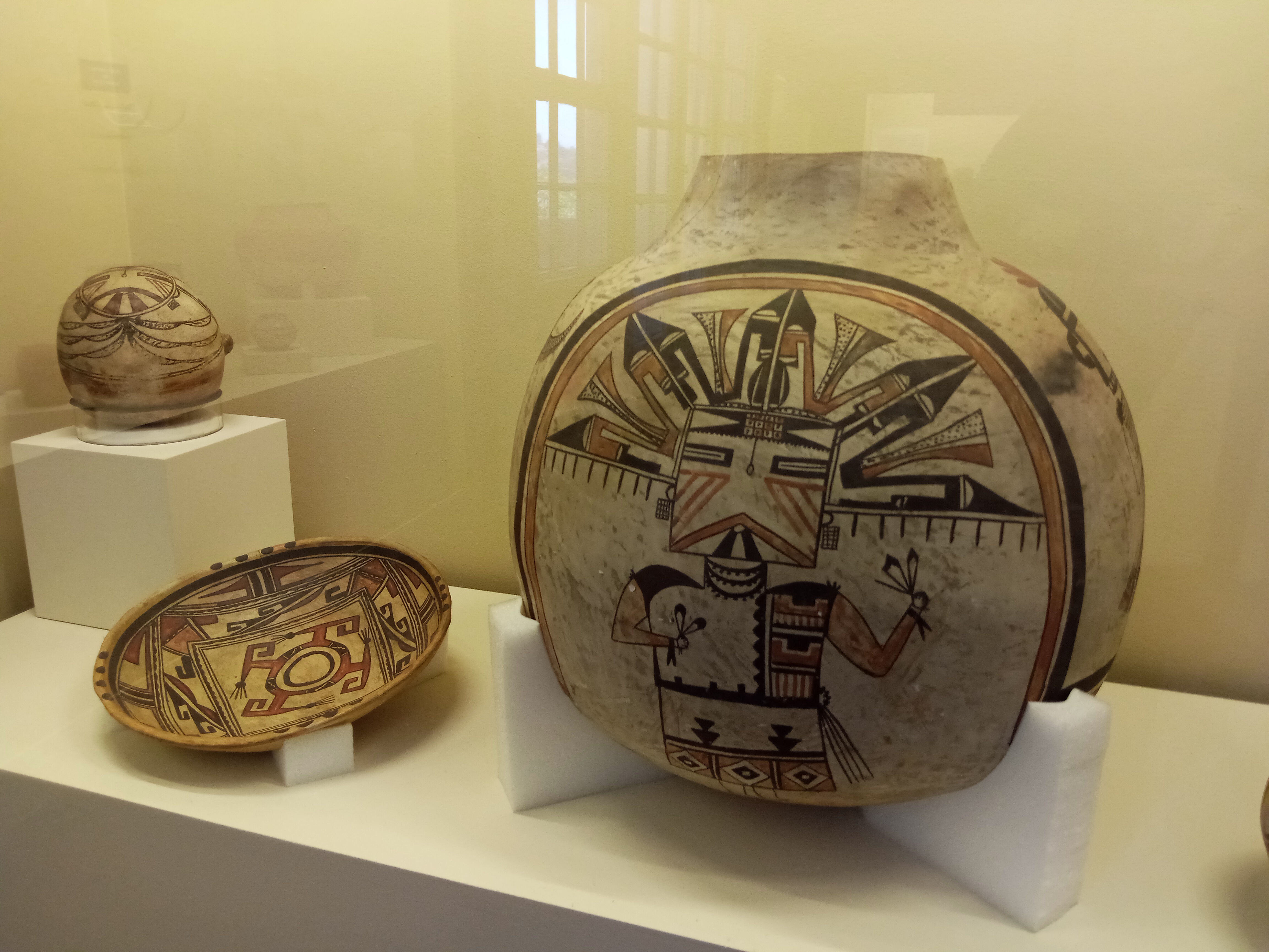 Upstairs, a staff desk sits at the top of the grand staircase, next to the main entrance which leads out to the parking lot. Make a left at the top of the stairs and you’ll find yourself in the pueblo pottery gallery, with its arched ceiling and large window. The pottery itself is beautiful, with a very comprehensive overview of the differences between regional styles and ancient and modern techniques. They even have a couple of pieces made by Maria Martinez—you may not have heard of her, but trust me when I say that she is a very big deal in New Mexico.