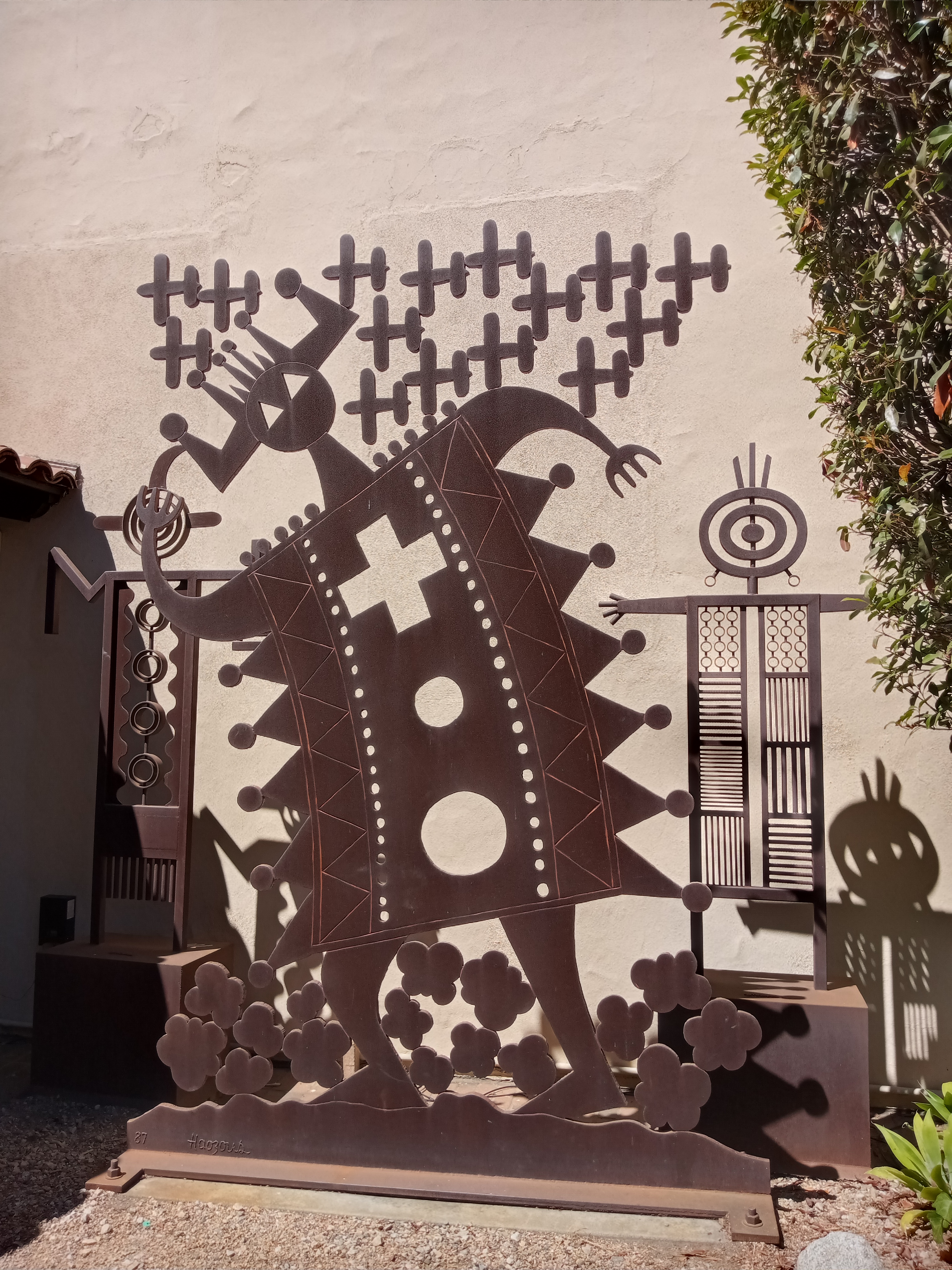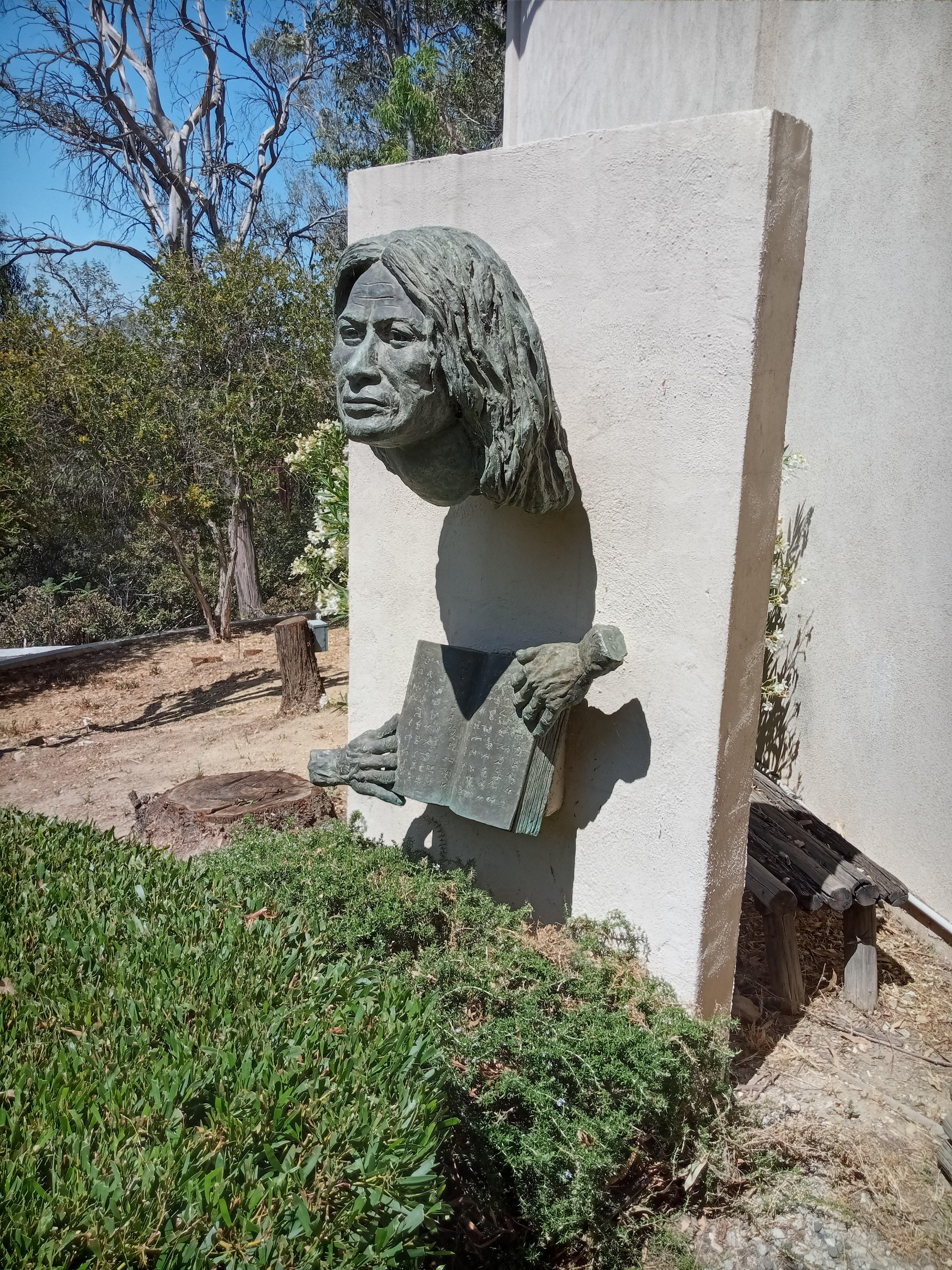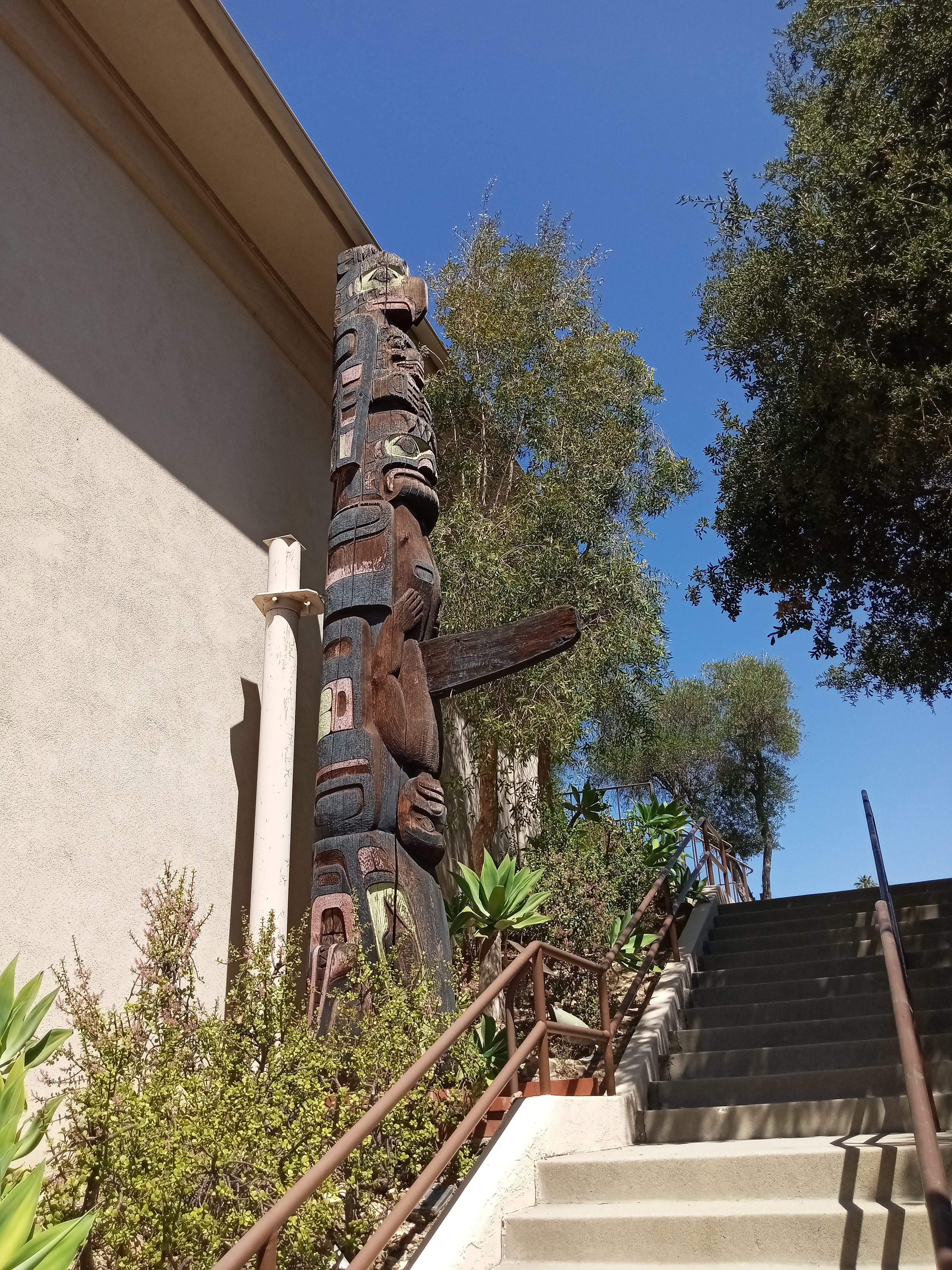 The artwork out here feels haphazardly placed, with little sense of rhyme or reason joining them together other than them all being artworks by Native Americans. There’s a stone statue referencing the Cherokee language. There are bronze sculptures depicting traditional Southwestern Native American forms and another representing a Tongva canoe facing the parking lot. Along the stairs leading up to the parking lot is a totem pole from the Pacific Northwest. That last one might seem particularly random, but it takes me back to my college days at the University of New Mexico, where I worked at an anthropology museum. Located on campus, the Maxwell Museum of Anthropology had a totem pole in their courtyard at the time. I guess if you were an anthropology museum that was around in the mid-20th century, you just had to get yourself a totem pole.