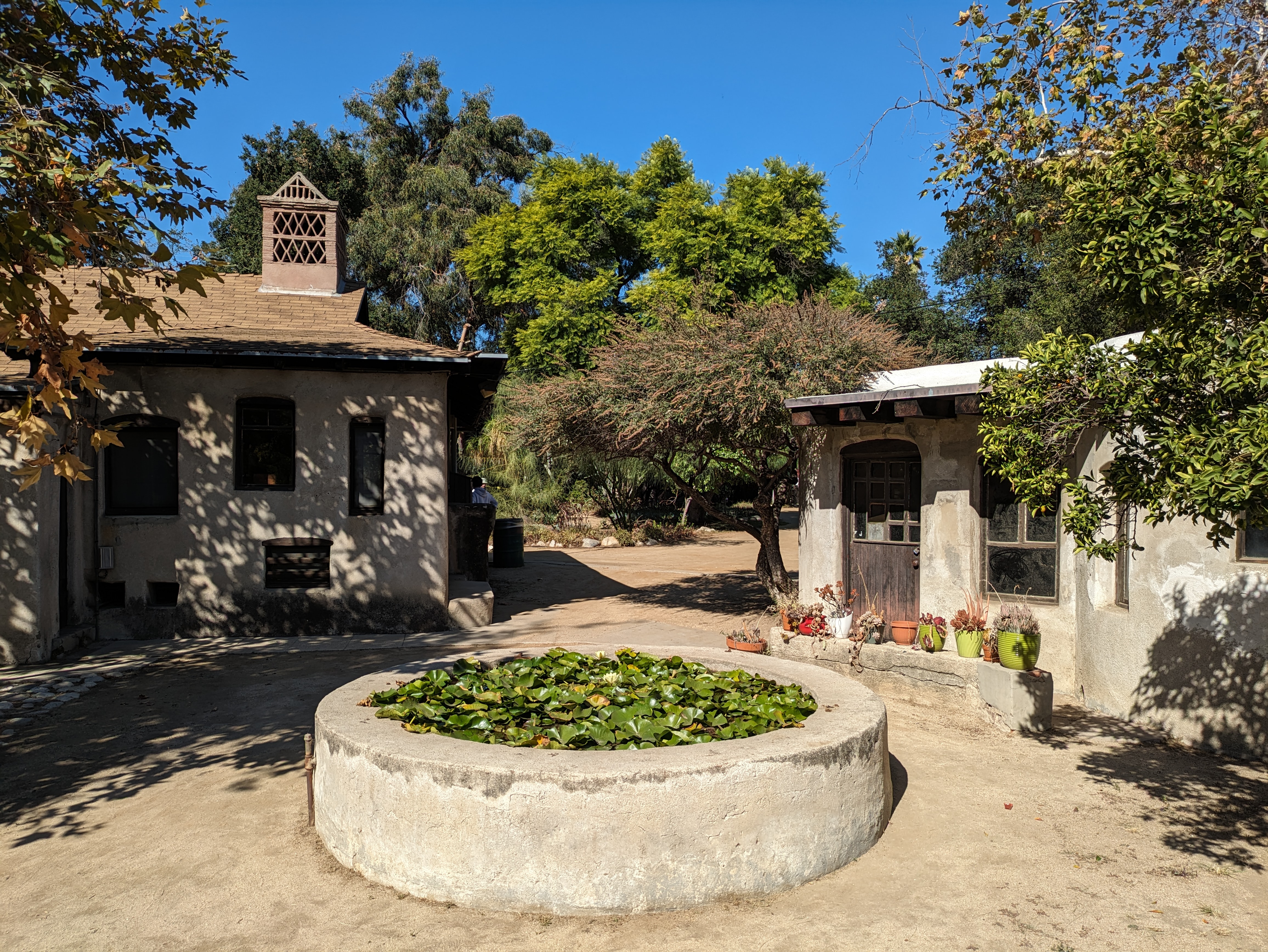 El Alisal is essentially a small castle, built by hand by Lummis and a small group of hired laborers over nearly a dozen years. The exterior was constructed using river rock excavated from the bed of the Arroyo Seco creek, which at the time was a trickling stream at the edge of the property, not the freeway-adjacent concrete channel that it is today. A turret occupies one corner of the house, marking the living room. In the back, a tranquil courtyard holds a shady tree and a small lily pond fountain.