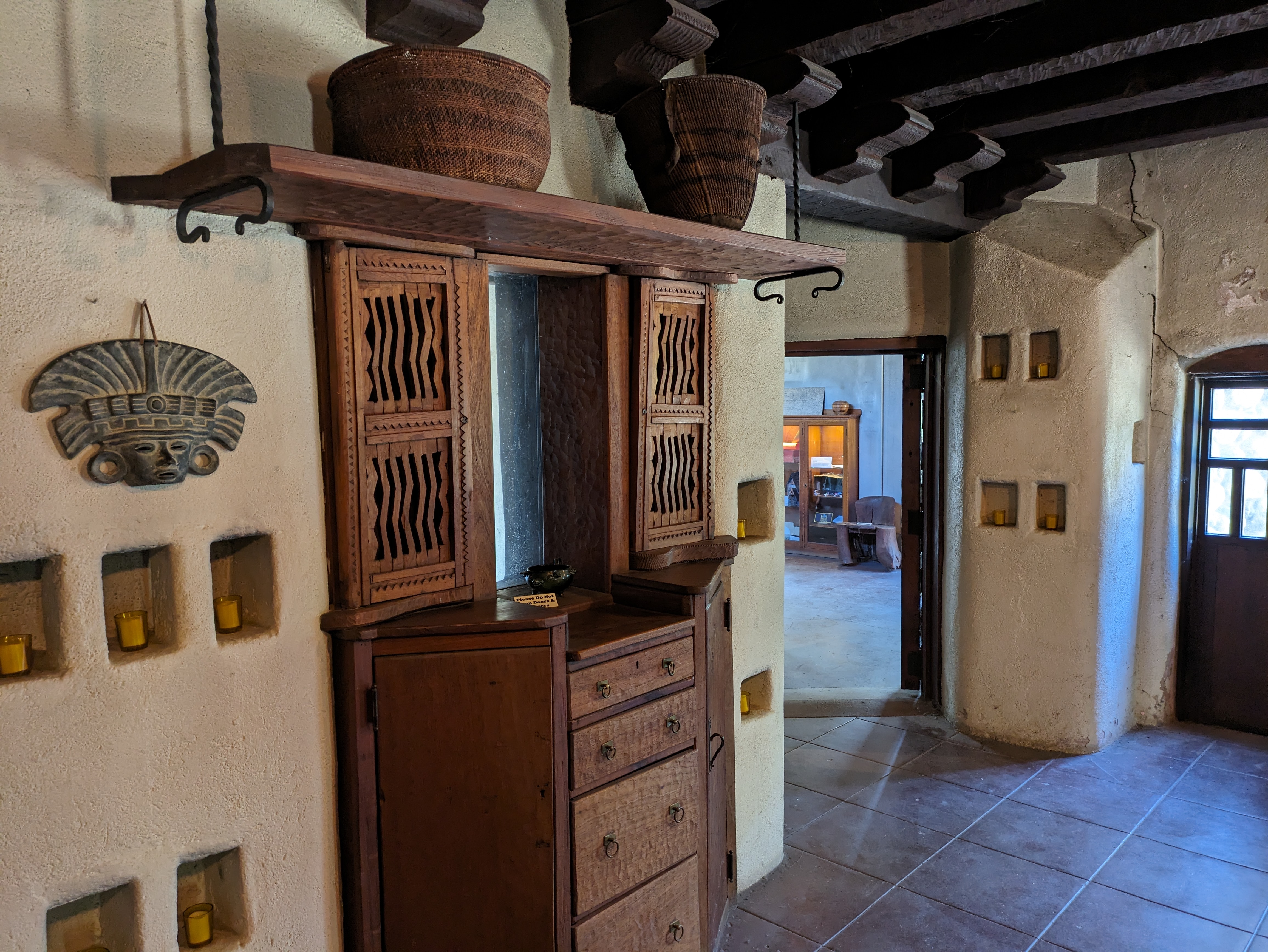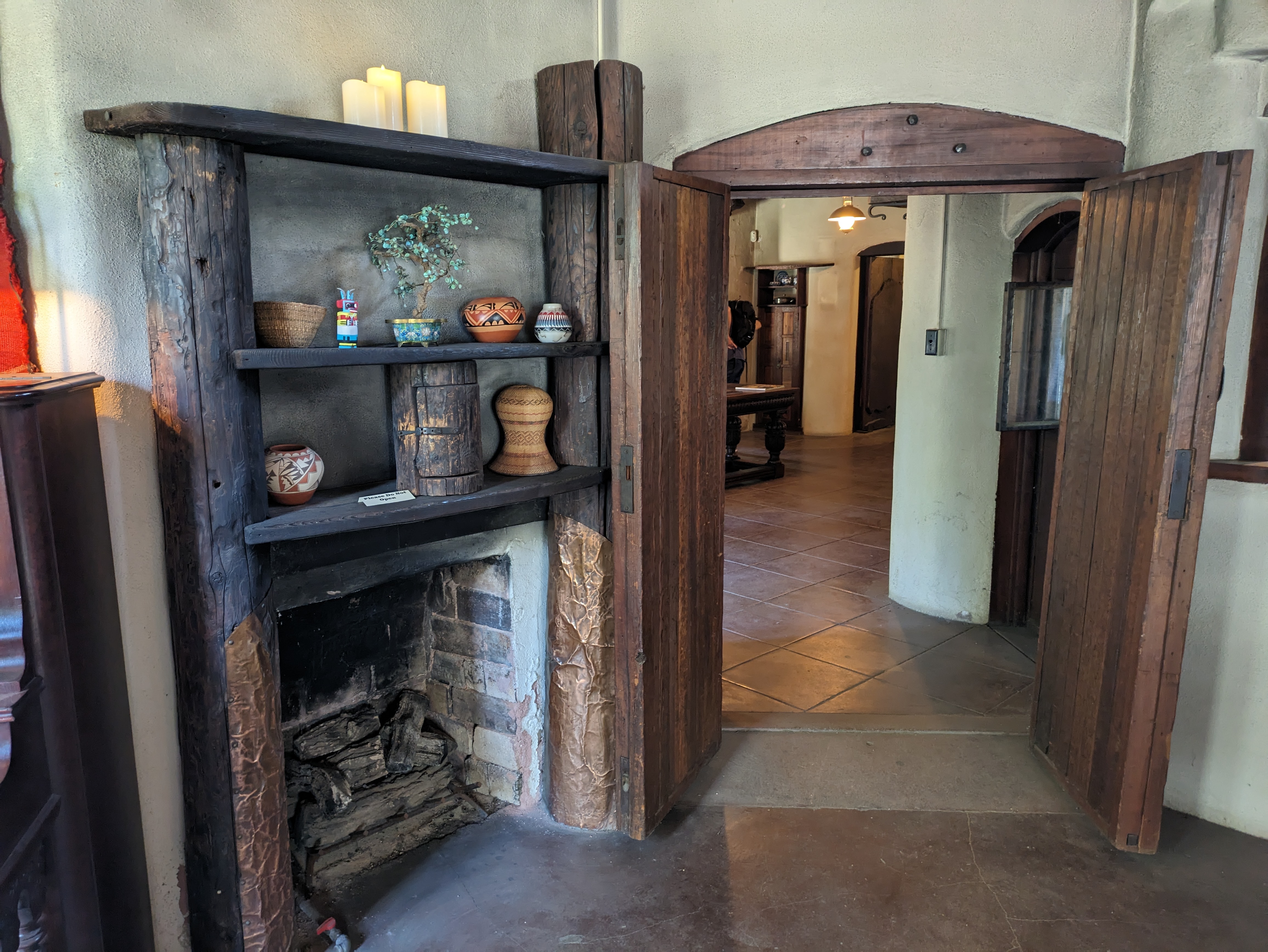 Inside, Southwestern-style flourishes mark the interior. The entrance is marked by heavy, rustic wooden doors, adorned with a particular insignia of Lummis’ creation mounted on the front. Curved adobe walls, corner fireplaces, ceiling timber beams, Native American rugs, and a tranquil courtyard in the back recall the New Mexican homes that Lummis would have cherished.