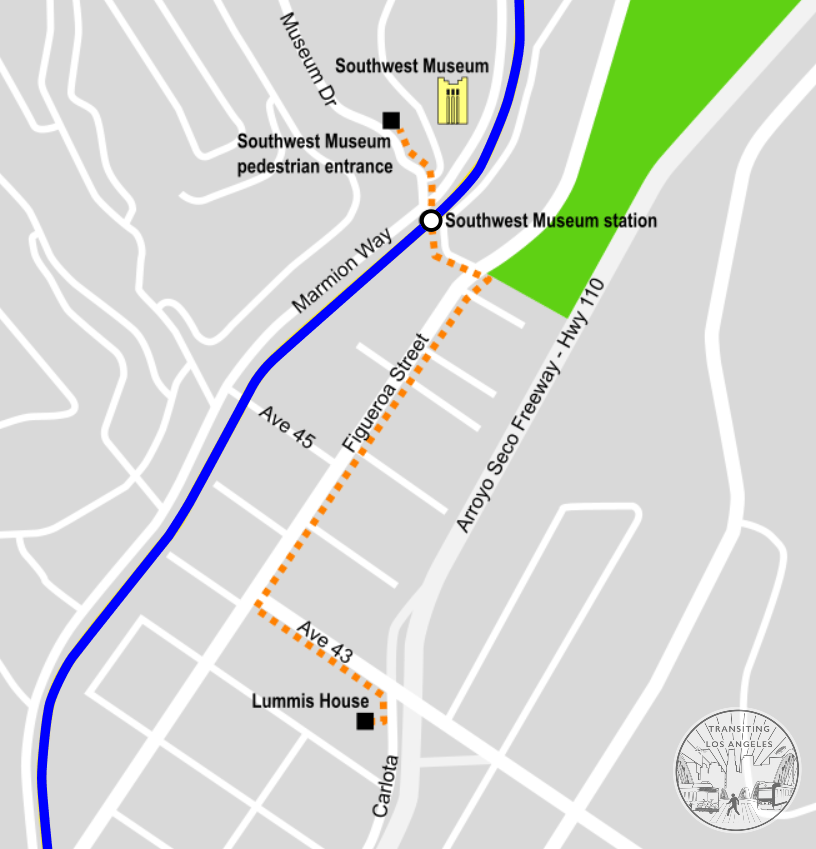 The Lummis House—also known as El Alisal—sits at the corner of Ave 43 and Carlota Blvd, right next to the Arroyo Seco Freeway and about a 10-minute walk from the Southwest Museum station on the Metro A Line (formerly the Gold Line). From the platform entrance, take the stairs downhill and walk down the street until you reach Figueroa. Cross the street, make a right, and head down Figueroa until you reach Ave 43. Then make a left, walk a block to Carlota, make a right and walk until you find the entrance gate.