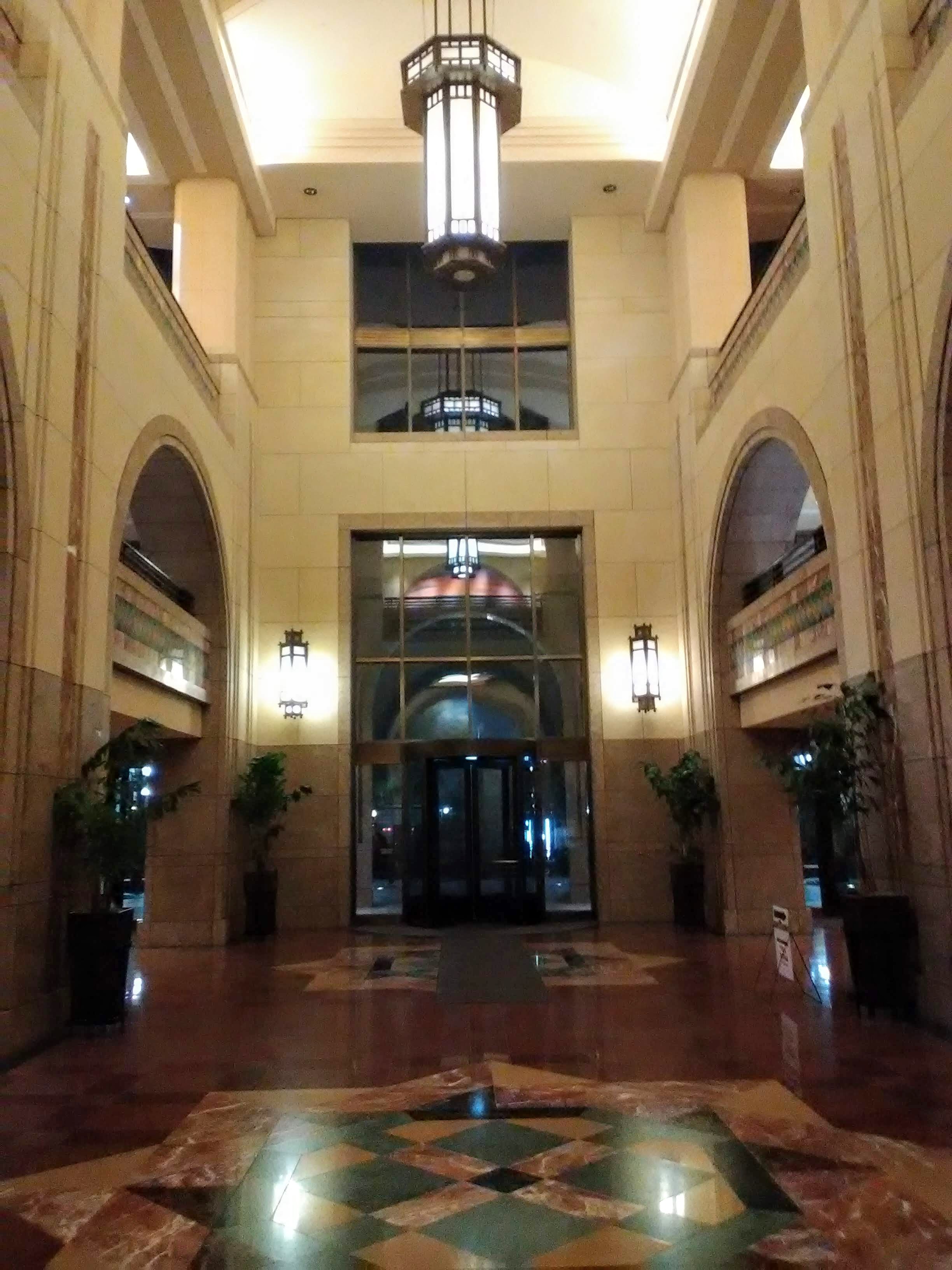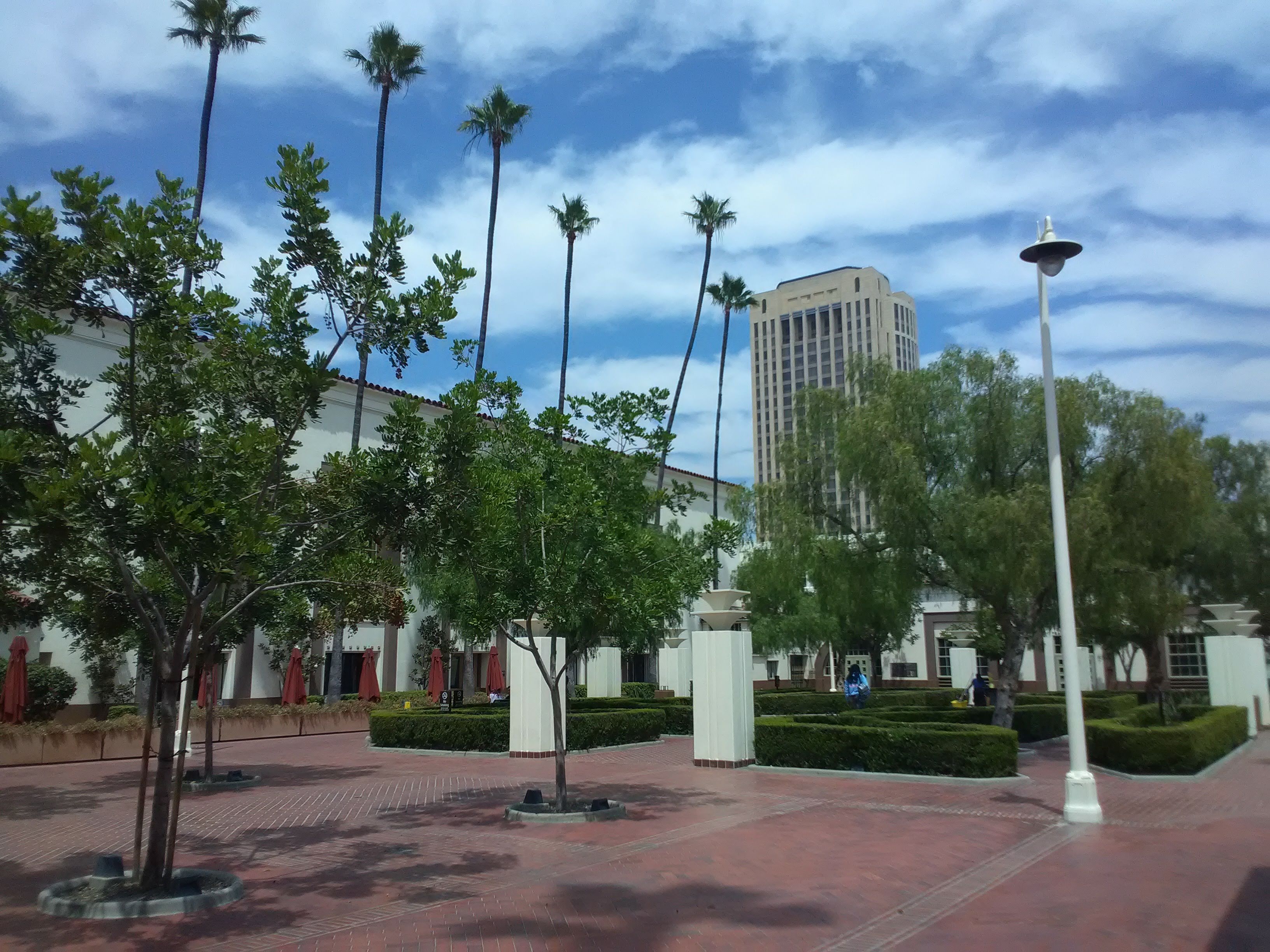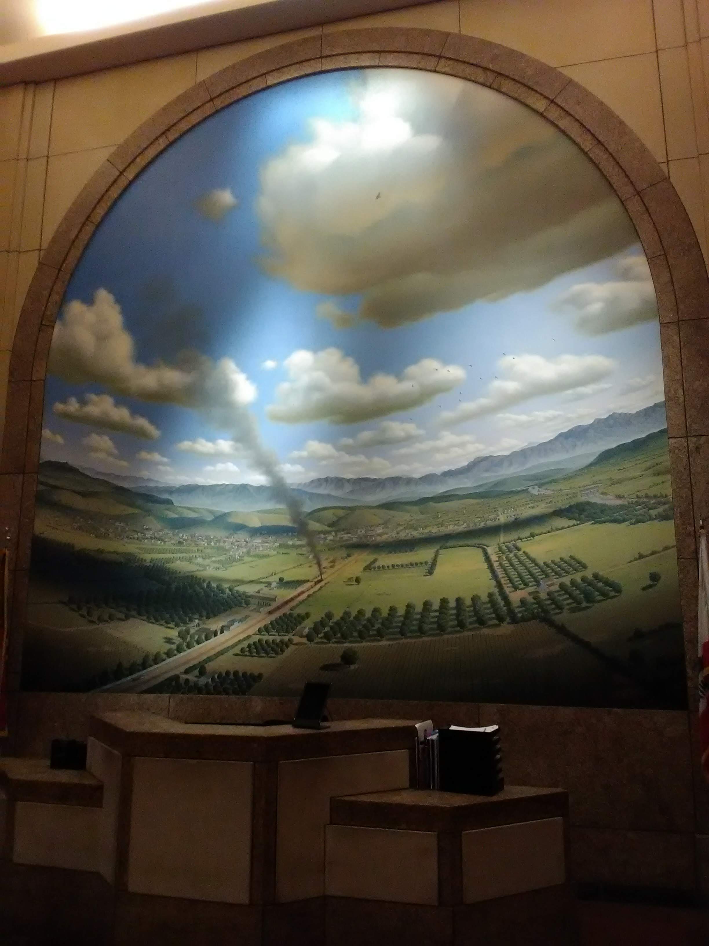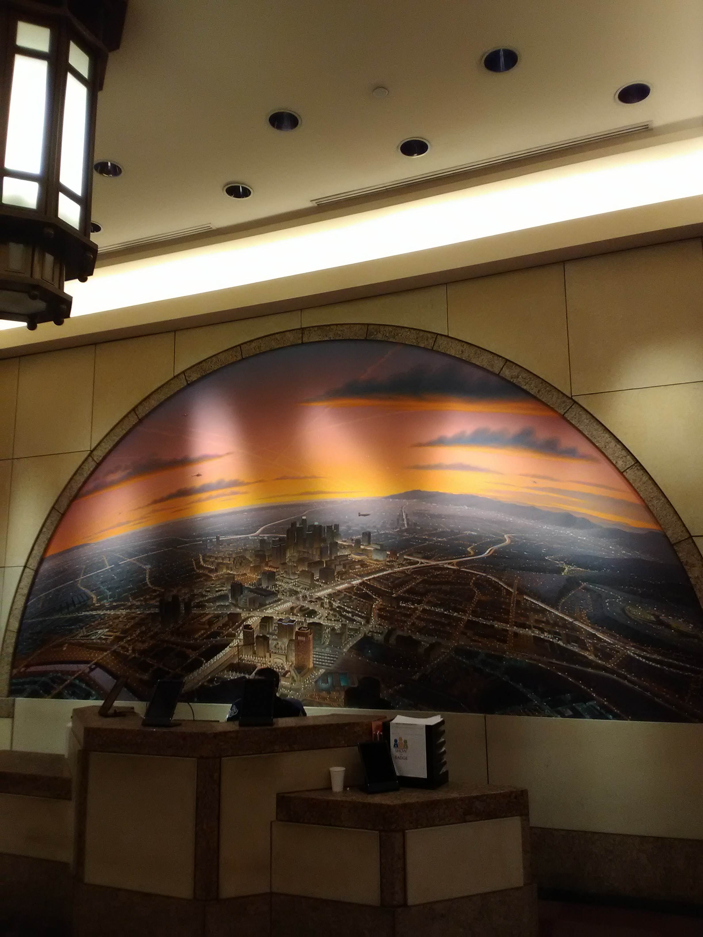 Metro Headquarters. I’ve only had reason to go inside this building to attend a Metro board meeting or public session, but if you have a chance, the atrium is pretty grand. Huge murals adorn a pair of arched alcoves which depict the history of transportation in Los Angeles. The one on the ground floor is an idealized view of LA circa 1870s, after the construction of the city’s first railroad, while the one on the second floor is a fanciful near-future LA, which shows a lot of tall buildings surrounding Union Station (something that has been in plans for the area for years but has never been built).