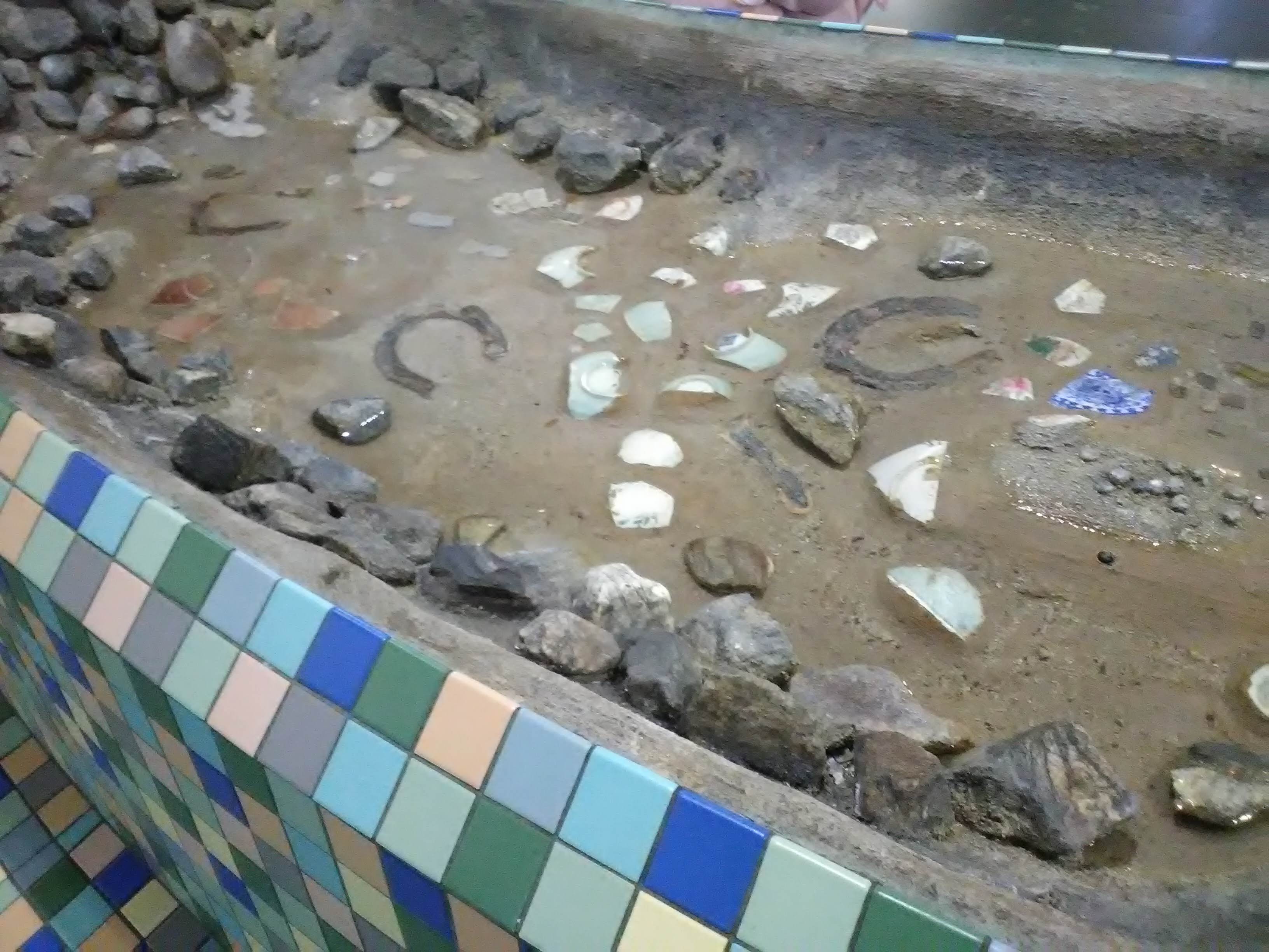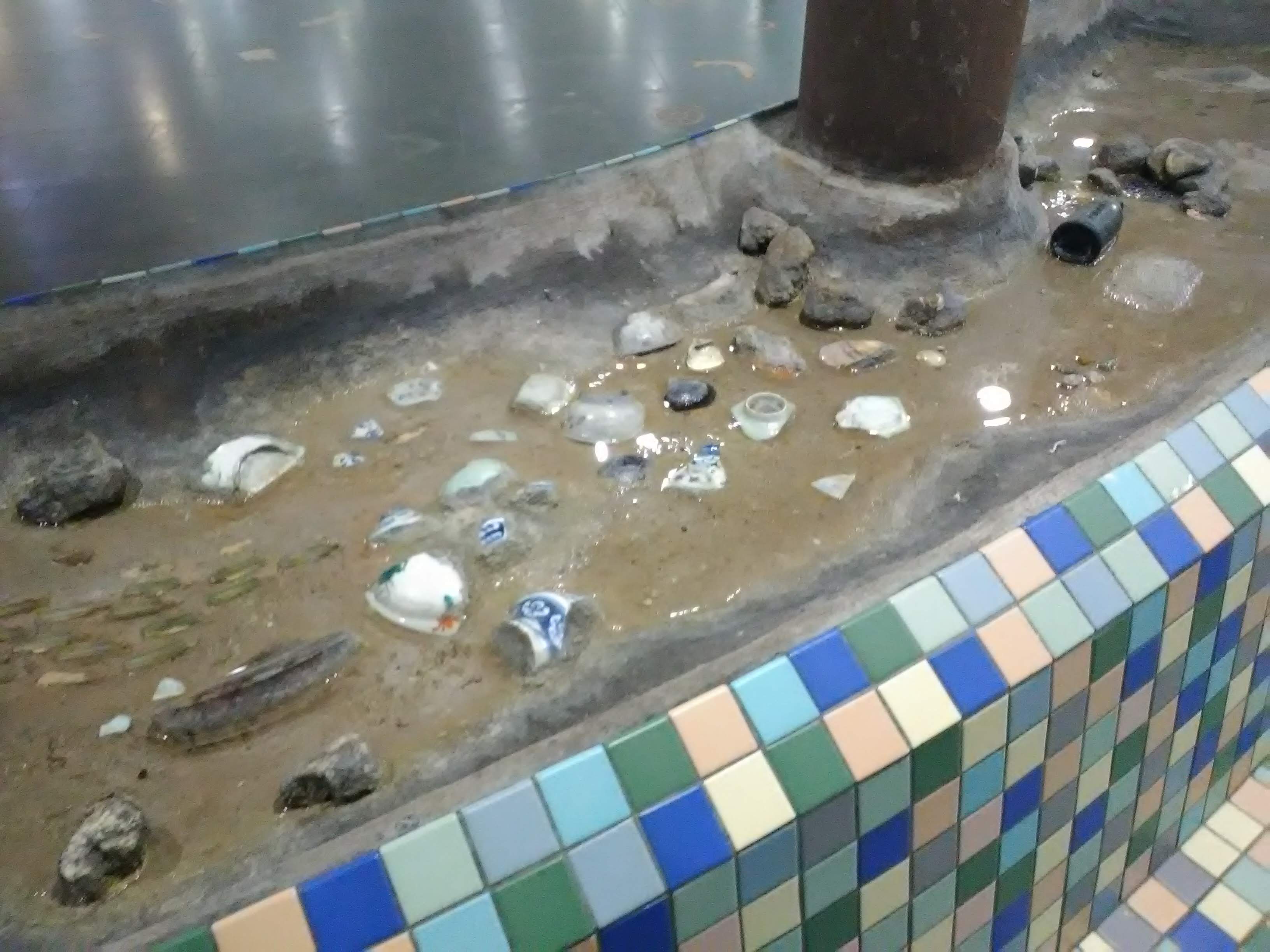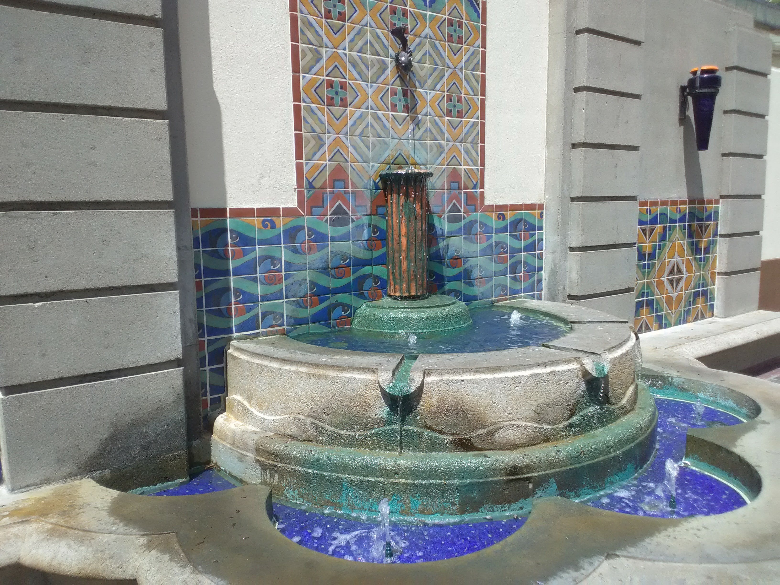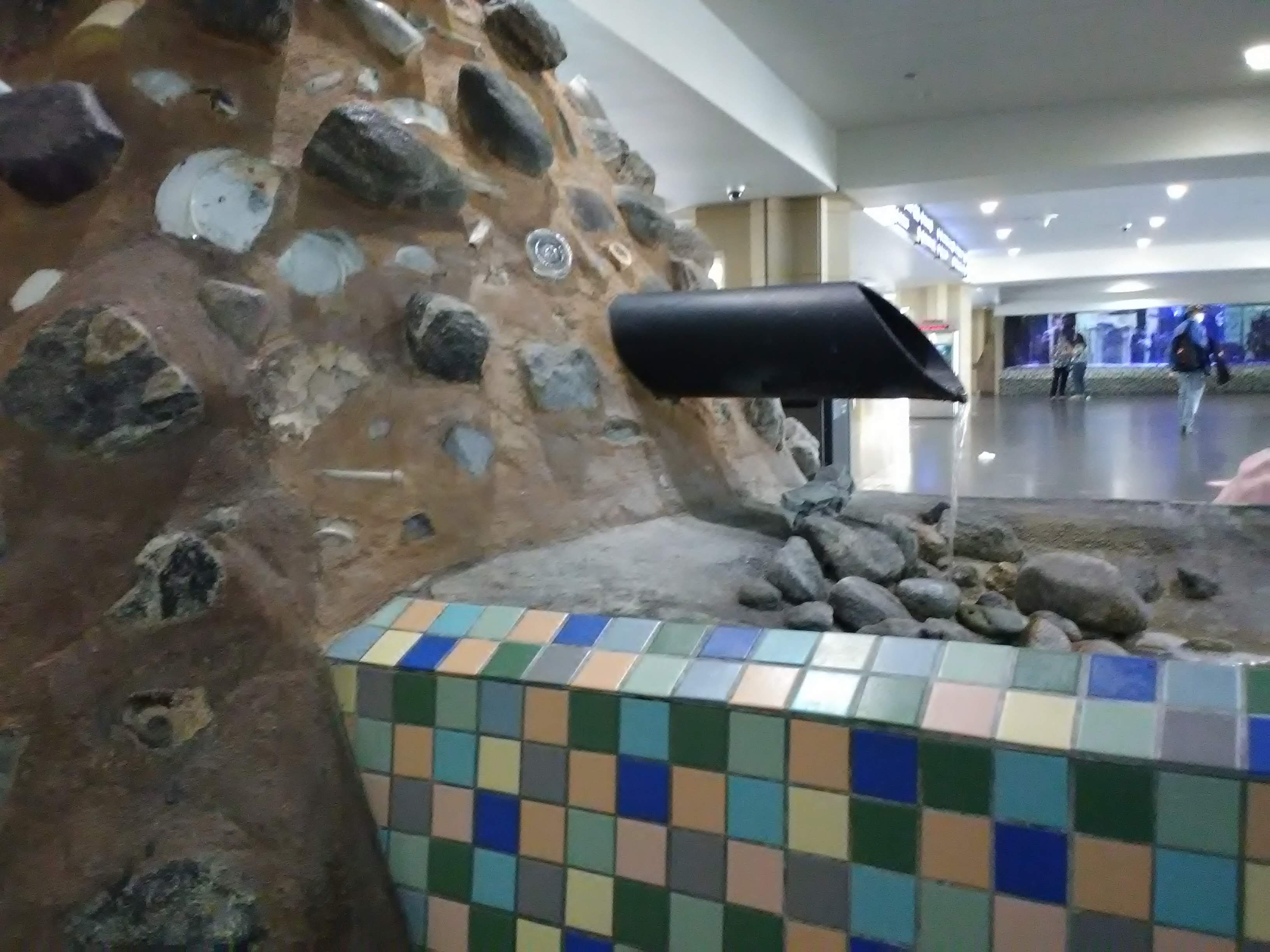 The third part is the most understated one, but I think it’s also the most intriguing. On the south side of the atrium is a fountain embedded in a conical-shaped pile of debris, with a dirty-looking pipe sticking out of one side. A trickle of water spills out of the pipe, forming a tiny stream of water that runs between a pair of tile benches. If you look in the space between the benches, you’ll see horseshoes, fragments of chinaware, and jade crystals embedded in the cement. These are actual artifacts of L.A.’s original Chinatown, which sat on this site and was demolished to make way for Union Station. It’s not a very photogenic piece, but that’s the brilliance of it. The concrete channel, the dirty pipe, and the debris are evocative of the Los Angeles River, full of history that has been buried by modern industry. But all it takes to recover that history is dig a little beneath the surface.