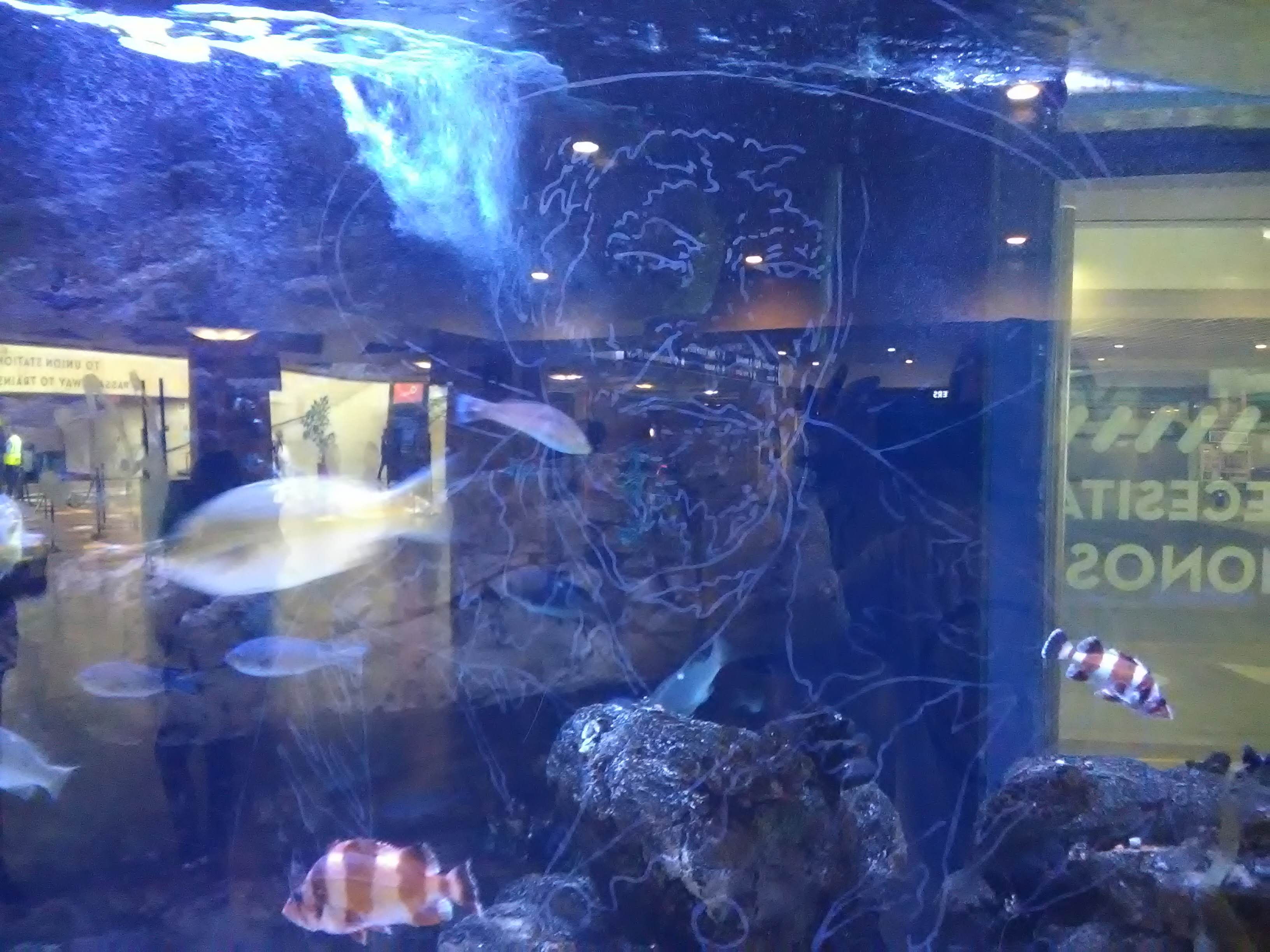 On the north side of the atrium is the other very noticeable part, a large aquarium filled with native coastal fish. This always appeals to kids, and the best part is there’s a tile bench encircling the tank, allowing families to sit down while the kids press their hands to the glass and point at all the colorful fish swimming by. Etchings of historical figures from Los Angeles past are imprinted on the aquarium glass, tying it to the other two parts of the artwork, while the floor of the atrium has bronze symbols of native plants and animals.