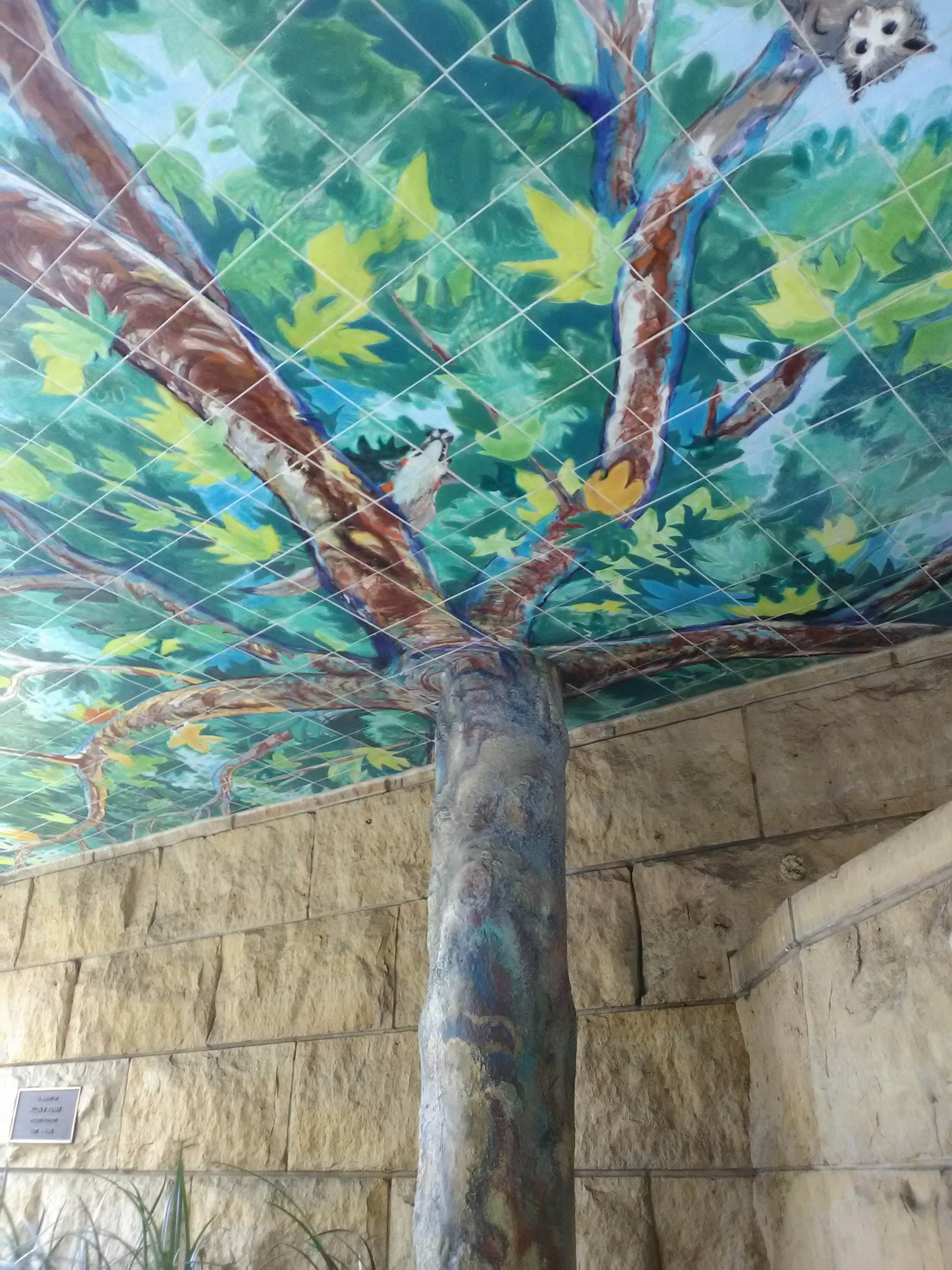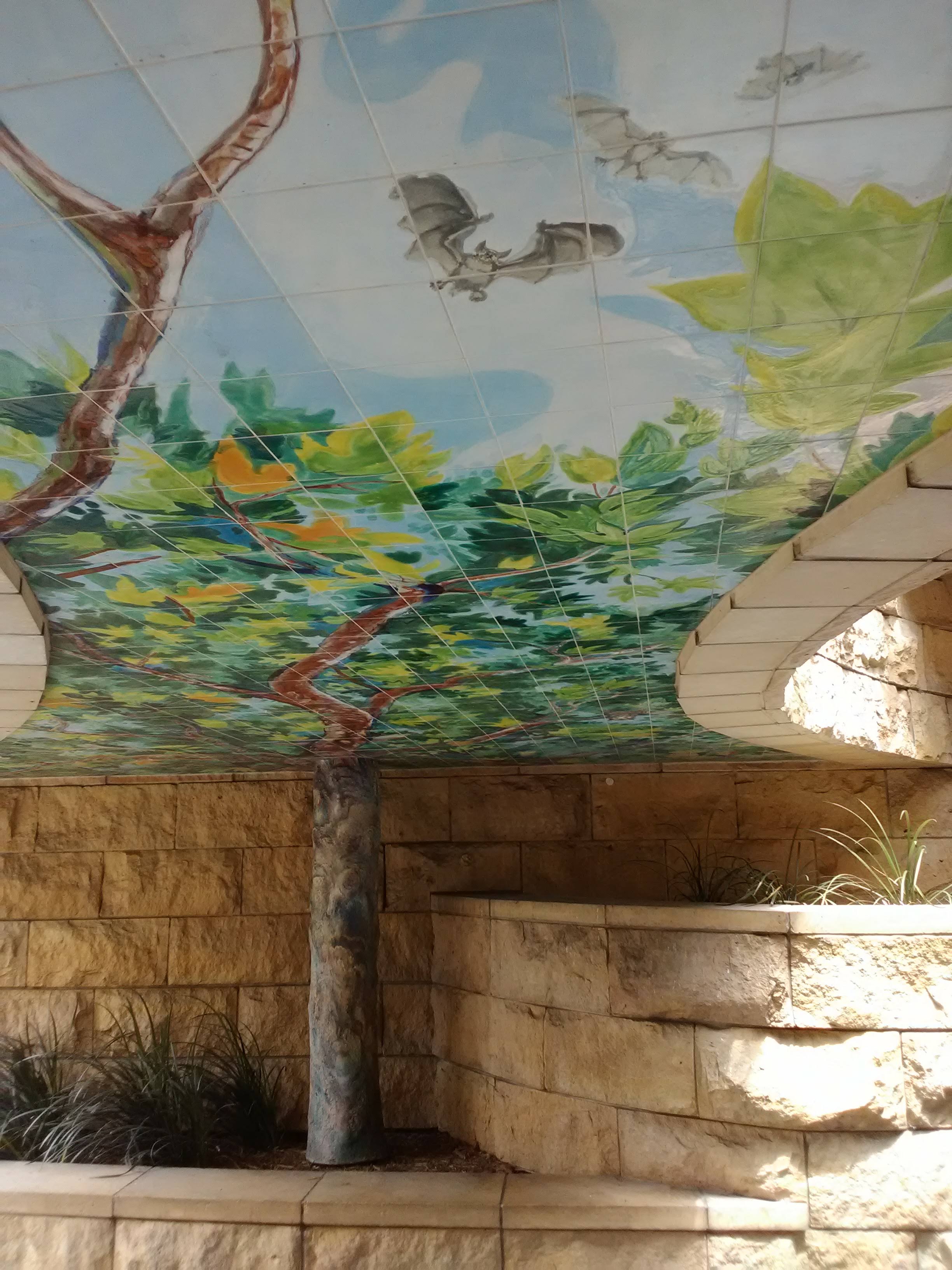Patsaouras Bus Plaza. The passageway leading from the atrium up to the center of the bus plaza has lots of interesting delights, such as a cascading fountain down the sandstone steps, native plants, and a beautiful mosaic on the underside of a pedestrian bridge attached to a bronze tree truck to give the illusion of standing under a serene tree. Look up and you’ll see plenty of cute critters painted among the branches and leaves, as well as a set of bronze plates inscribed with depictions of local flora and fauna.
