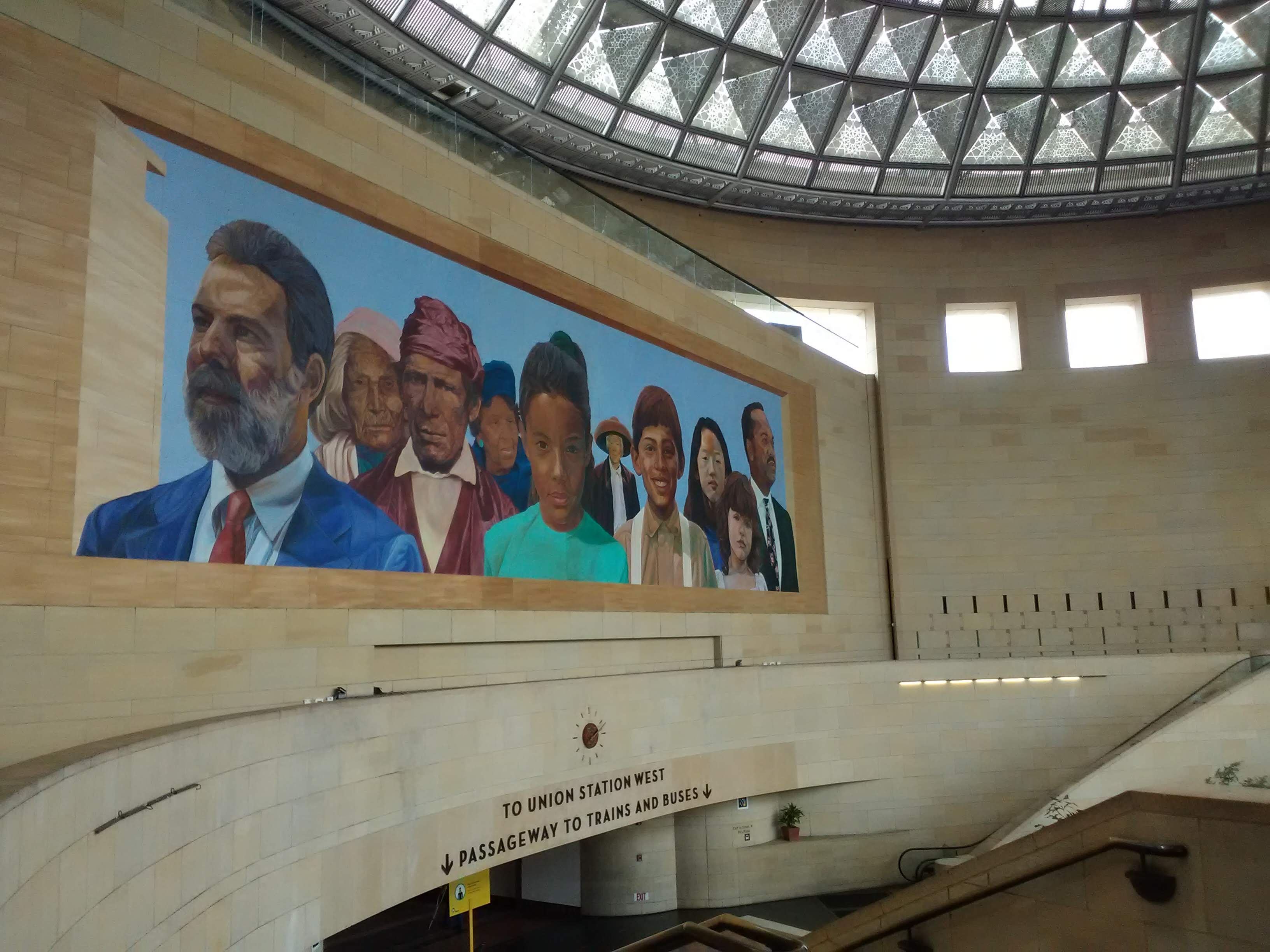 “City of Dreams, River of History”. This artwork, which sits in the atrium at the east portal to the train platforms, is made up of three parts which feel so distinct that I had always assumed they were three different artworks. The most noticeable part is the huge mural above the east portal, depicting a multi-ethnic group representing many of the city’s earliest settlers.