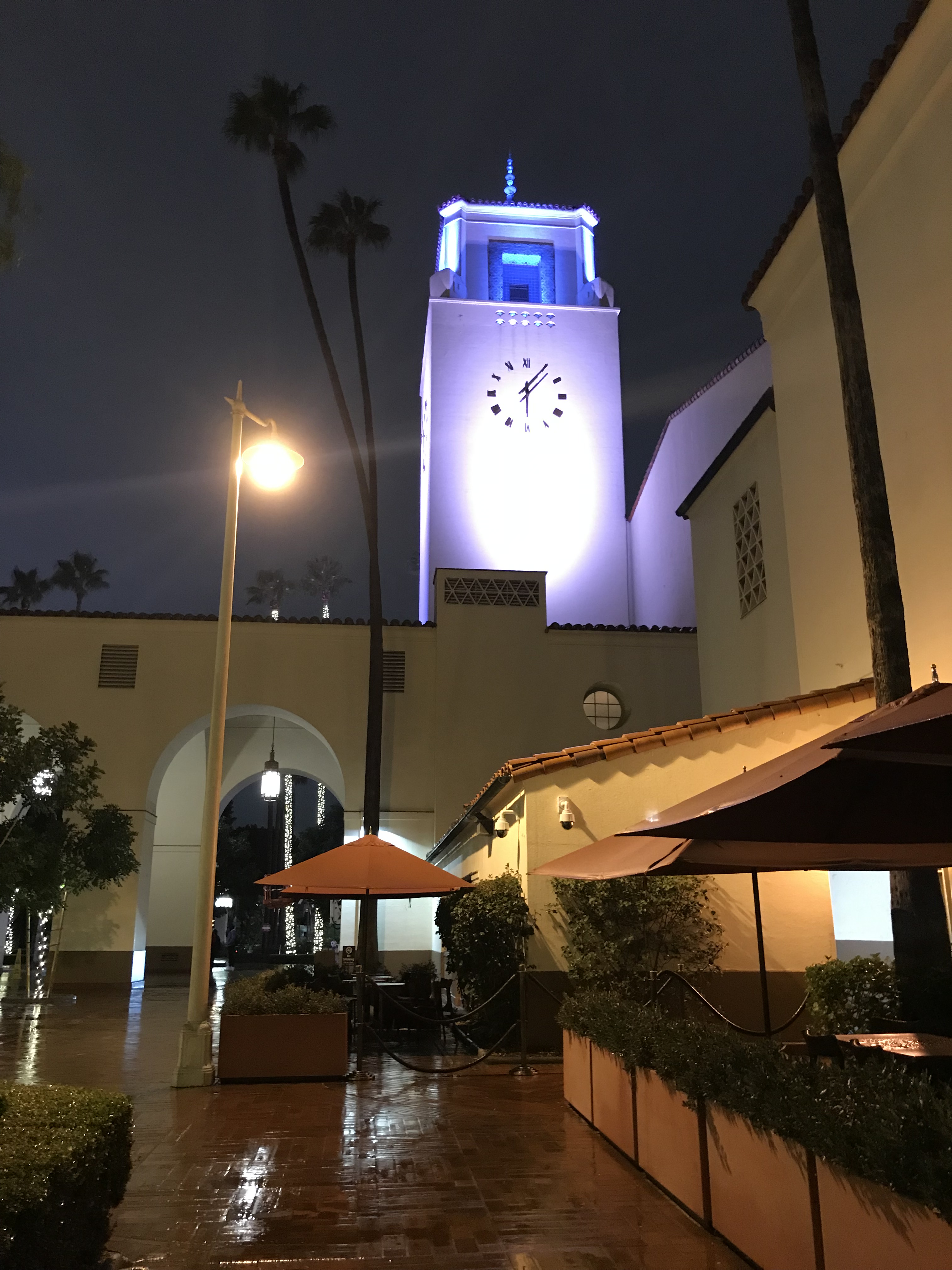 Union Station holds a special place in my heart. For the first few years of my life living in Los Angeles, I regularly passed through its corridors, swept up in its crowds of commuters and often running into friends and coworkers who were also rushing to catch their trains. Standing on the train platform and taking in the sights around me became one of those crucial first impressions I got of the city. I’d savor the warm evening air and admire the silhouette of the downtown skyline, the changing colors projected on the Union Station tower, the pink of the San Gabriel Mountains in the sunset, while listening to the clang and rumble of Metrolink trains slowly pulling out of the station.