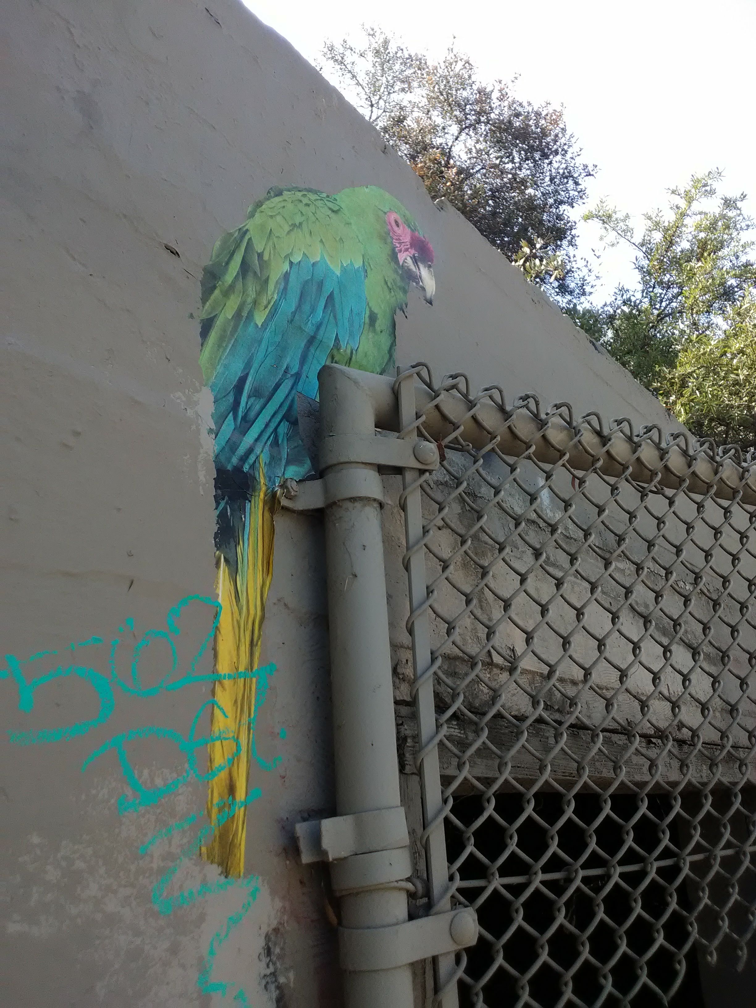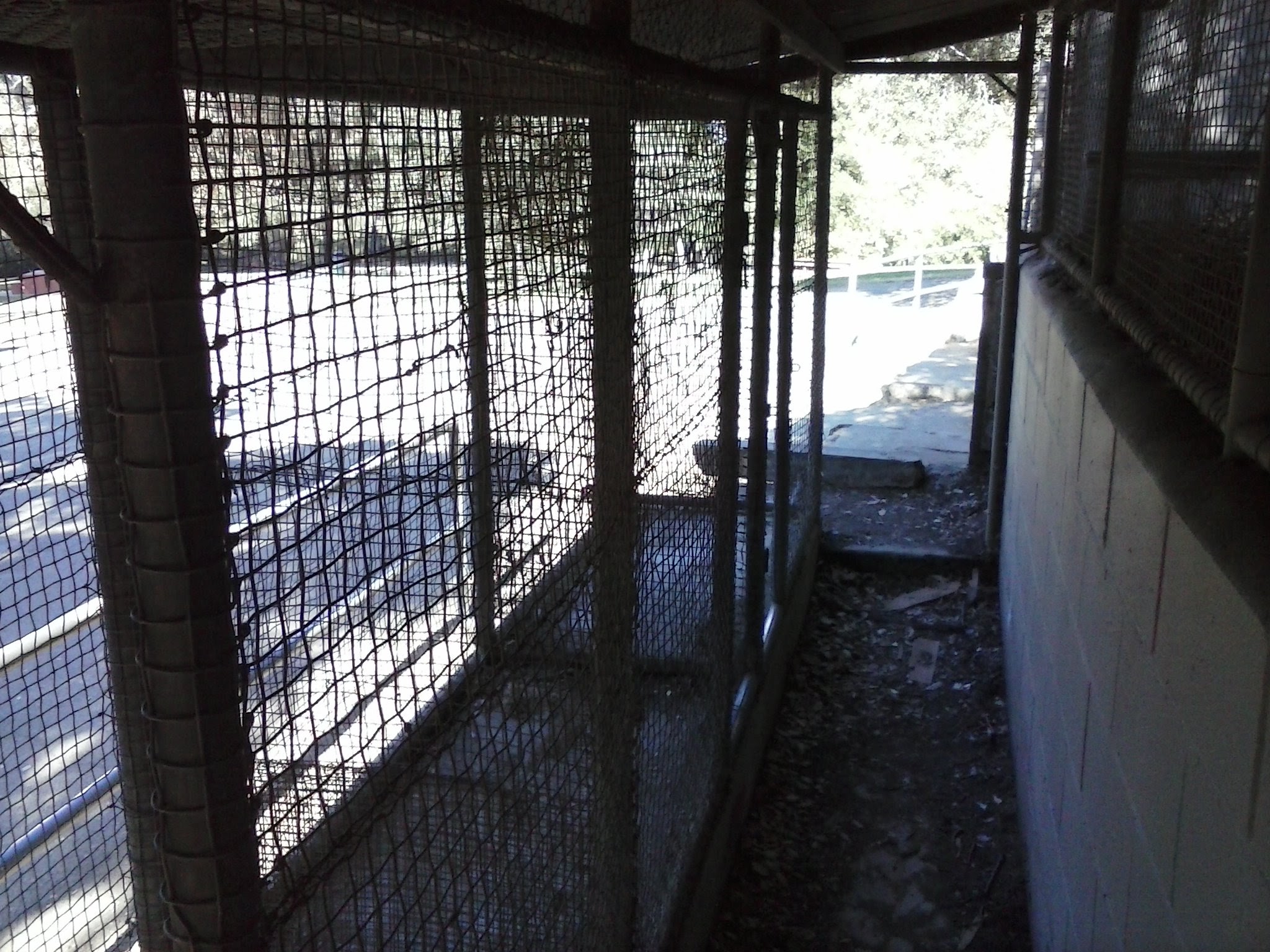 Following this are a set of wire mesh bird cages, which have a passageway behind them that allows you to enter the cages themselves, although there’s only just enough room to stand. Next to these is a simple cinder-block building, with the door usually blocked off, but with a beautiful illustration of a parrot that someone added above the door as a thoughtful reminder of the building’s former inhabitants.