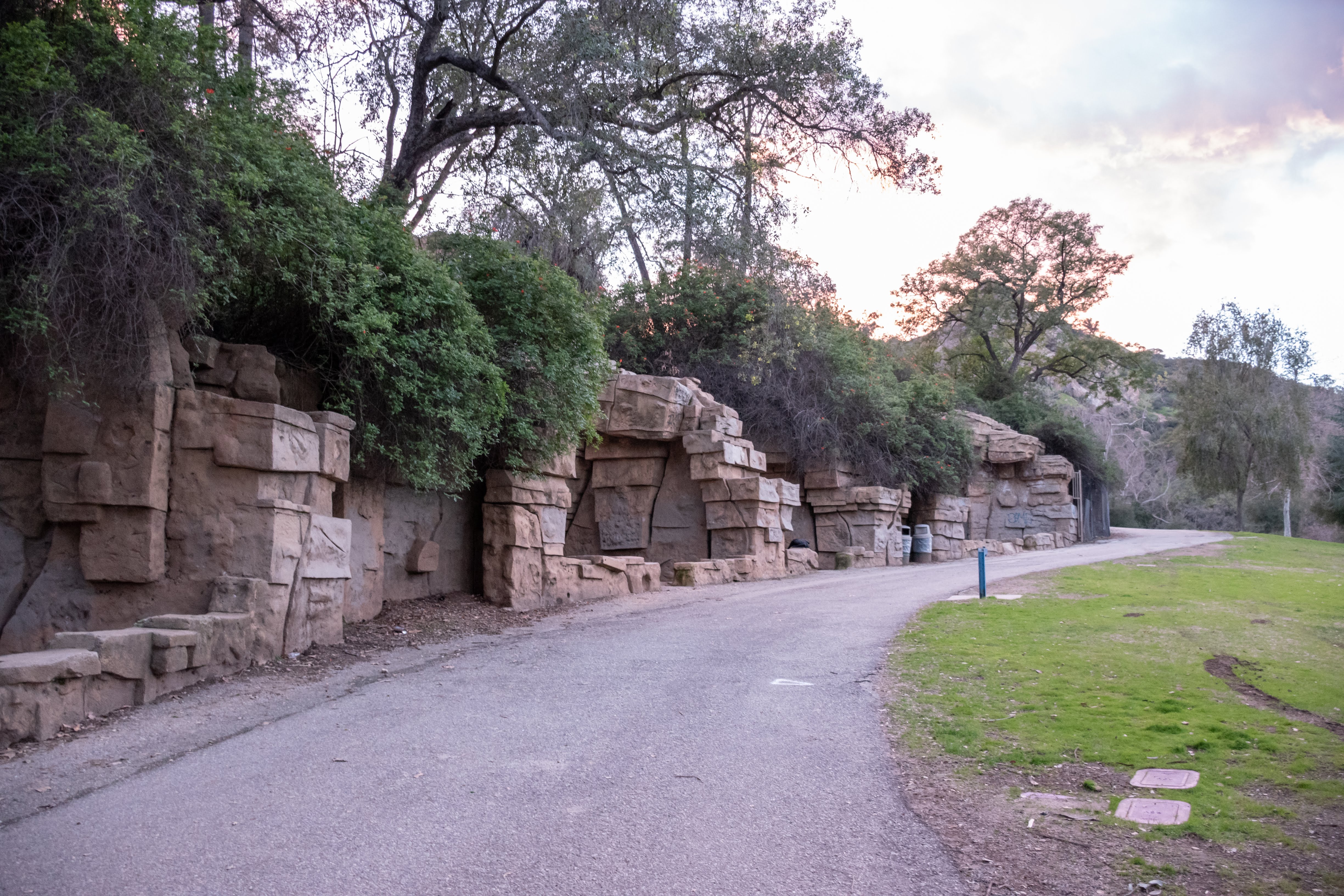 From Crystal Springs Drive, there are several possible approaches to the Old Zoo, but the most straightforward one is to just follow Griffith Park Drive towards the hills. Along the way you’ll pass the expansive lawns of the Park Center and Shane’s Inspiration, an all-inclusive playground designed for children with disabilities. Shortly after the playground, Griffith Park Drive will curve to the right; follow the road that branches to the left instead, which will be lined with parking spots facing a grassy picnic area. From the parking lot you can either take the paved path that curves up into the trees on your left, or keep following the road uphill, past the turnaround and the gate that prevents cars from continuing further. A little ways up the road, it will fork; take the left path, which will curve through a grove of trees into the grounds of the Old Zoo.