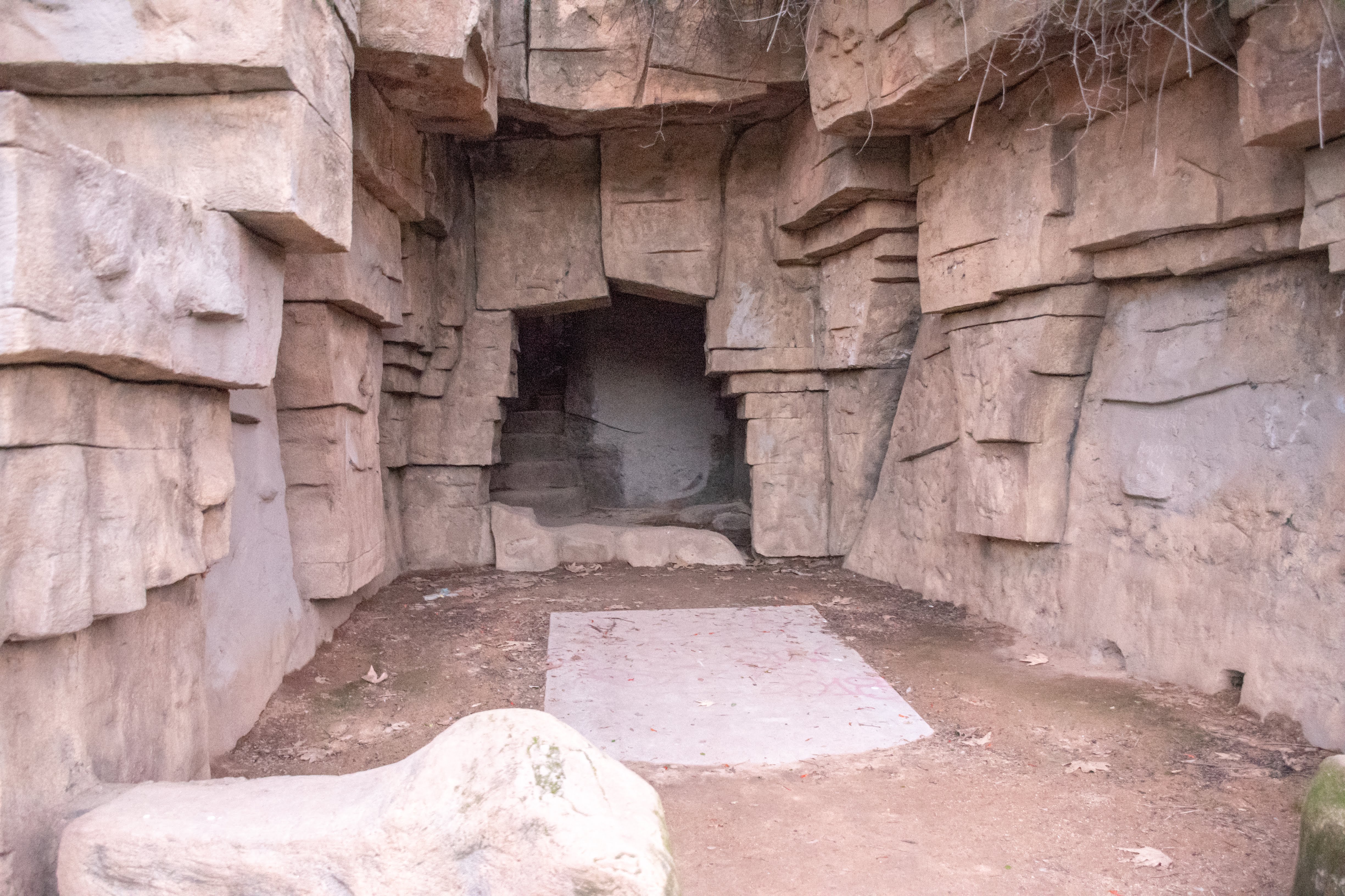 The grottoes are surreal, looking like blocky set constructions from a sci-fi film. They actually have been used in a bunch of movies, either simulating a still-functioning zoo or a natural cave (my personal favorite example being an utterly unconvincing Bigfoot den in the bizarre ’80s flick Cry Wilderness, skewered by Mystery Science Theater 3000). The bars that would have separated the animals from the zoogoers have been removed, allowing you to walk into the enclosures. Some of them have picnic tables set up in them now, and you can poke around the back and look up through locked gates into the steep passageways that zookeepers would have used to access the enclosures. Most of these are filled with trash and debris now.
