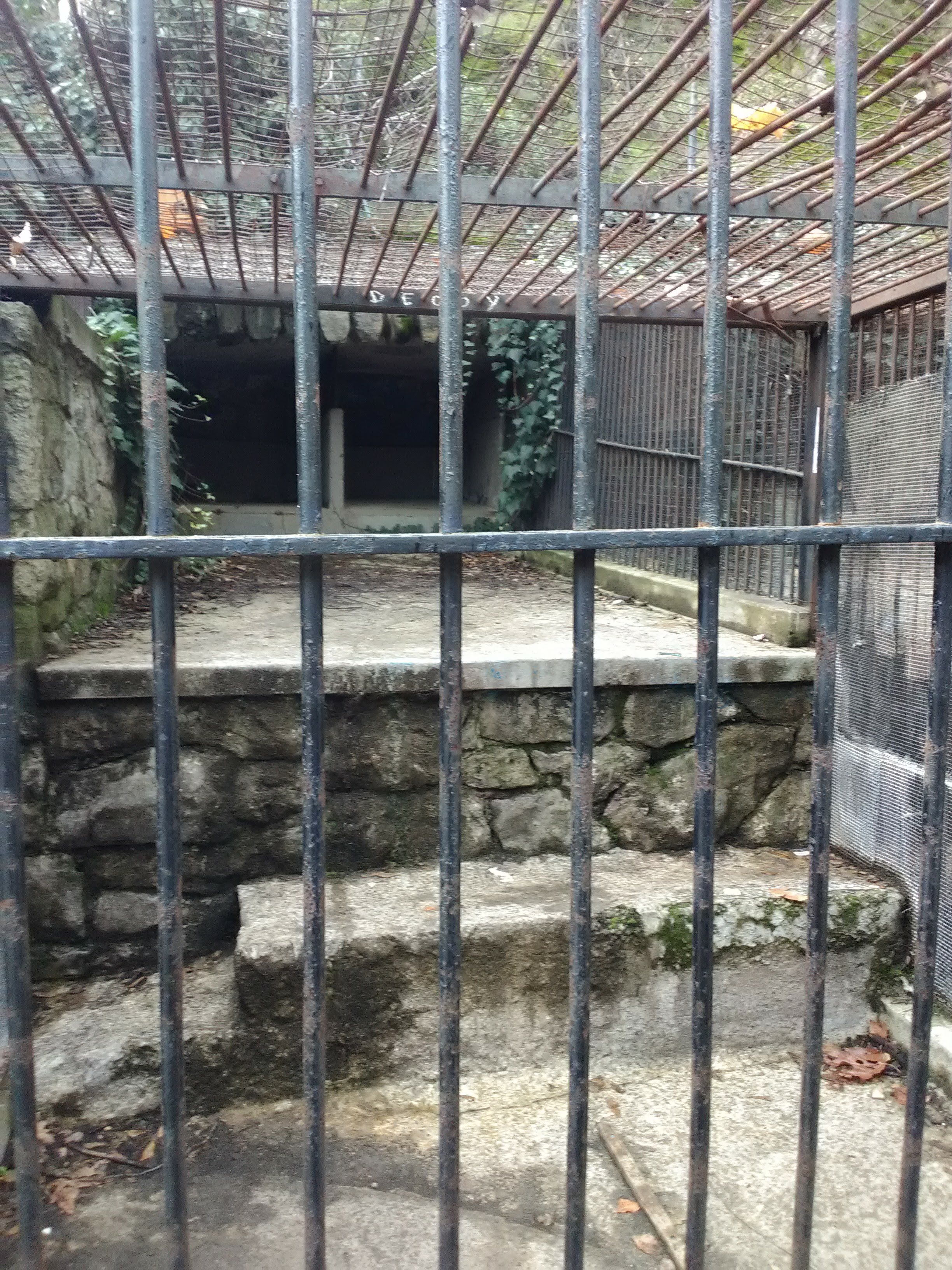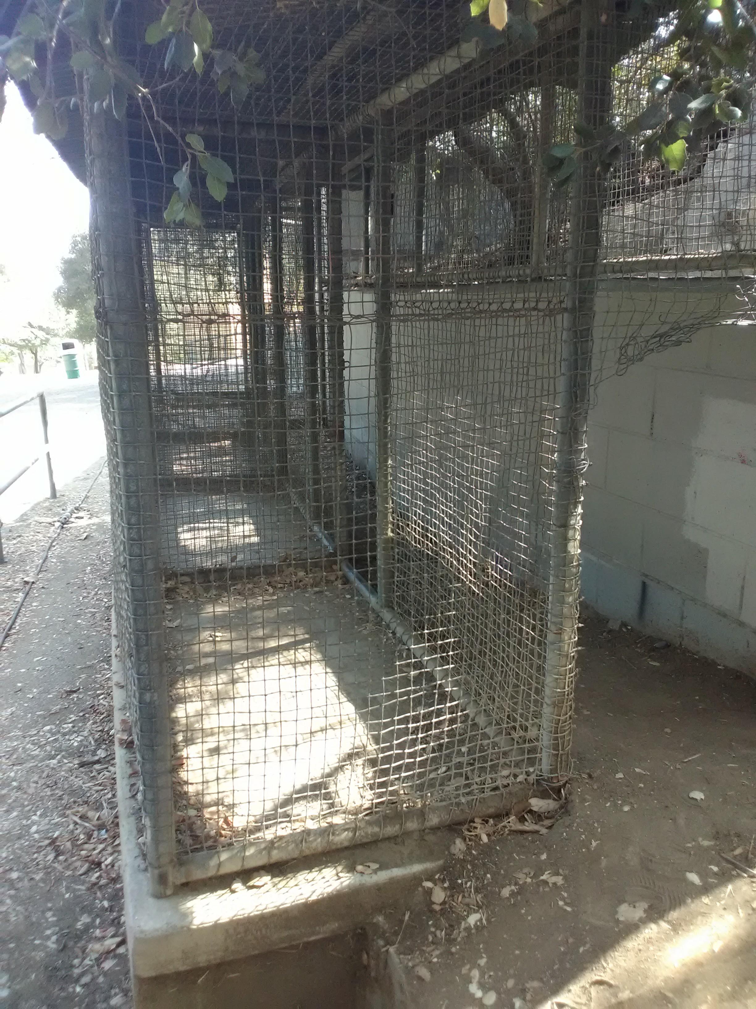 As you walk uphill, some pieces of decayed infrastructure will be the first signs of the former zoo: blank foundations, chain-link fences, and low cement posts dot the hillsides of the zoo grounds. After you cross a dry creek bed lined with stones, you’ll enter the main part of the Old Zoo, with a grassy lawn on one side and your first set of cages lining the path just ahead.