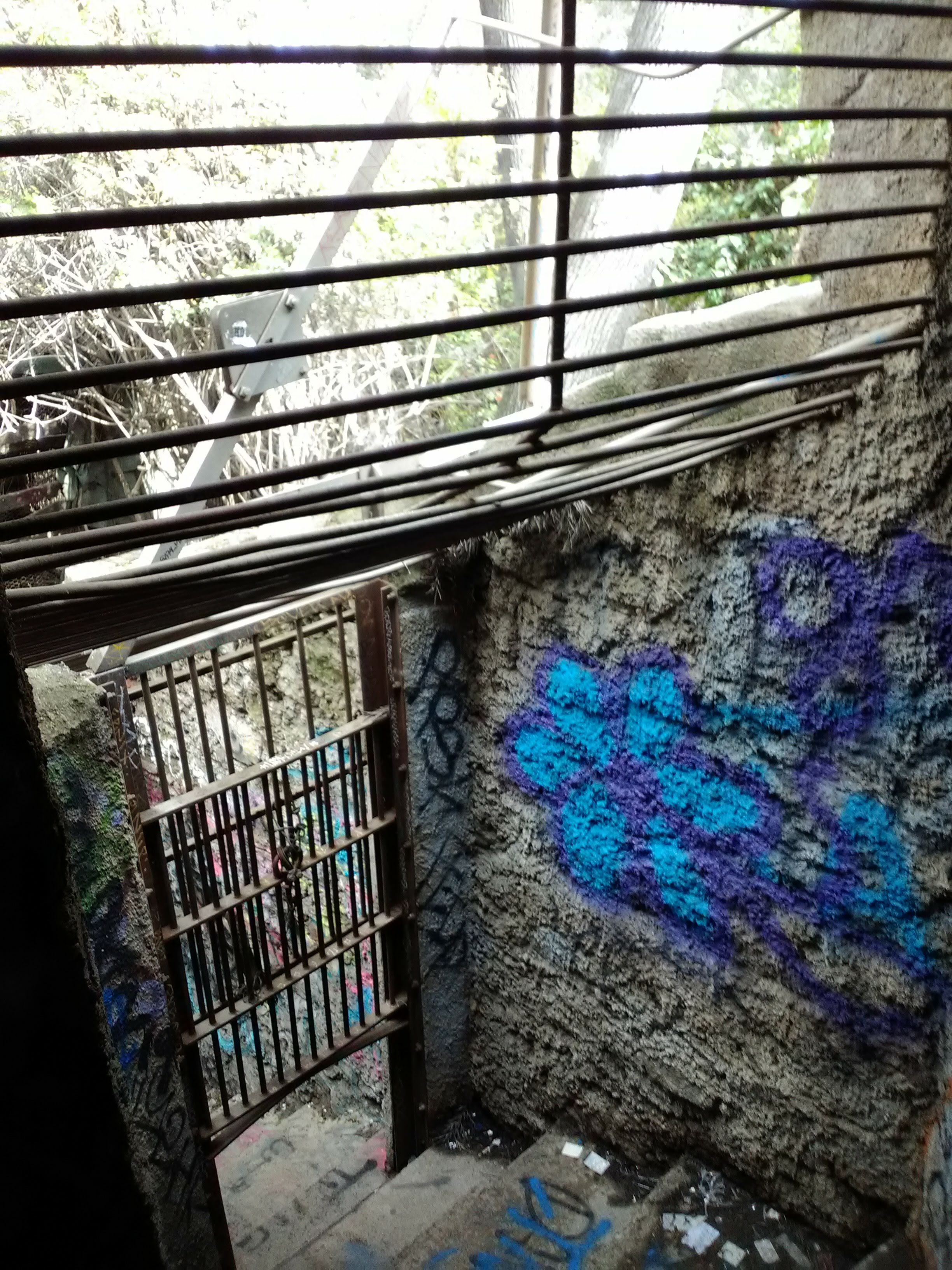 If you circle back and take the uphill path behind the grottoes, you can access the last set of cages. This path was obviously meant for staff only, given that it serves the back of the zoo exhibits. The grottoes are fenced off from the back to keep people from scrambling on top, but you can peek through the windows and doorways to see the remains inside. After the last door, you’ll pass by the foundations of a shed that existed as recently as 2017, when I first visited the Old Zoo. On that day, it was covered in graffiti and some kids were filming a music video inside. Now it’s gone, leaving nothing but a few inconspicuous foundations. But a great view of the Glendale skyline remains.