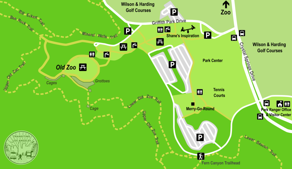 The Old Zoo sits in Spring Canyon on the east side of the park, near the visitor center and the historic merry-go-round. Although it’s tucked out of sight from any road, it’s an easy ten-minute walk from the nearest bus stop at Griffith Park Drive/Crystal Springs Drive. This stop is served by the Metro #296 bus, which runs about once an hour between Burbank and the Lincoln/Cypress station on the A Line (if you’re going south, it’s the first stop after the zoo, and if you’re going north, it’s the first stop after the park ranger office).