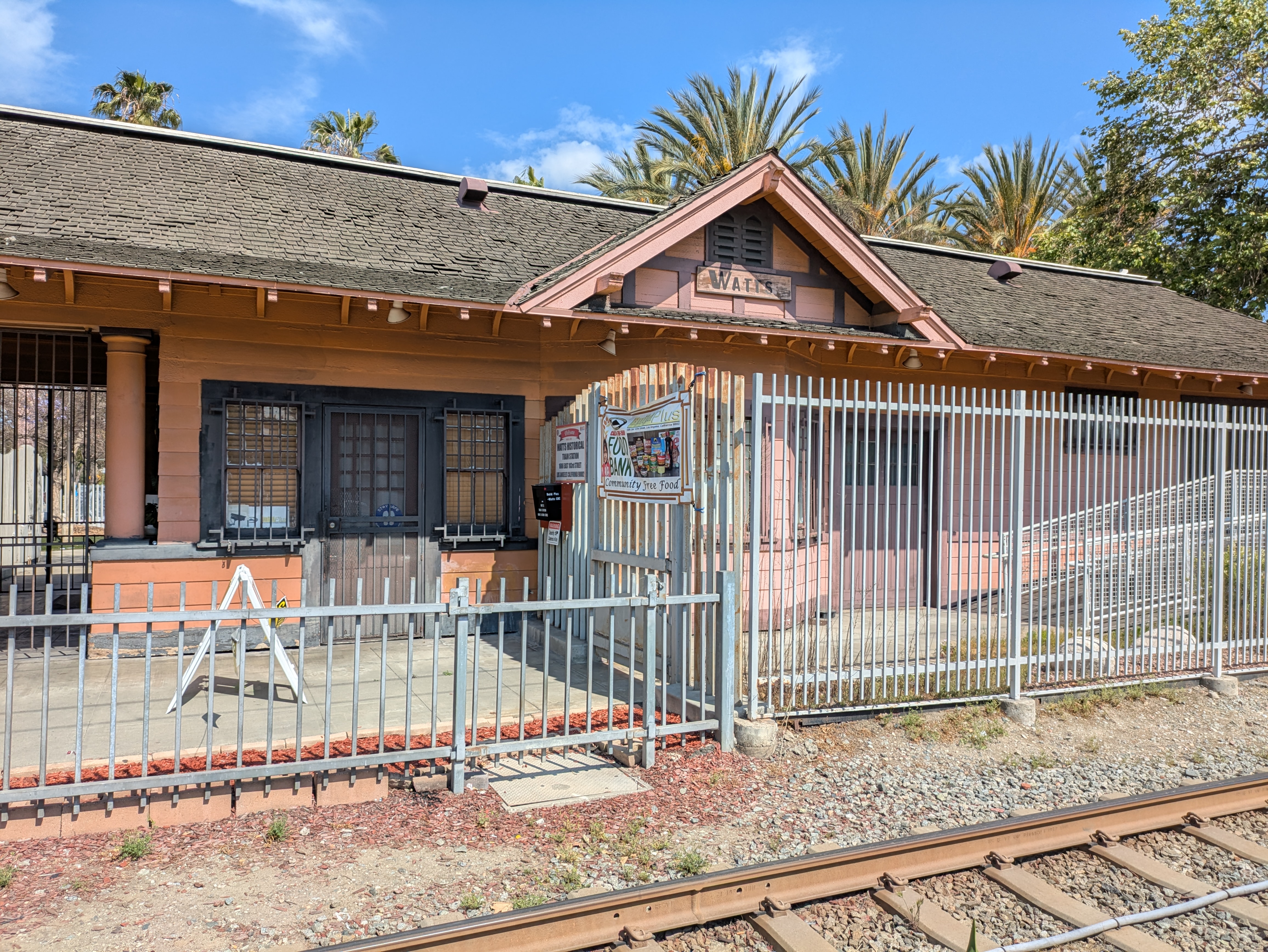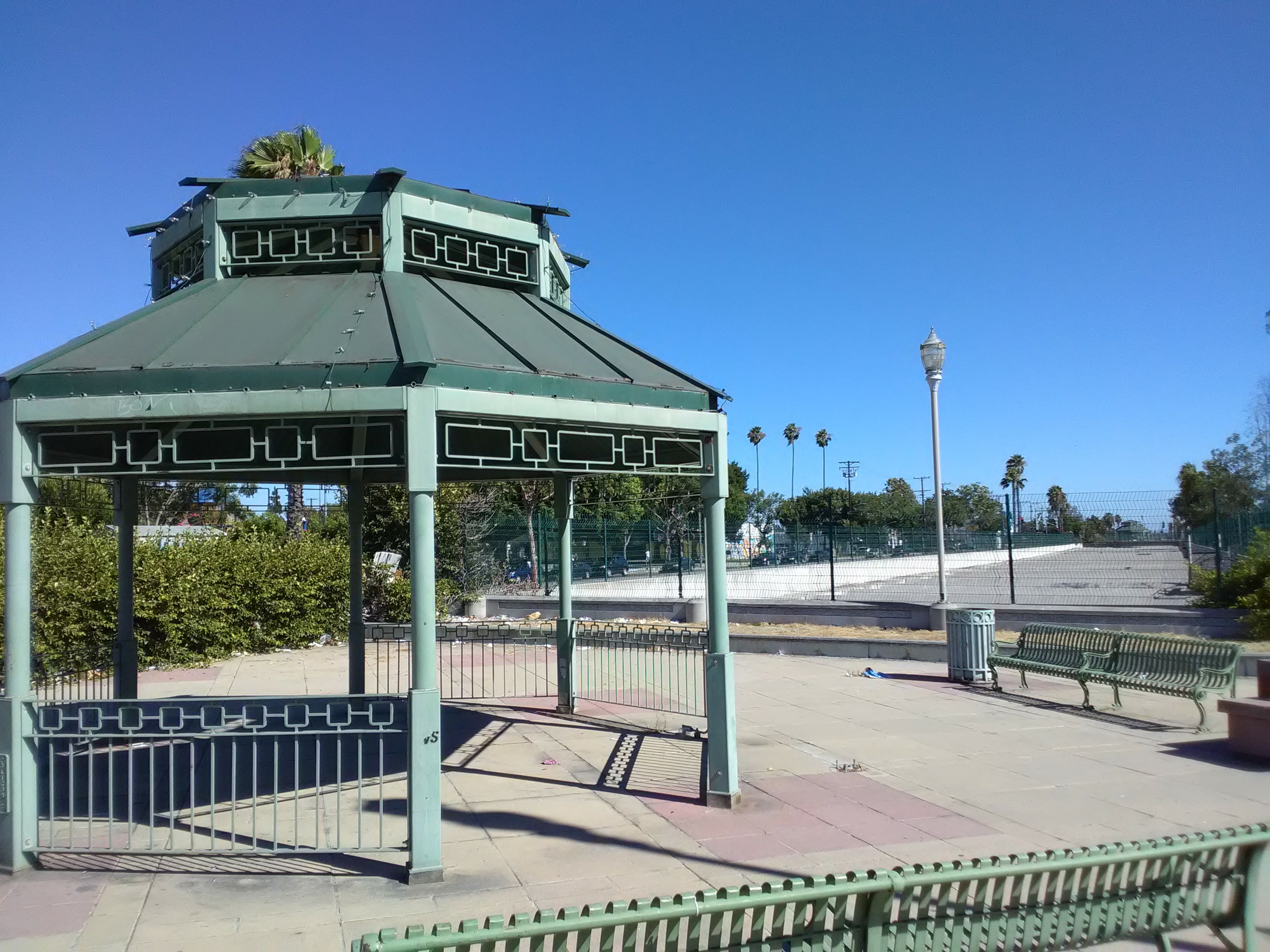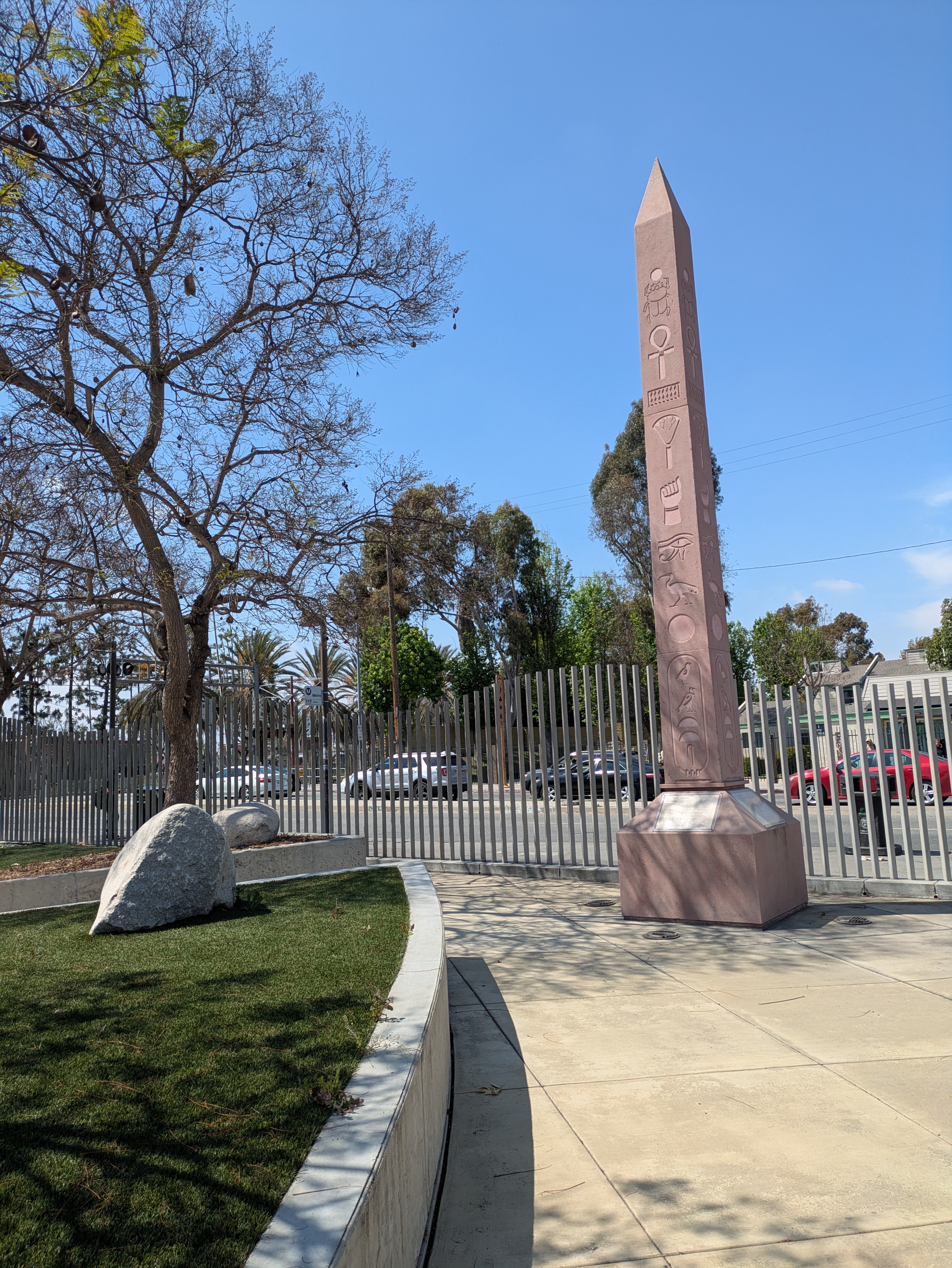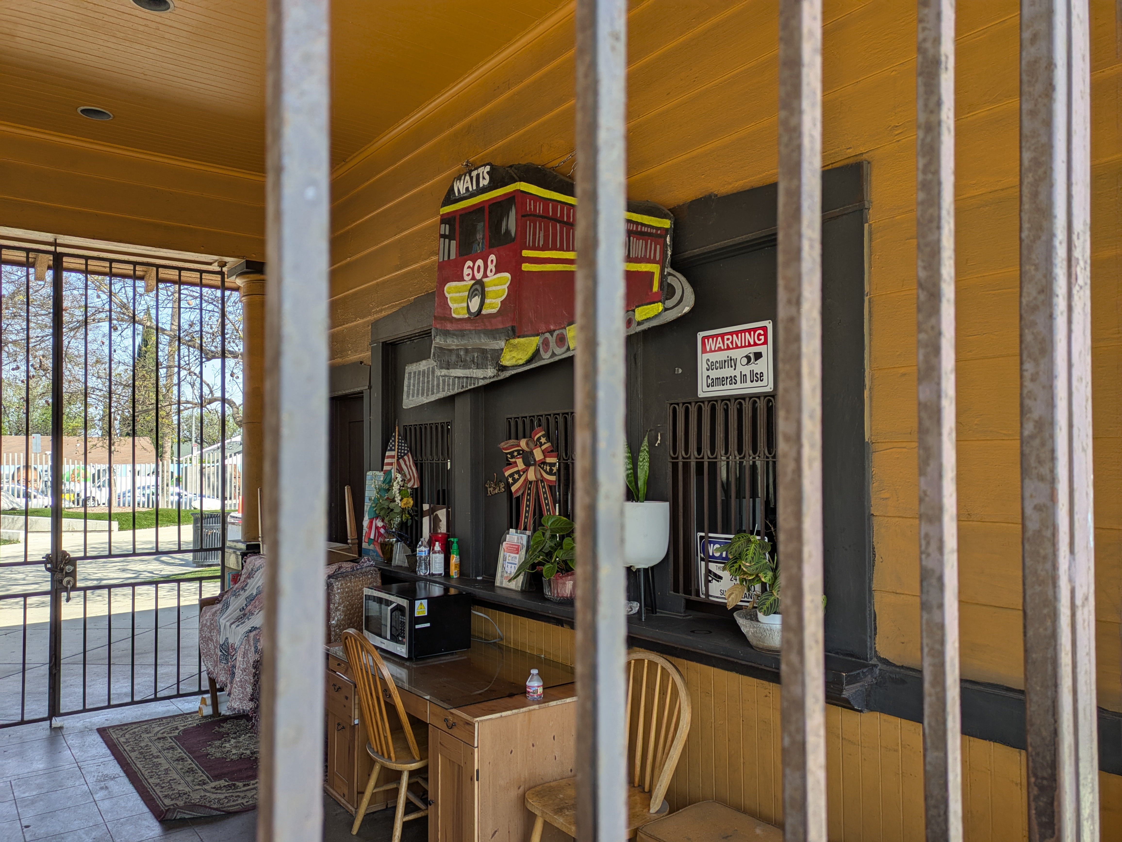 Adjacent to the platform itself is the old Watts Station, a cute orange building that served as the neighborhood’s Pacific Electric streetcar station and is the oldest building still standing in Watts. Today it serves as a customer service center for the Department of Water and Power, and a couple vendors are usually set up in the open space facing the sidewalk. Bizarrely, there’s a perfectly nice plaza next to the station that is fenced off behind heavy metal bars and seemingly always locked. A pyramid sits in the middle of the plaza, while an obelisk stands just out of reach, with “WATTS” spelled out in Egyptian hieroglyphics.