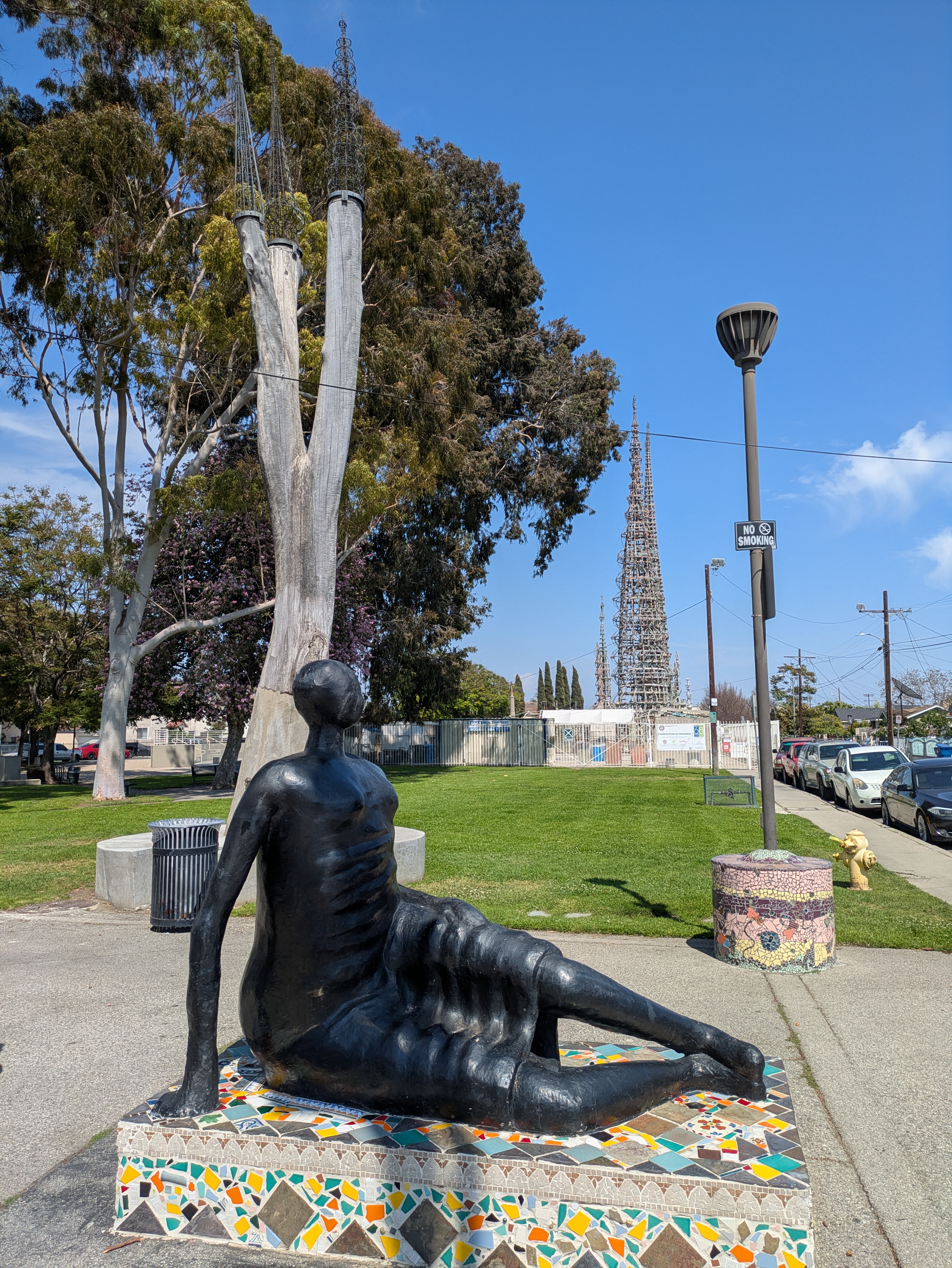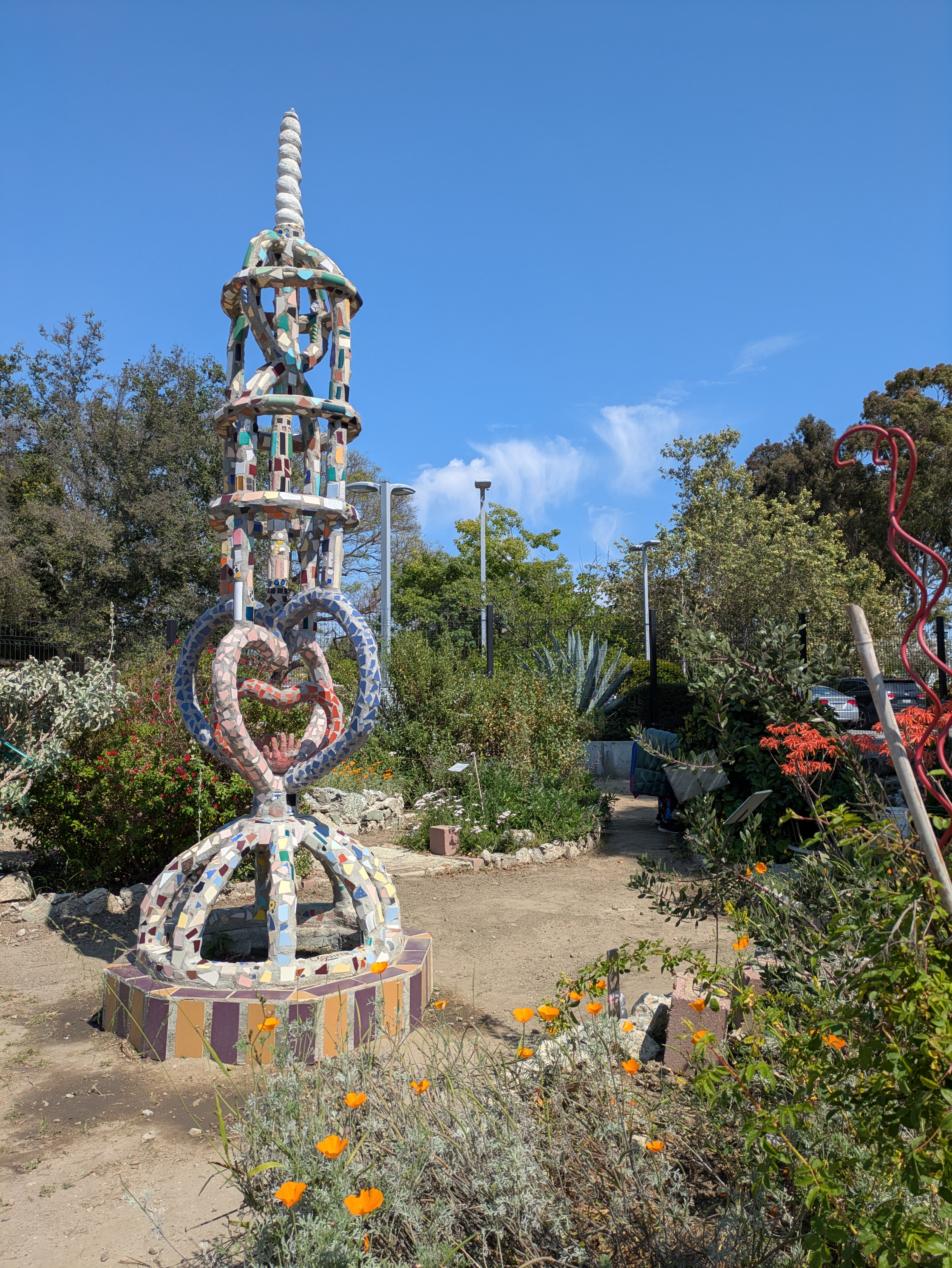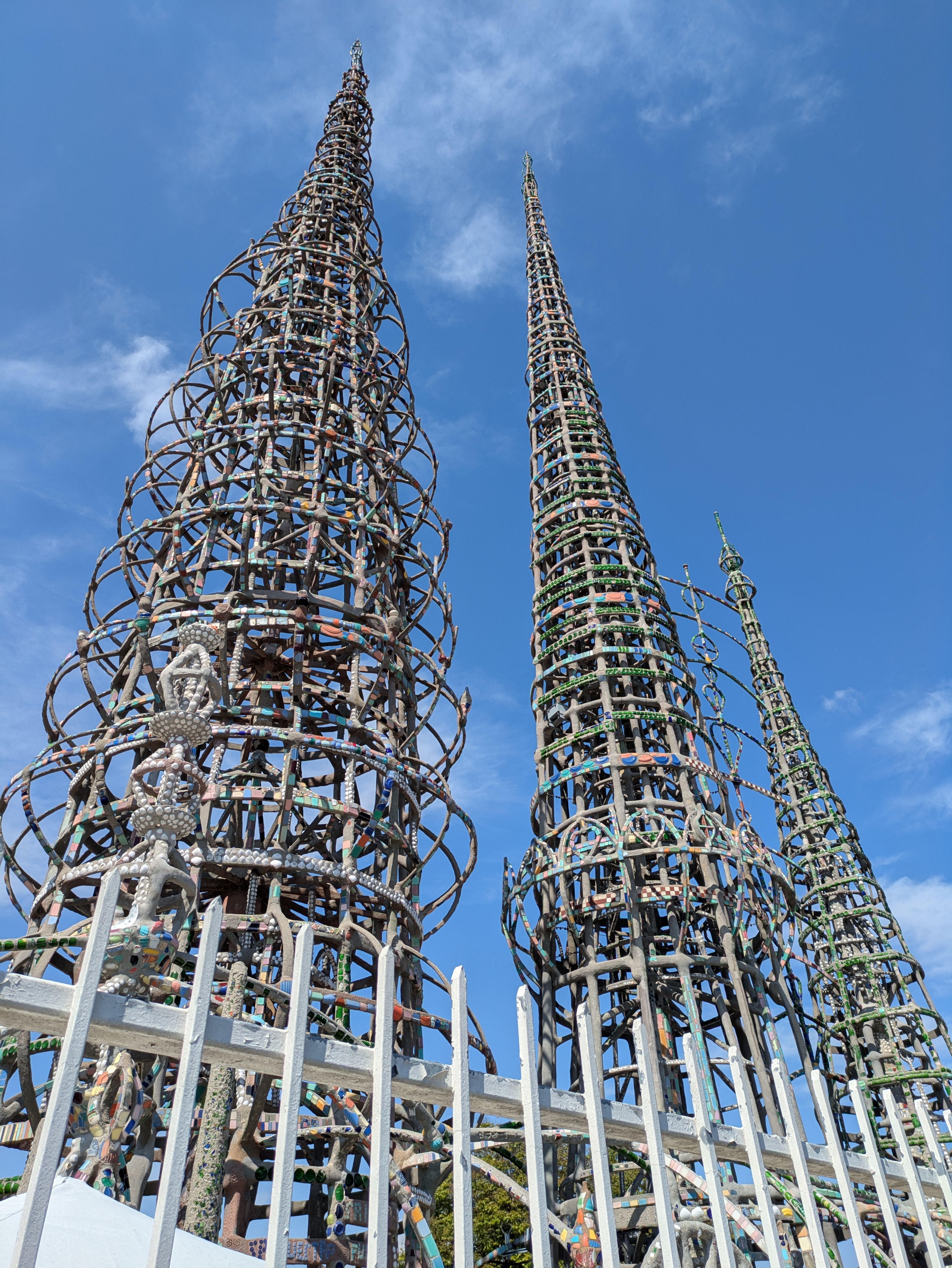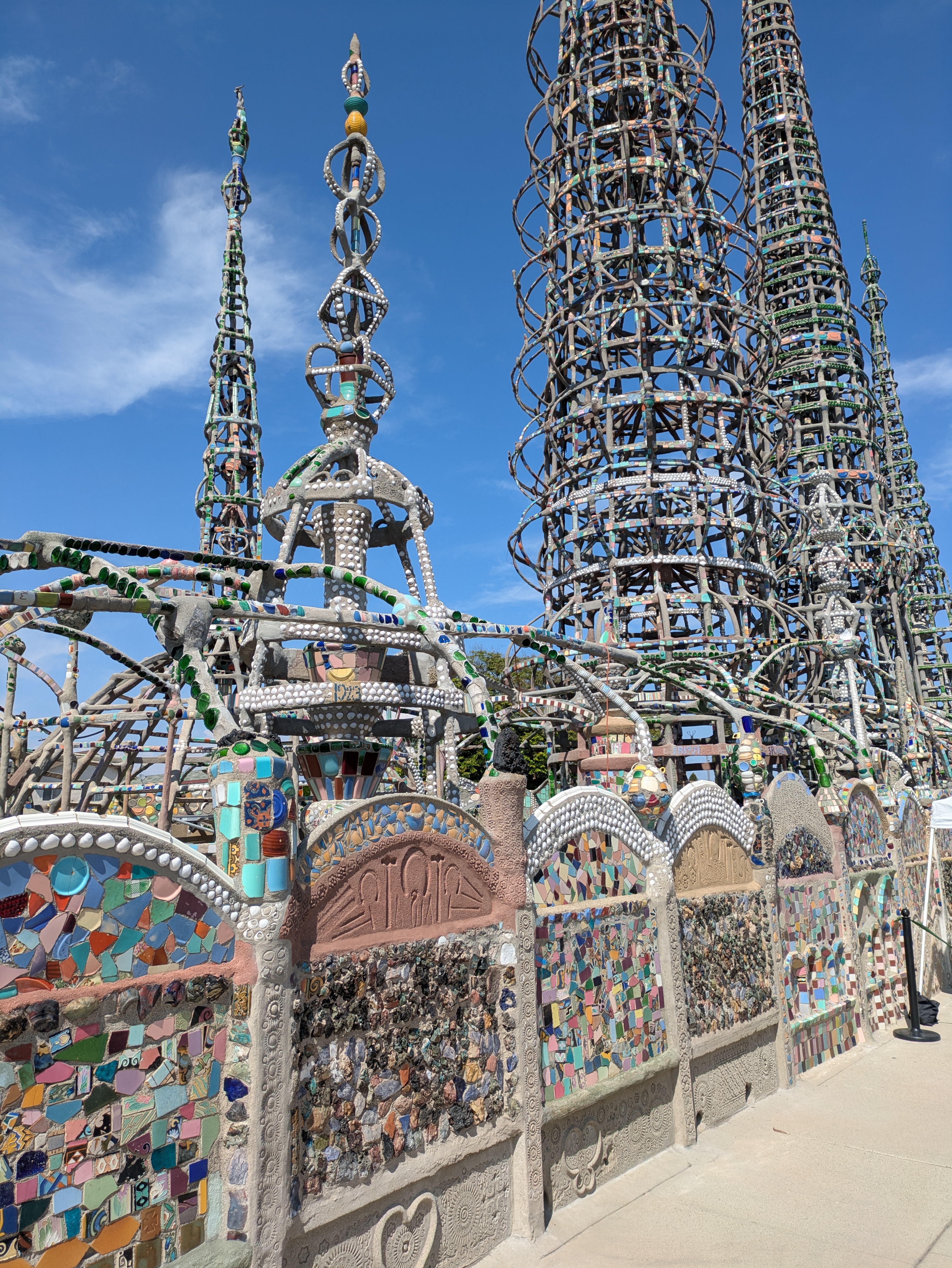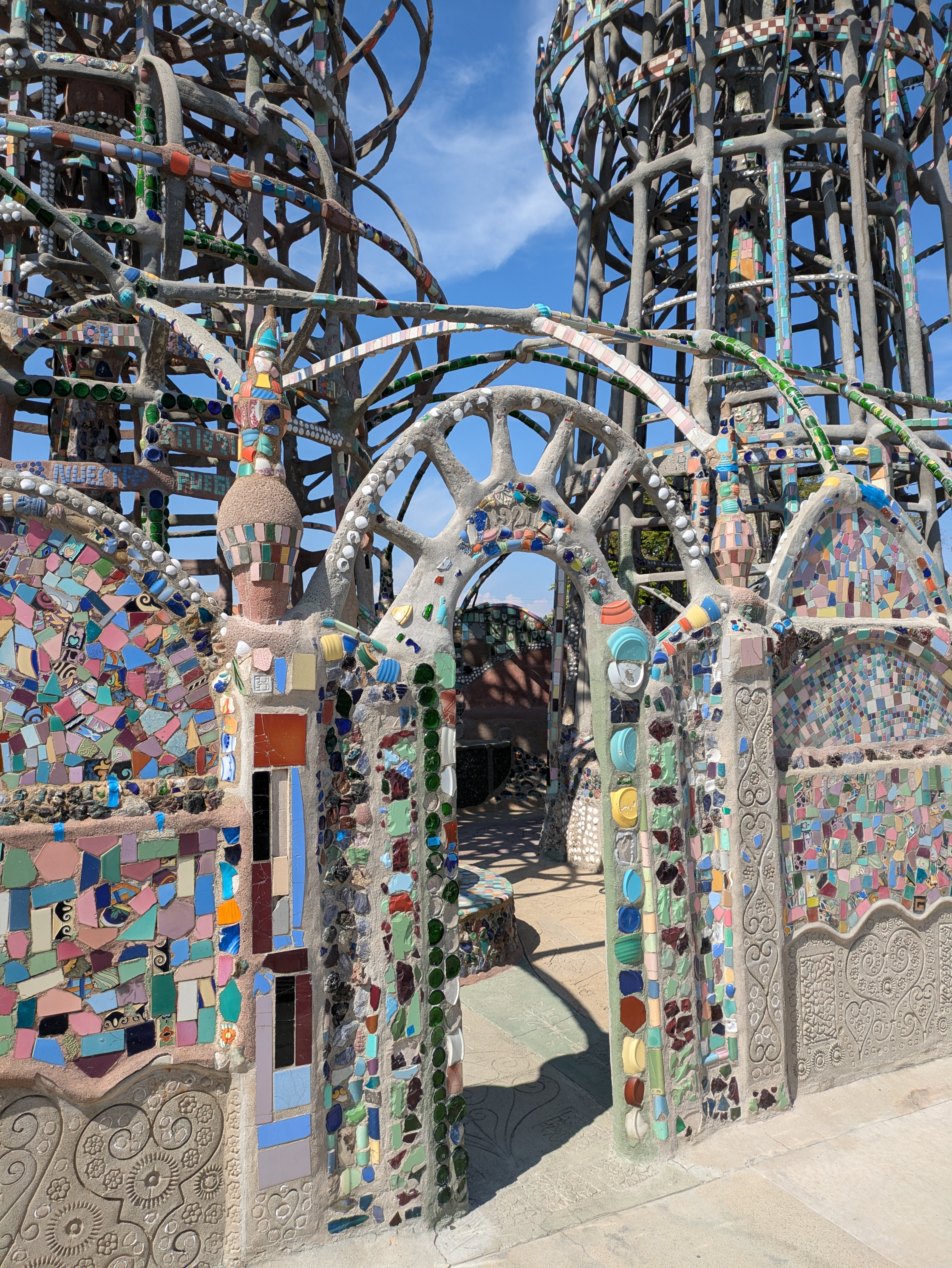 From the front door, you can see the towers themselves, which sit in a small, fenced-off enclosure in the very back of the park. You can only enter the towers on one of the guided tours led by the arts center. Despite the fence, you can still get pretty close to the towers and admire their finer details, like the adobe walls surrounding the base and the colorful mosaics that adorn them. In the sunlight, the towers glimmer from all the tile and glass embedded within its structure.