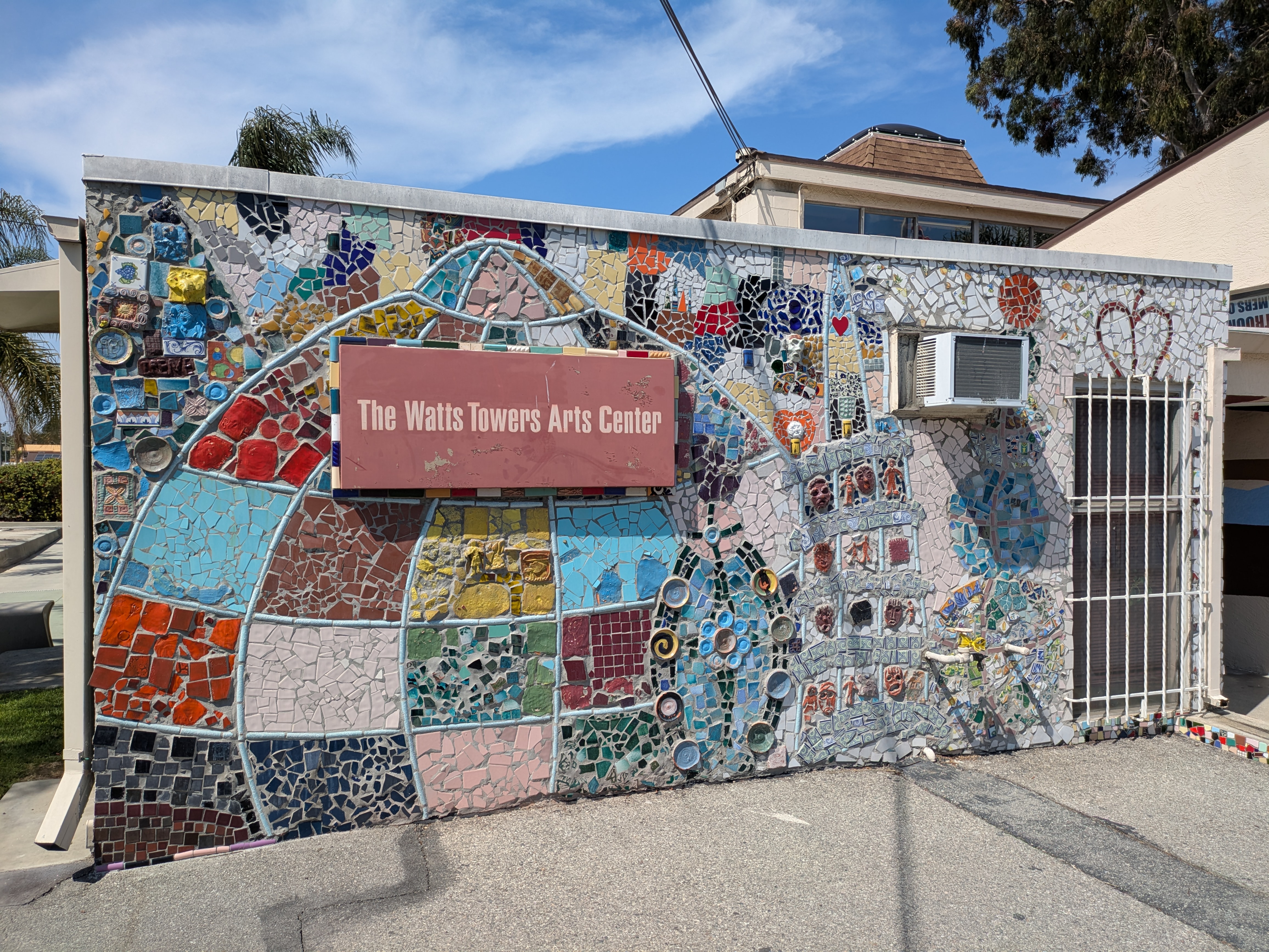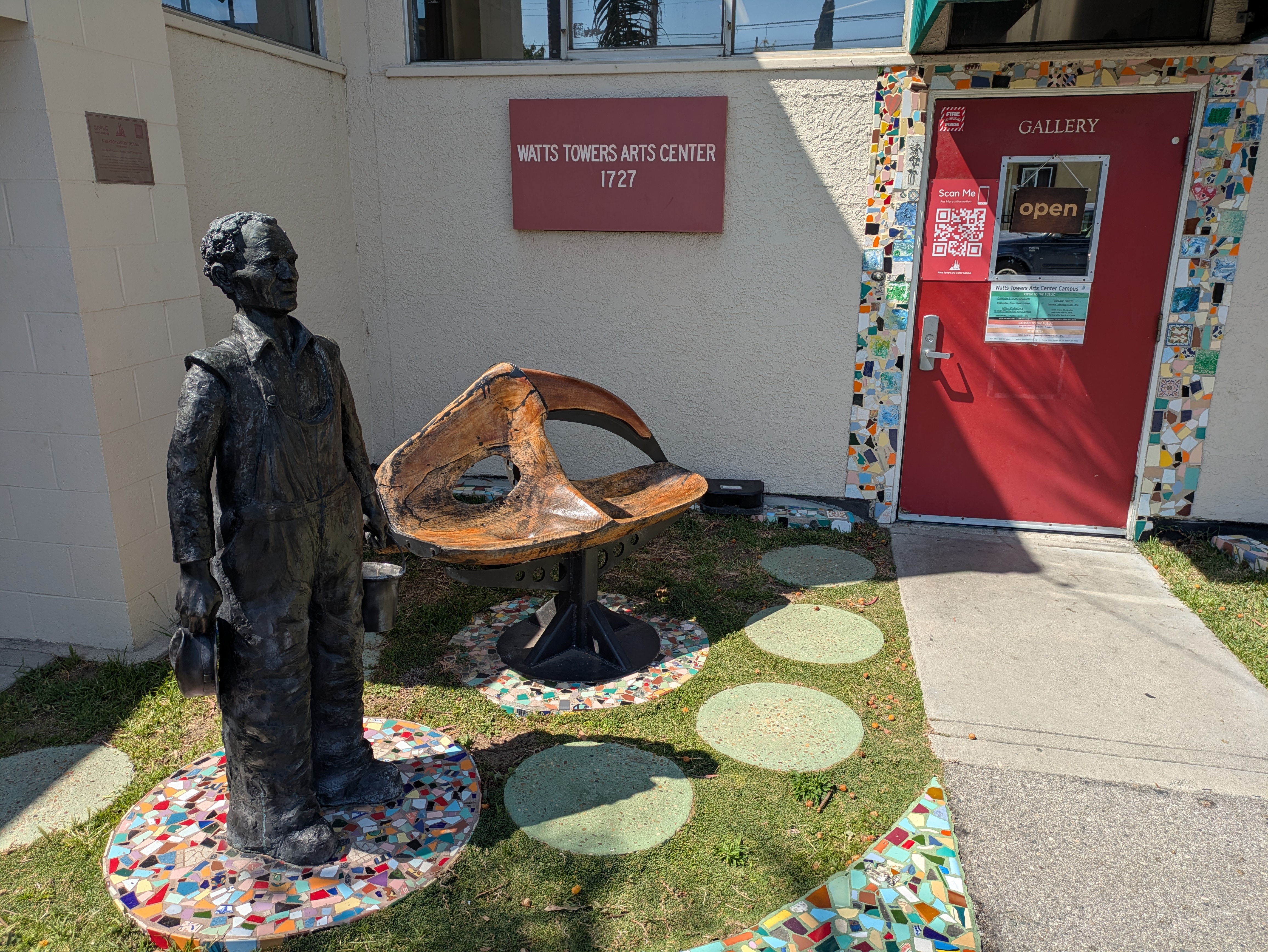 The older building, the Watts Towers Arts Center, is the primary visitor center for the complex. The arts center is open Wednesdays through Saturdays 10am-4pm, closing for a lunch break from 12:30-1:30. Next to the front door is a short statue of Simon Rodia, the creator of the towers. Behind its tile-adorned walls, the center has another large changing exhibit gallery as well as a smaller gallery of musical instruments, where a film about the history of the towers plays. At the front desk is a small gift shop, which is where you can purchase a spot on a guided tour of the towers, which are only offered on Thursdays, Fridays, and Saturdays (and they only accept cash or checks).