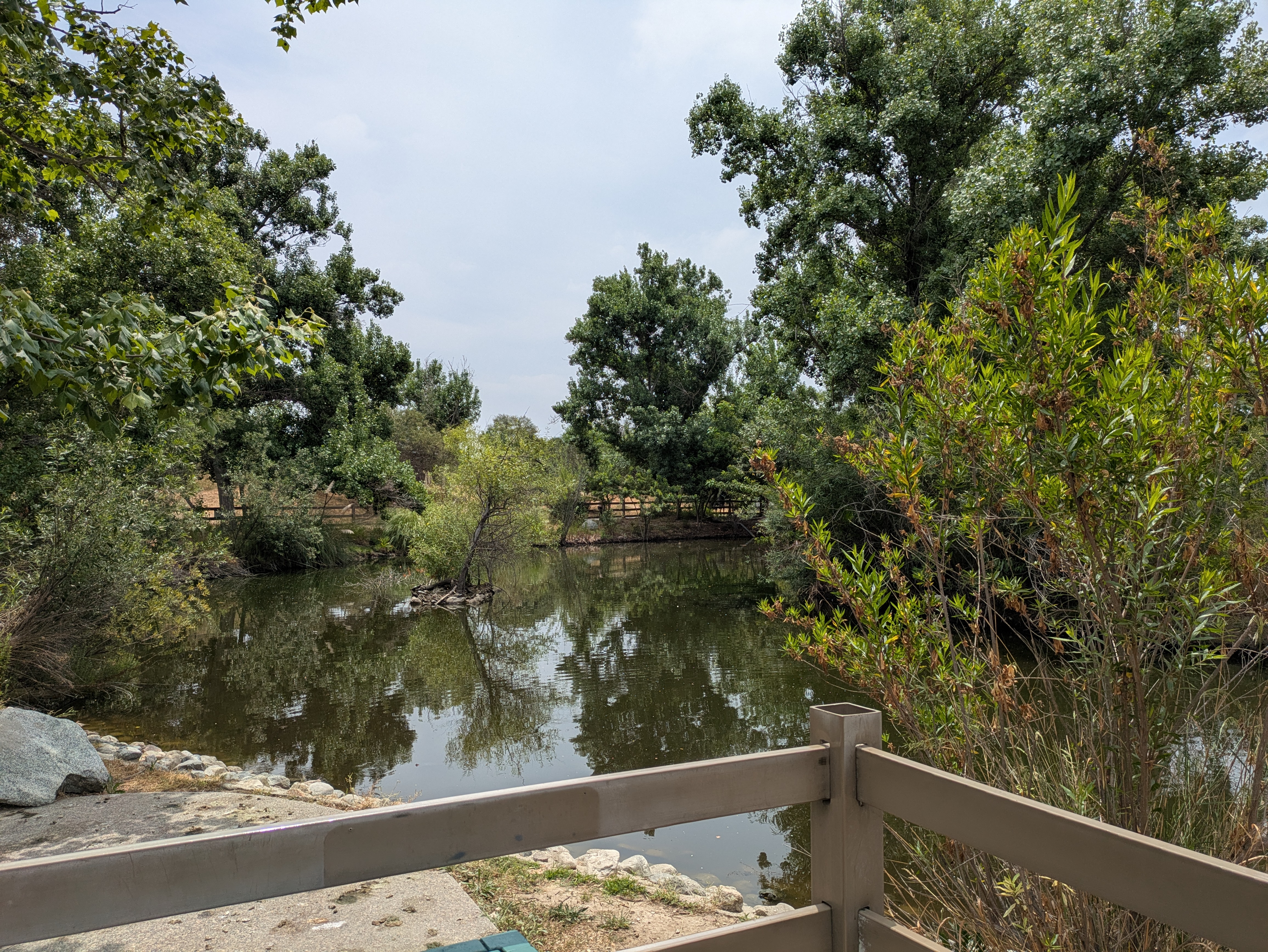 The park itself has a very simple layout. Past the nature center is a big lawn at the center. From here, a paved trail loops around a large nature pond filled with ducks and turtles, and past some hillier features along the edges of the park. In one area, a spiral-shaped trail rings up a small hill, with a little view of the park from the top. In another, water cascades down a picturesque, stone-lined fountain, pumped to the surface by a little windmill. A thick grove of trees encircles the park, offering serenity in the midst of the urban landscape.