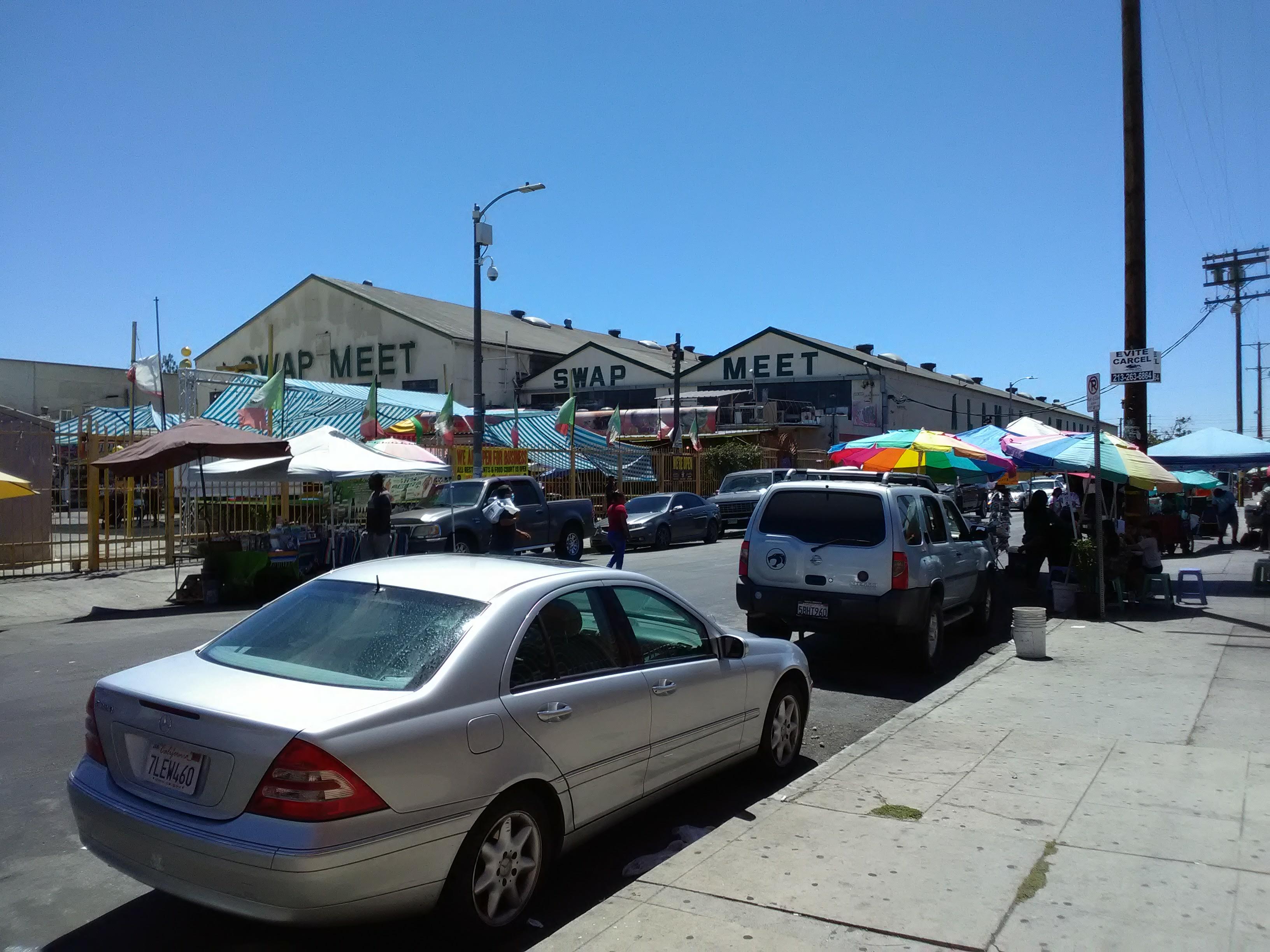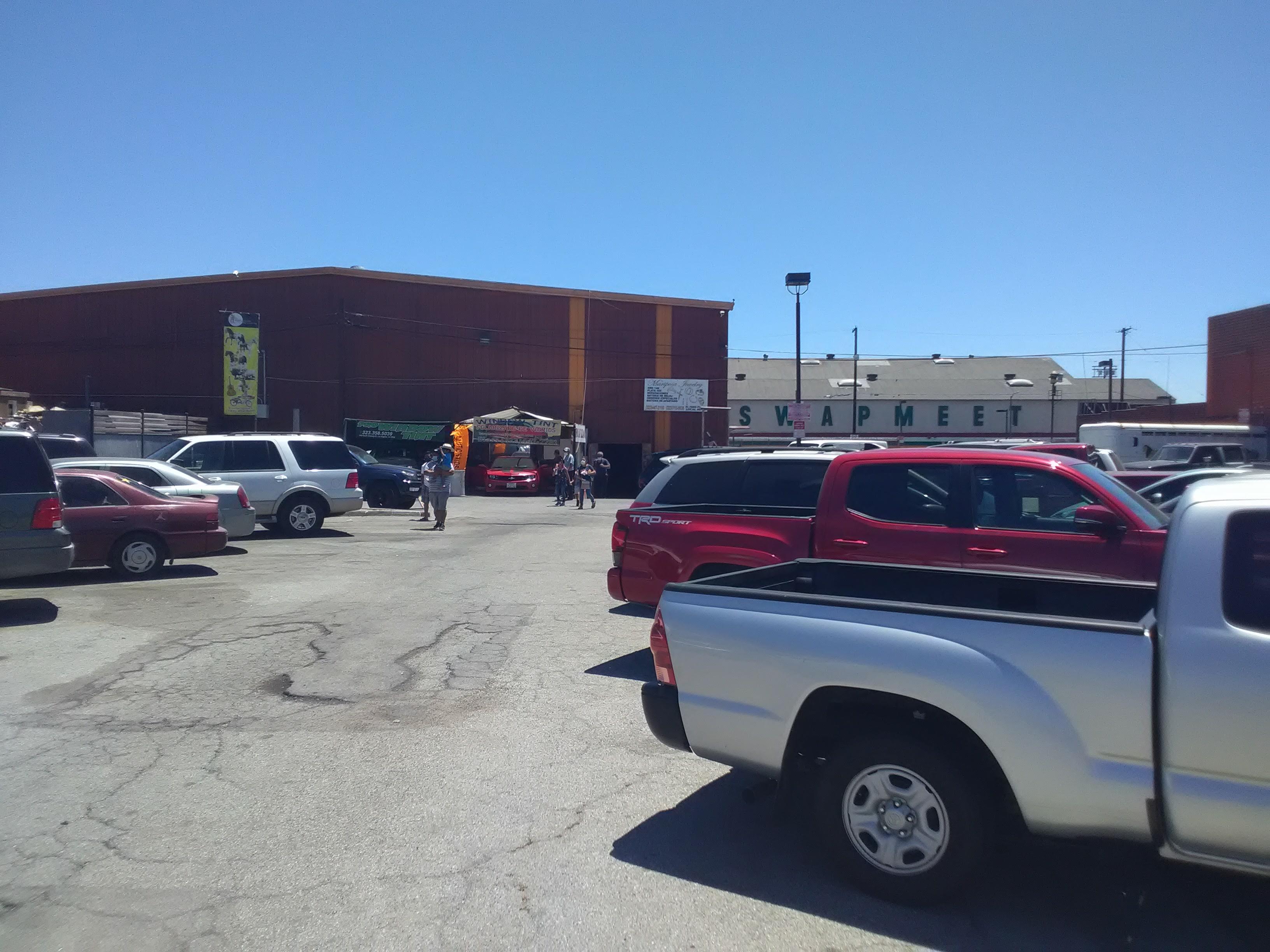 The Alameda Swap Meet sits just a couple of blocks from Vernon station, poking out above the surrounding stores and houses. As you exit the platform, make a right and walk down Vernon Avenue. The sidewalk is a tight one, wedged between busy traffic on the street and fenced-off lots on the other, although there are a couple of nice tall trees where produce stands have set up in the shade. After a couple of blocks, you’ll come across the orange warehouse of El Faro Plaza, behind the orange gating surrounding the busy parking lot. The Alameda Swap Meet sits just beyond to the south.