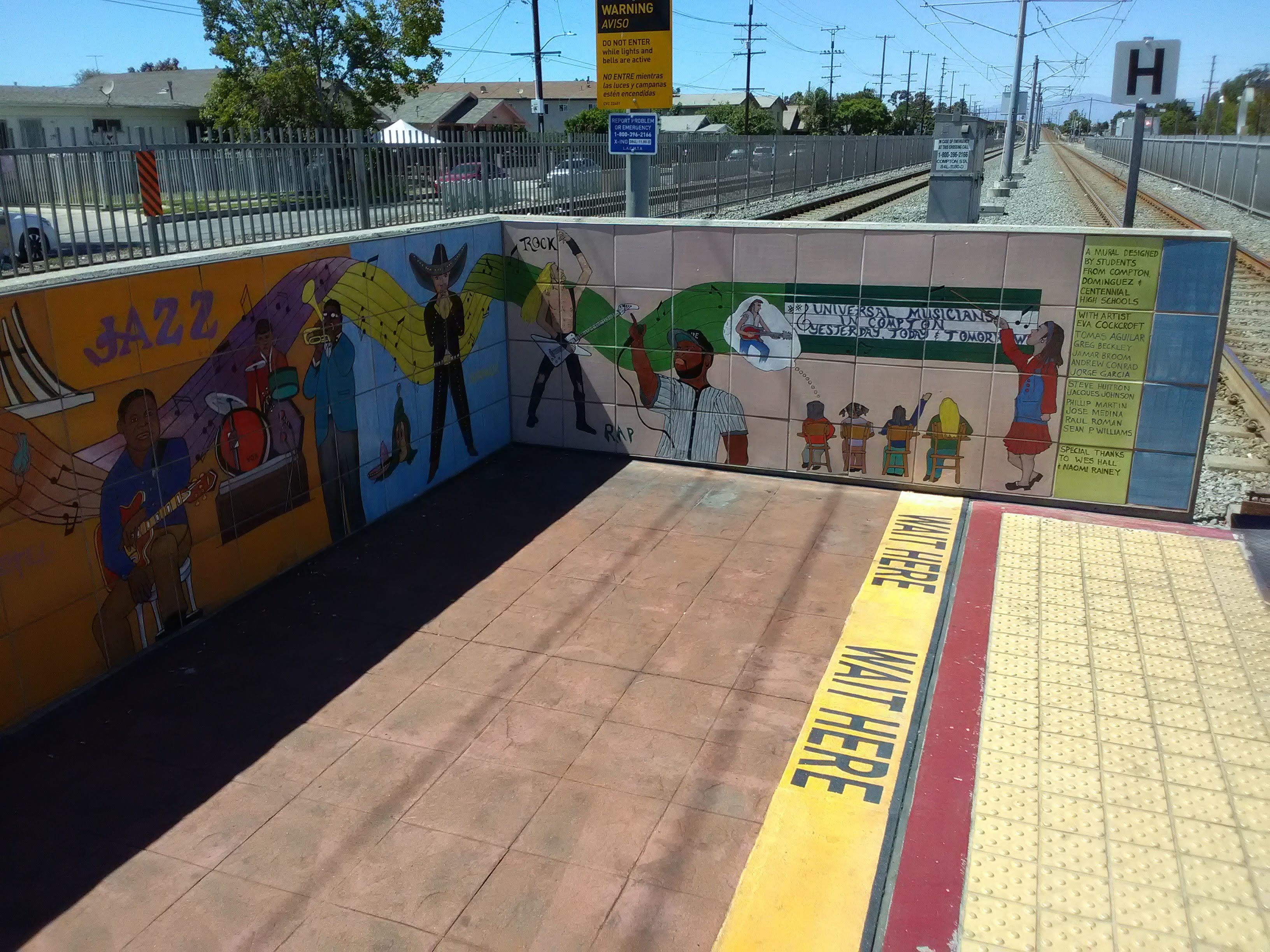 In addition to the King memorial, the civic center also has murals paying tribute to King, Cesar Chavez, Rosa Parks, and a large mural of Barack Obama on city hall facing the train tracks. Compton wears its identity as a Black community heavily on its sleeve, though in recent years Latinos have become the majority, as is the case with much of South LA. My favorite civic tribute is a mural designed by local schoolchildren sitting at the entrance to the Metro station, which depicts some of the famous musicians who have called Compton home.