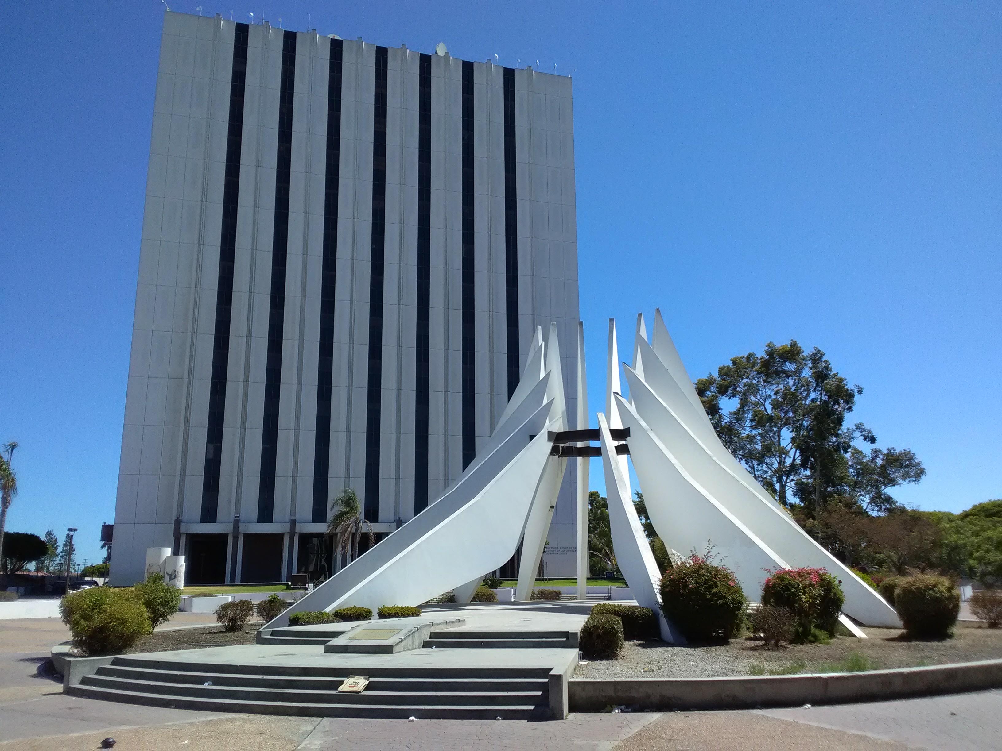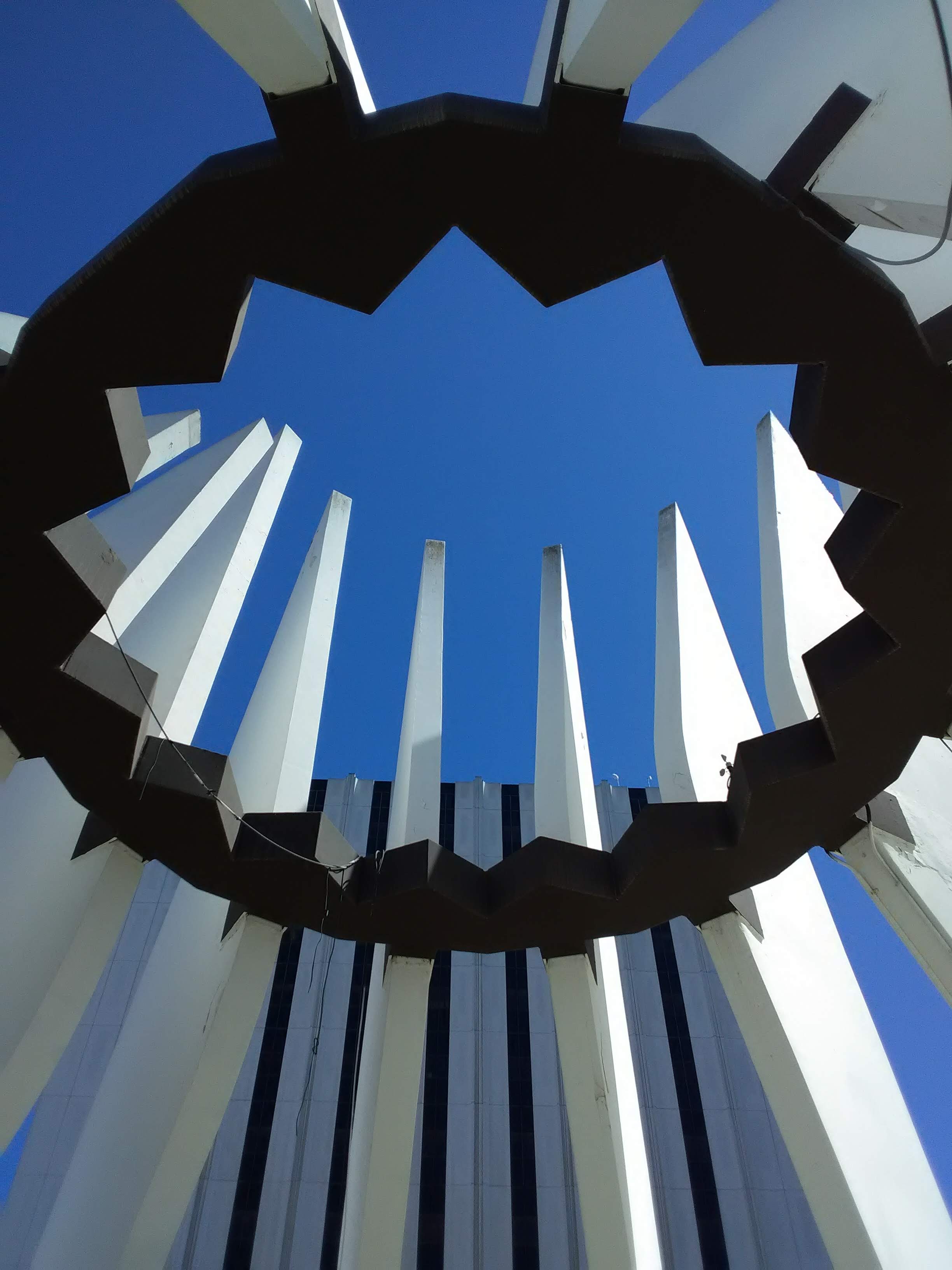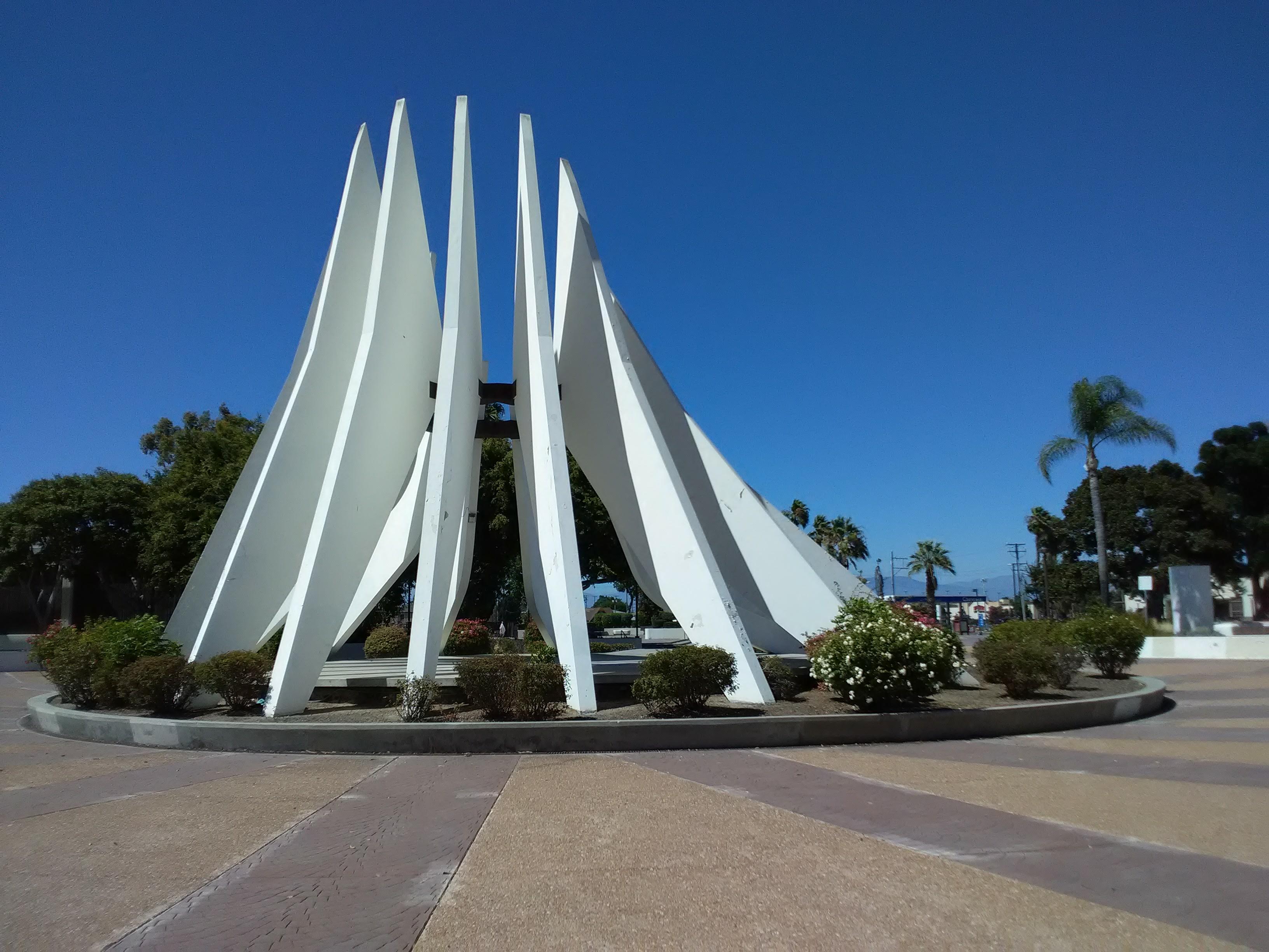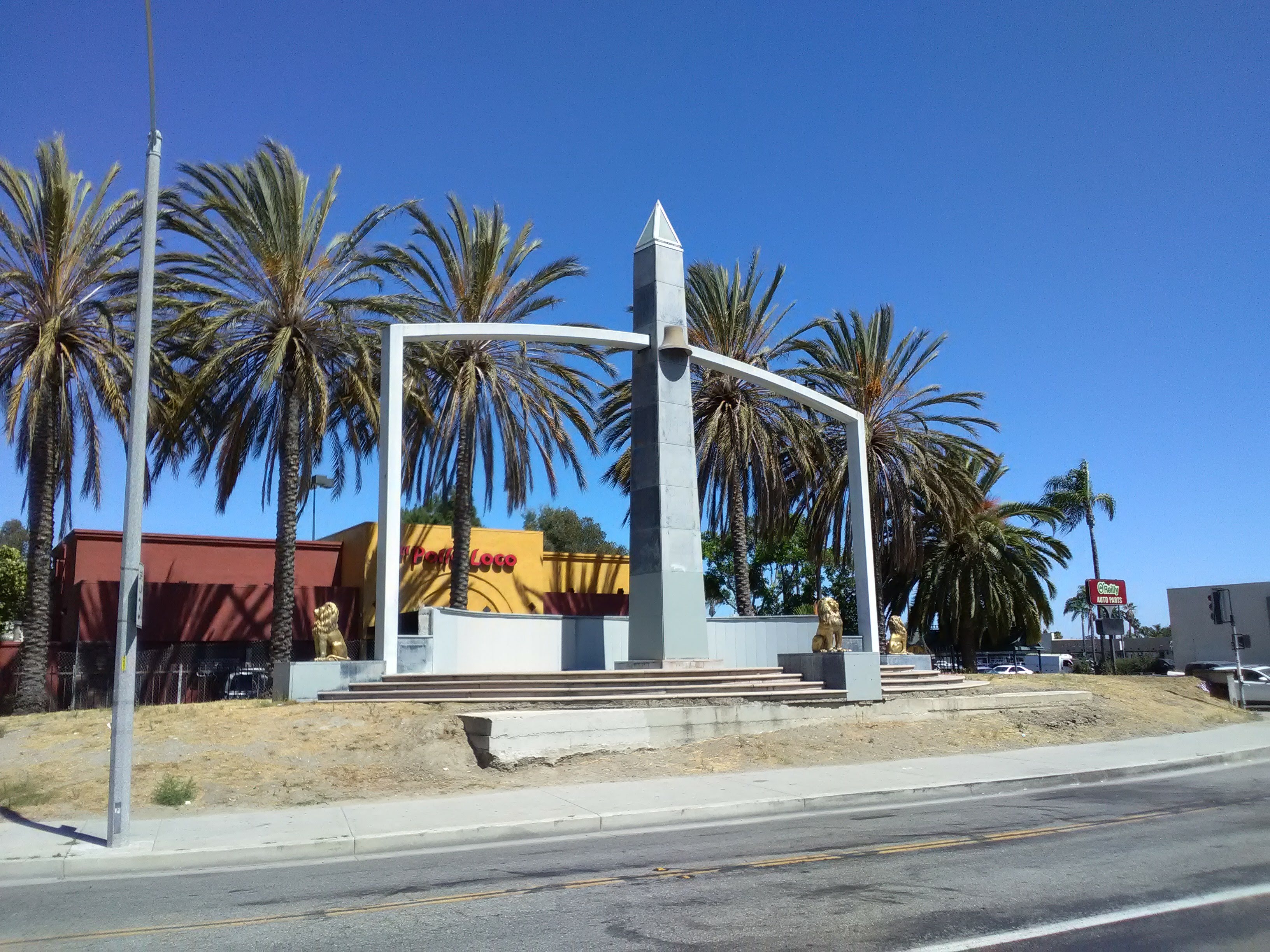The third tribute is the most interesting one, however. Across the main drag from the station is Compton Civic Center, easily spotted by the tall white Modernist tower of the county courthouse, which is easily the tallest building around. In front of the courthouse is the King Memorial, a gleaming sculpture that bears an uncanny resemblance to Space Mountain. A plaque at the memorial’s base dates the sculpture to 1978, only ten years after King’s death and five years before the passage of Martin Luther King, Jr. Day as a federal holiday (and three years after the first Space Mountain opened, in case you were wondering). It’s quite impressive to step inside and gaze up at, and its shape even seems to shift as you walk around it and view it from different angles.