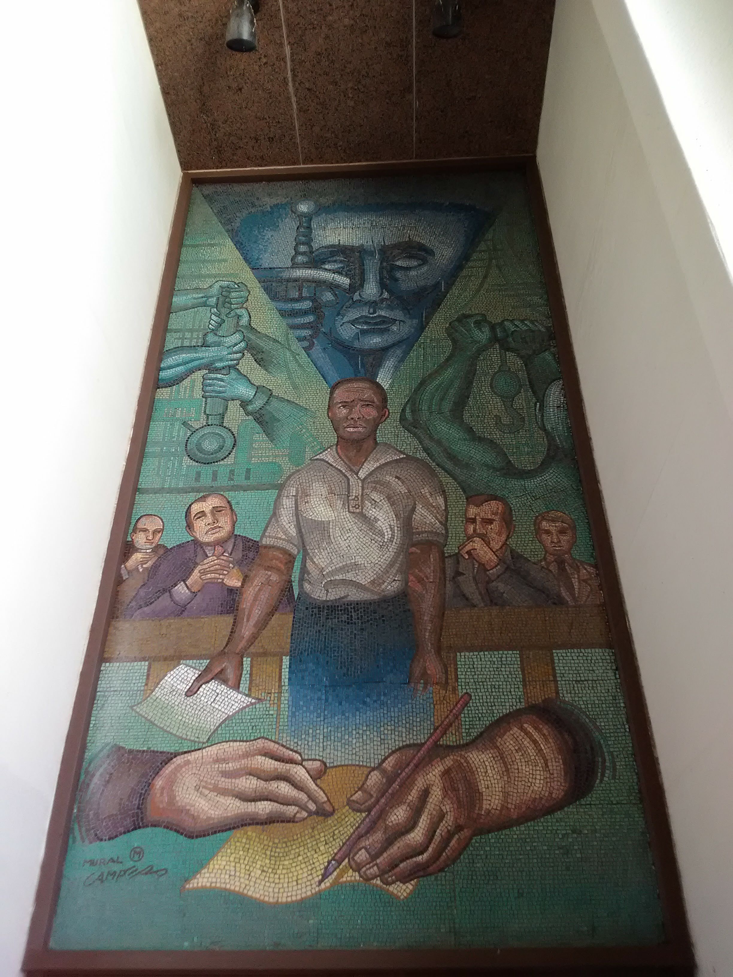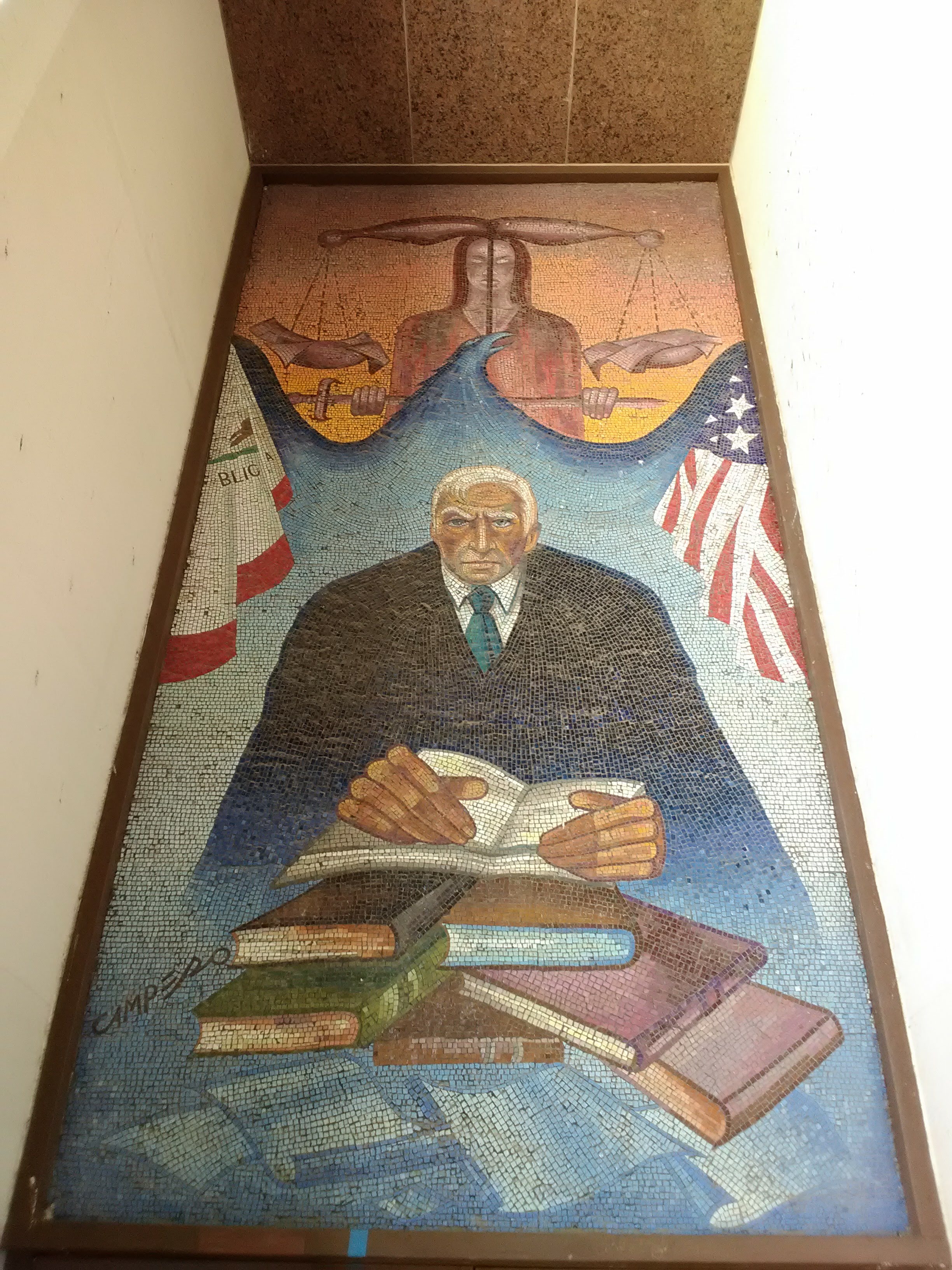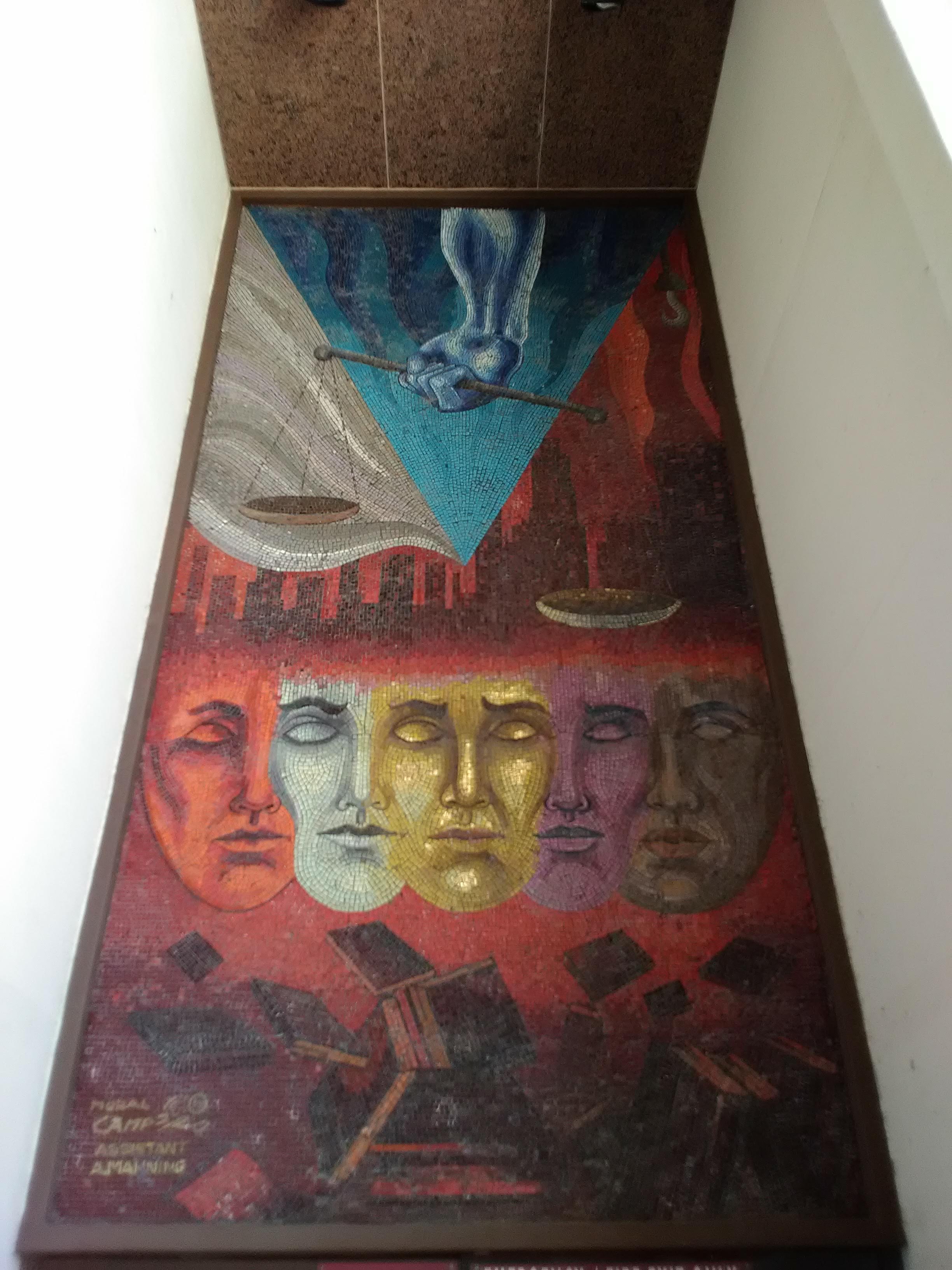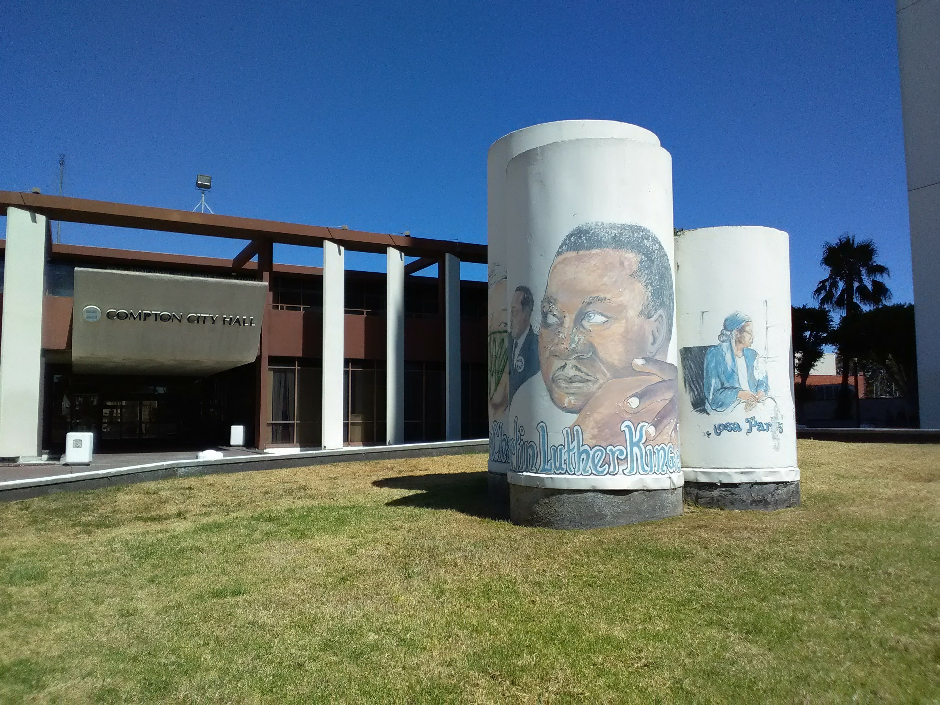 Compton Civic Center is probably one of the most well-preserved examples of ’70s Modernist architecture I’ve ever seen, down to the paving and landscaping. It can feel a little desolate, but also strangely captivating. There are other examples of public art on the campus, including a set of impressive law-themed tile mosaics set within the corners of the courthouse building. Behind the courthouse is a little park, with a stage adorned with a quote from King.