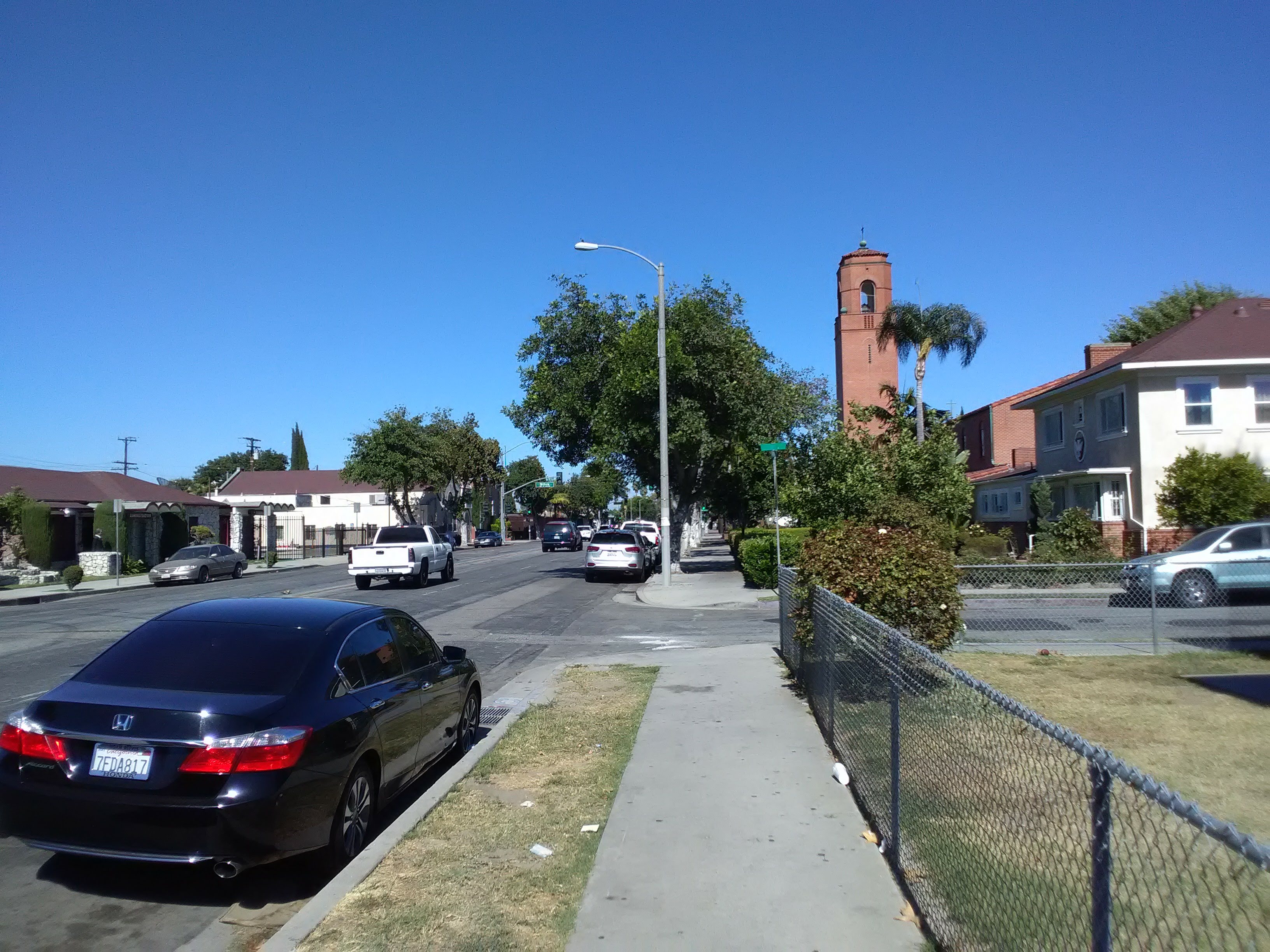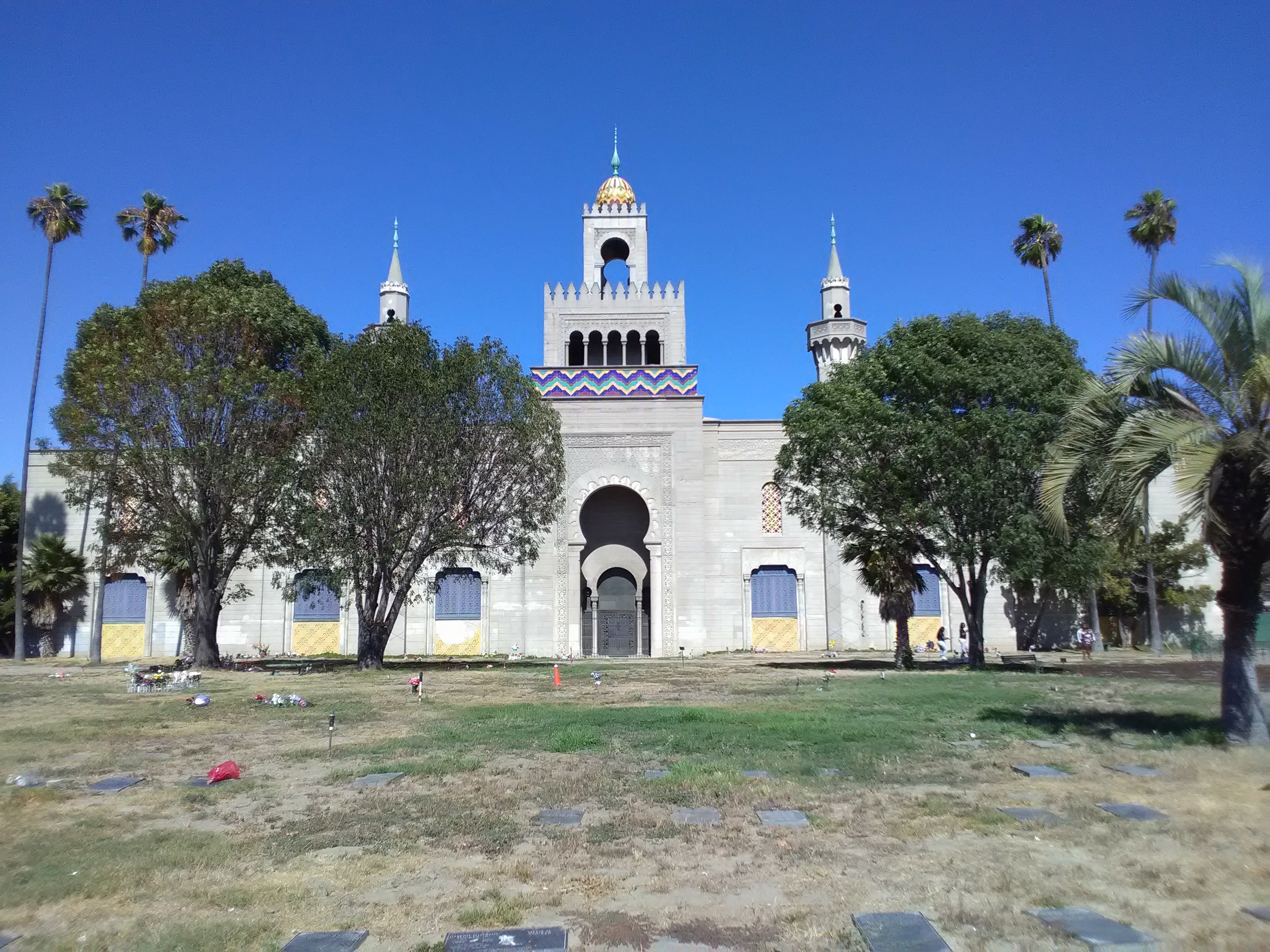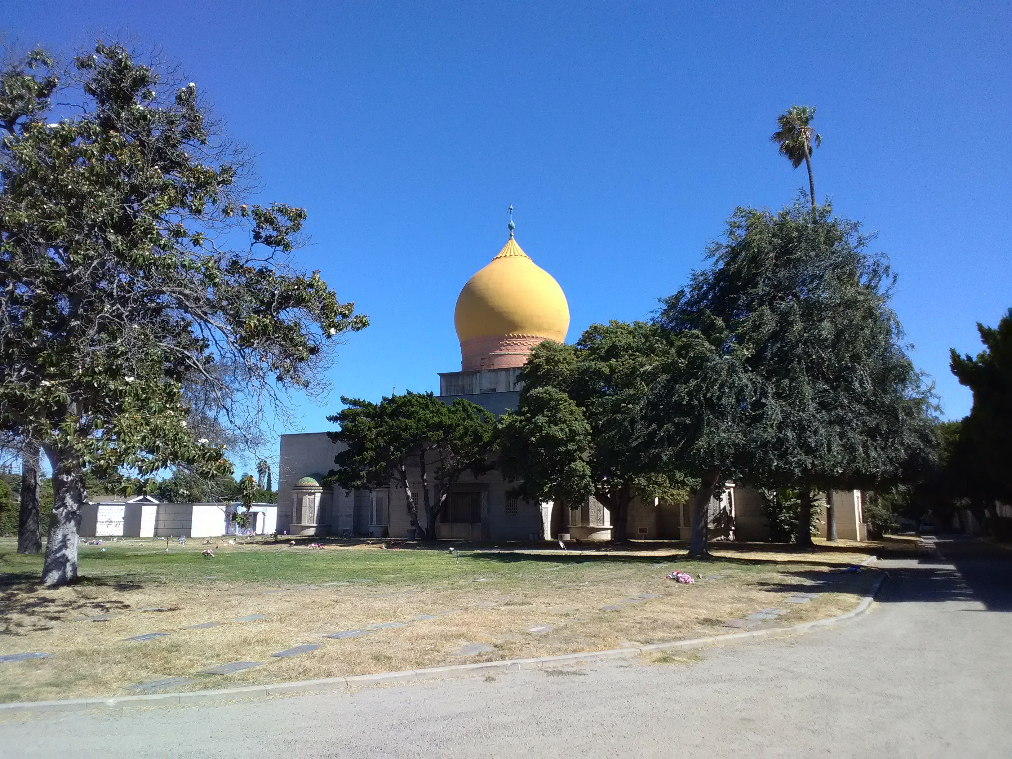 Although the civic center is impressive, a far more spectacular piece of architecture sits nearby, about a 20 minute walk east of the station: the Angeles Abbey Cemetery. Although you can walk there along Compton Boulevard, the town’s main drag, it’s more direct and far more pleasant to take Palmer Street just to the north. Palmer is a lovely residential street lined with cute little houses and manicured lawns, a park, a couple of pretty churches, and plenty of shade trees along the sidewalk, something desperately lacking on Compton Boulevard. Getting to the Abbey from the Metro station is straightforward enough: as soon as you exit the platform, head straight past the transit center and keep heading straight as much as possible until you reach the Abbey. Along the way, you’ll get a flavor of this peaceful neighborhood, with families playing in the yards and friends chatting on the front porches.