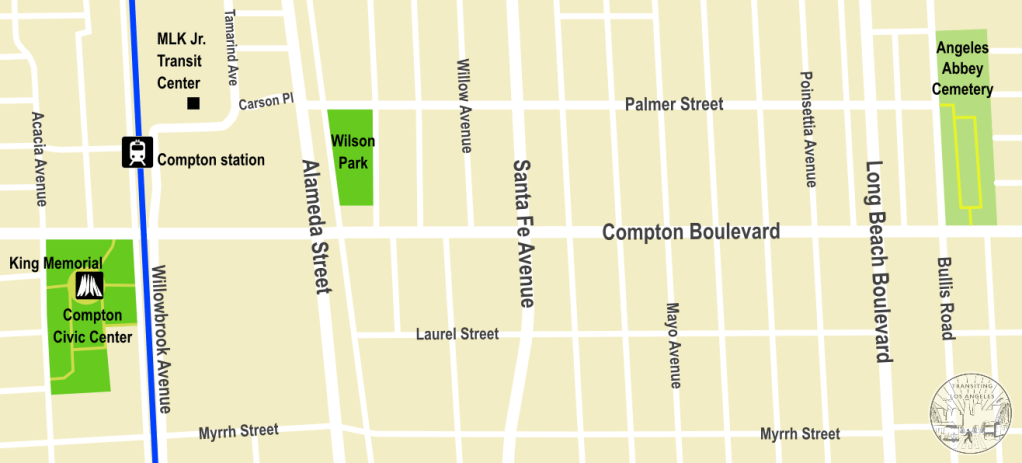 Few communities have as maligned a reputation as Compton, which even today is still known primarily for gang violence and gangsta rap. But the days of heavy crime are long past, and visitors stepping off the train now will notice a lot of tributes to African American and civil rights leaders. Within steps of the Metro station are three tributes to Martin Luther King, Jr alone, including the name of the transit center adjacent to the station (with its towering letters spelling out “COMPTON”) and an obelisk flanked by lions dedicated to both MLK and Cesar Chavez.