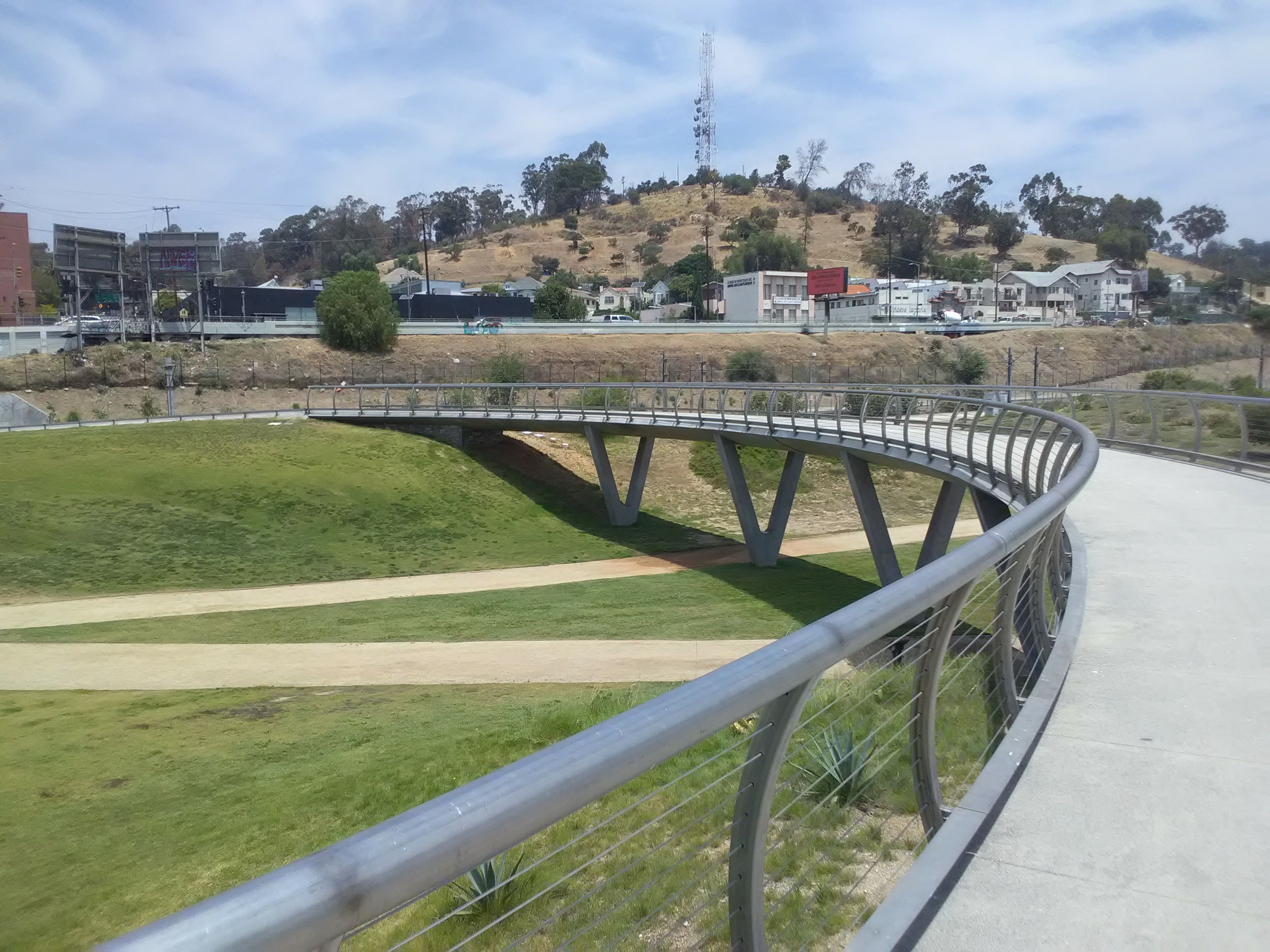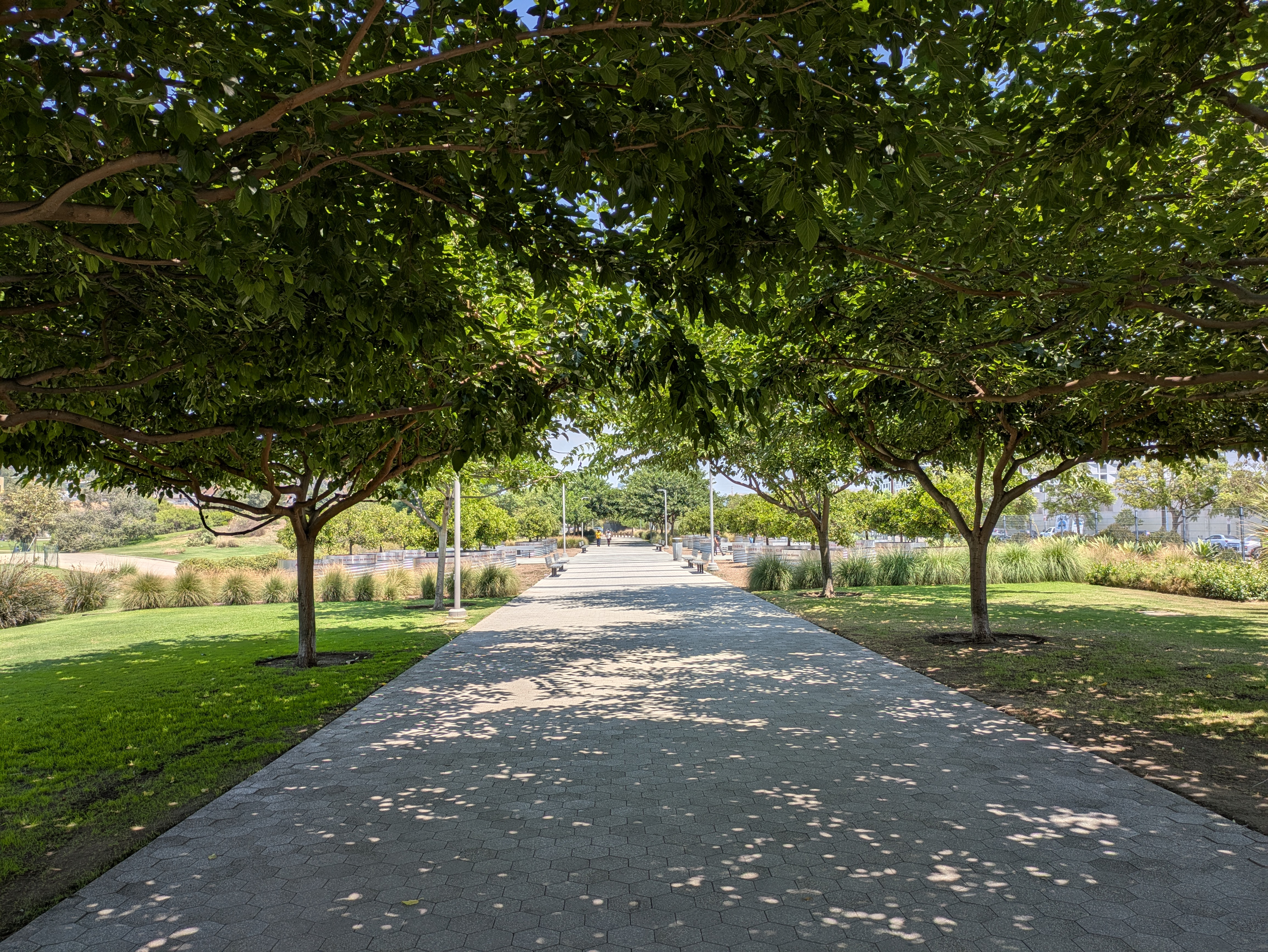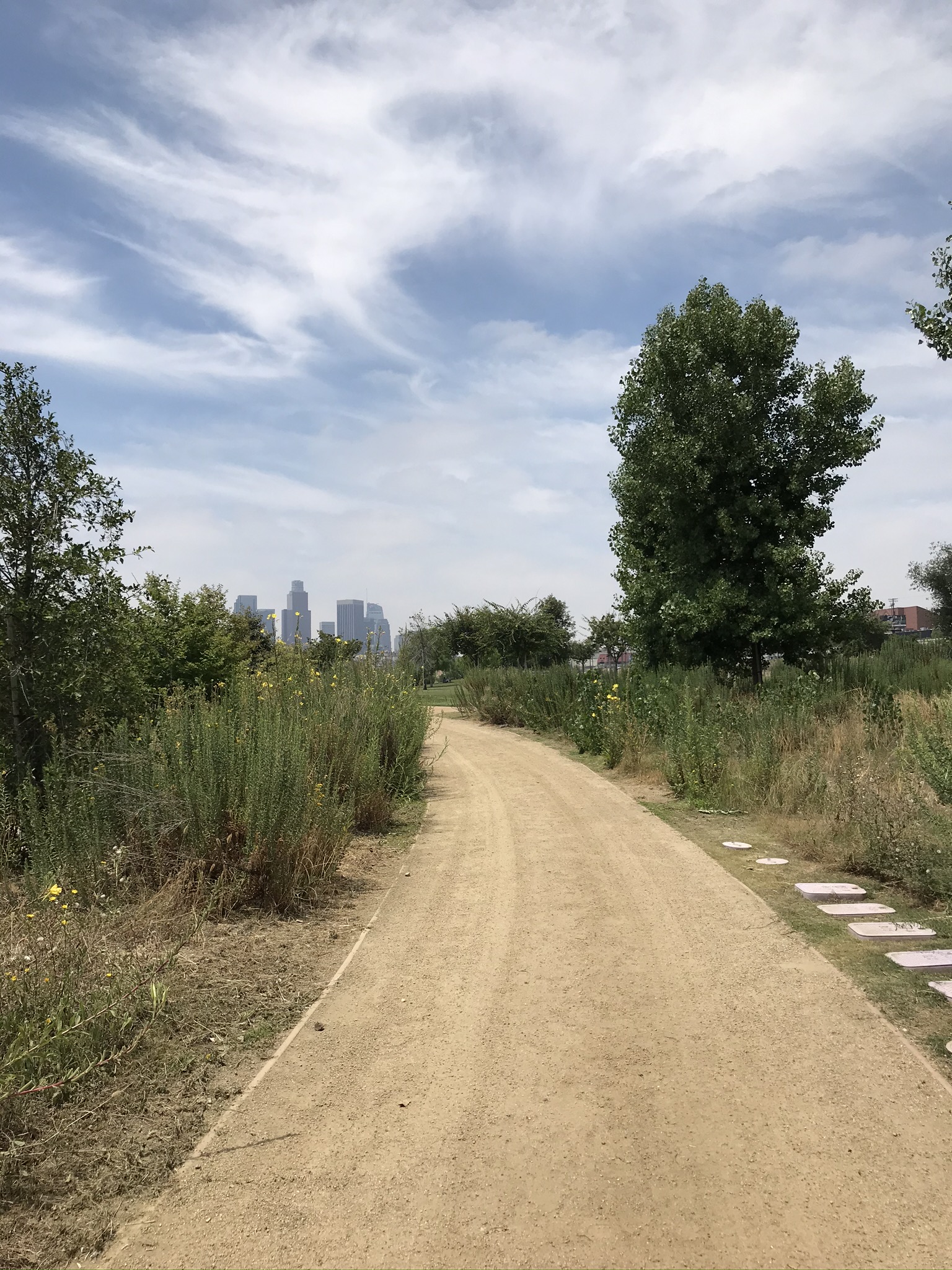 From atop the elevated walkway, the trees frame a beautiful view of the Downtown skyline. You can trace the path of jets making their descent into LAX while helicopters buzz overhead. Freight trains occasionally blast their horn nearby while Metro trains frequently hum past. The little grassy hills are topped with cacti and shrubs, just out of reach of the little kids racing each other on the lawn below.
