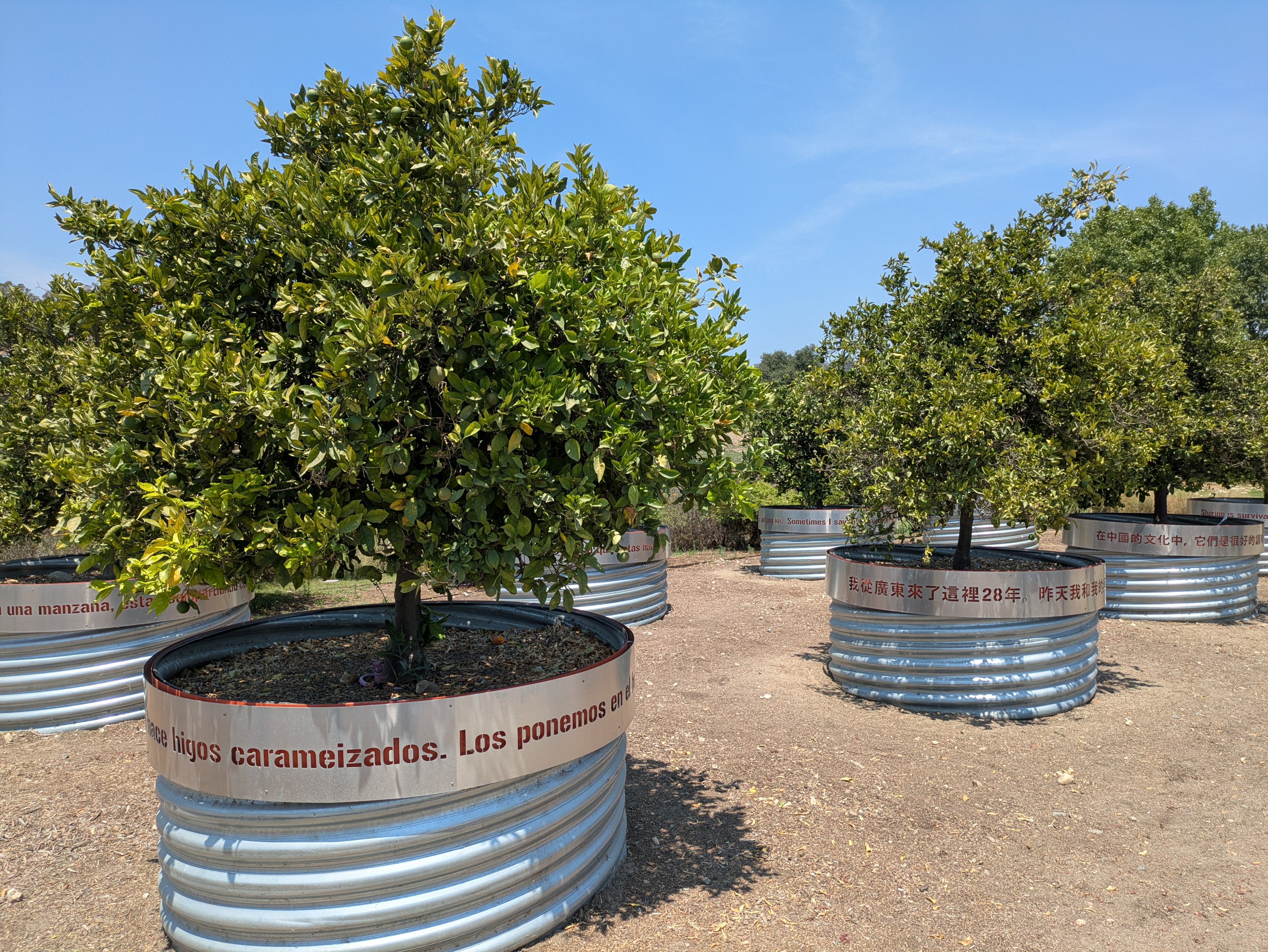 Separated from the lawn by a dry creek bed is the entry path along Spring Street. This is where you’ll find the park’s primary facilities, such as the ranger station and restrooms, as well as a nice cafe at the southern entrance. A farmers market takes place at the entrance to the park every Thursday afternoon, in the shadow of the Metro station. You’ll find plenty of welcome shade from the trees lining the path. This is also where you can look at the orchard, a set of orange trees that serve as a public orchard and as a nod to the agricultural history of the site. As you walk past, you’ll see quotes from local community members inscribed on the metal planters in English, Spanish, and Chinese characters.