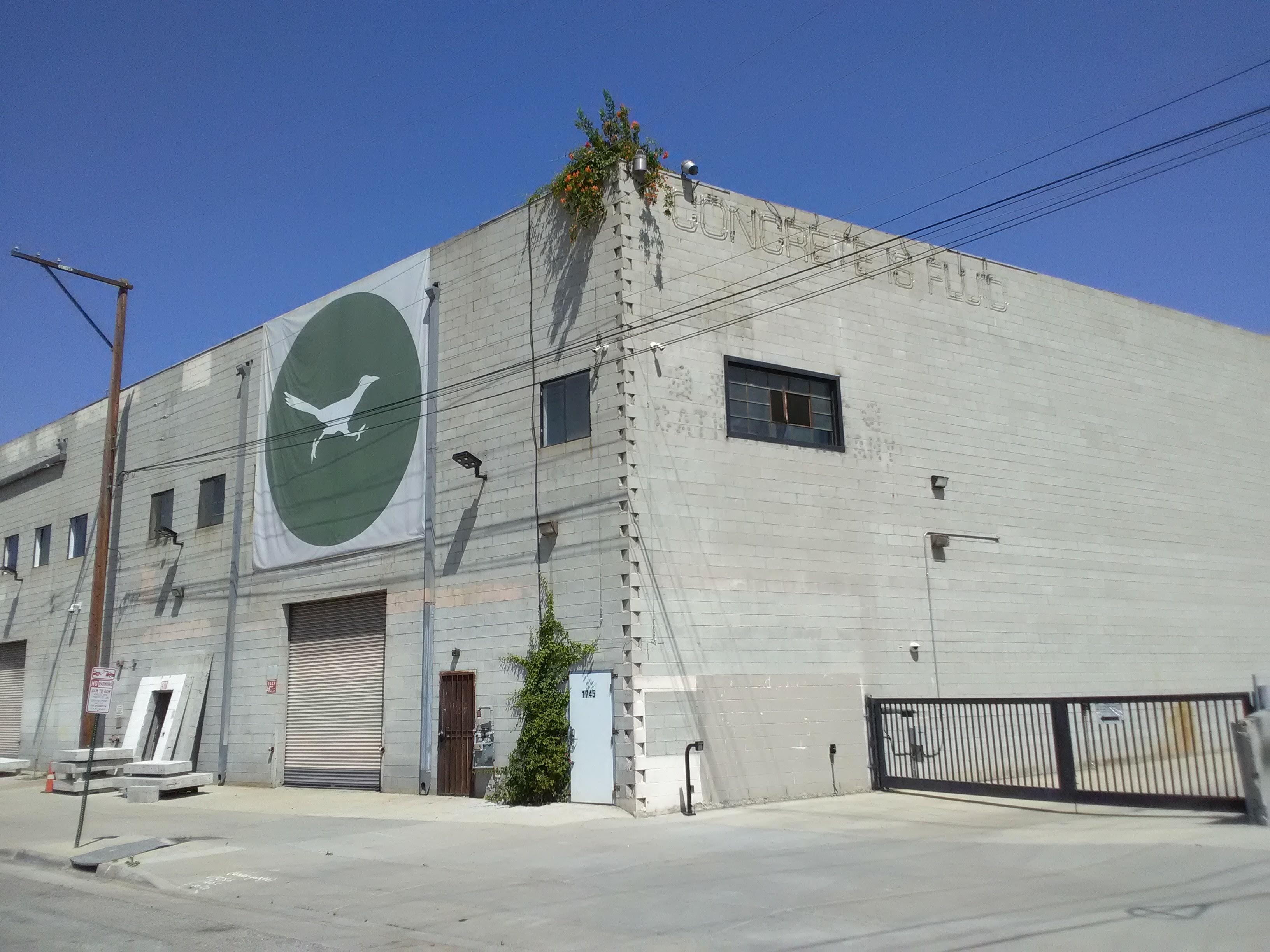 At the north end of the park, at the end of Baker Street, an attempt is being made to reconnect the neighborhood with the broader natural environment. Following Not a Cornfield, Lauren Bon established Metabolic Studio, which now occupies a warehouse at the north end of the park. A burst of orange flowers emerge from the corner of the rooftop. Concrete is mostly what you see along Baker Street, but as you approach the end where an imposing gated entrance to a Metro rail yard sits, something fascinating emerges. Behind Metabolic’s warehouse, on the side facing the Los Angeles River, is an experimental garden of drought-tolerant vegetation, hydroponic plants and water collection methods. Even from a distance and behind a chain-link fence, the unmistakable sound of dozens of frogs emanates from somewhere in the garden. At night, you can spot their neon “CONCRETE IS FLUID” sign mounted on their facility across the river.