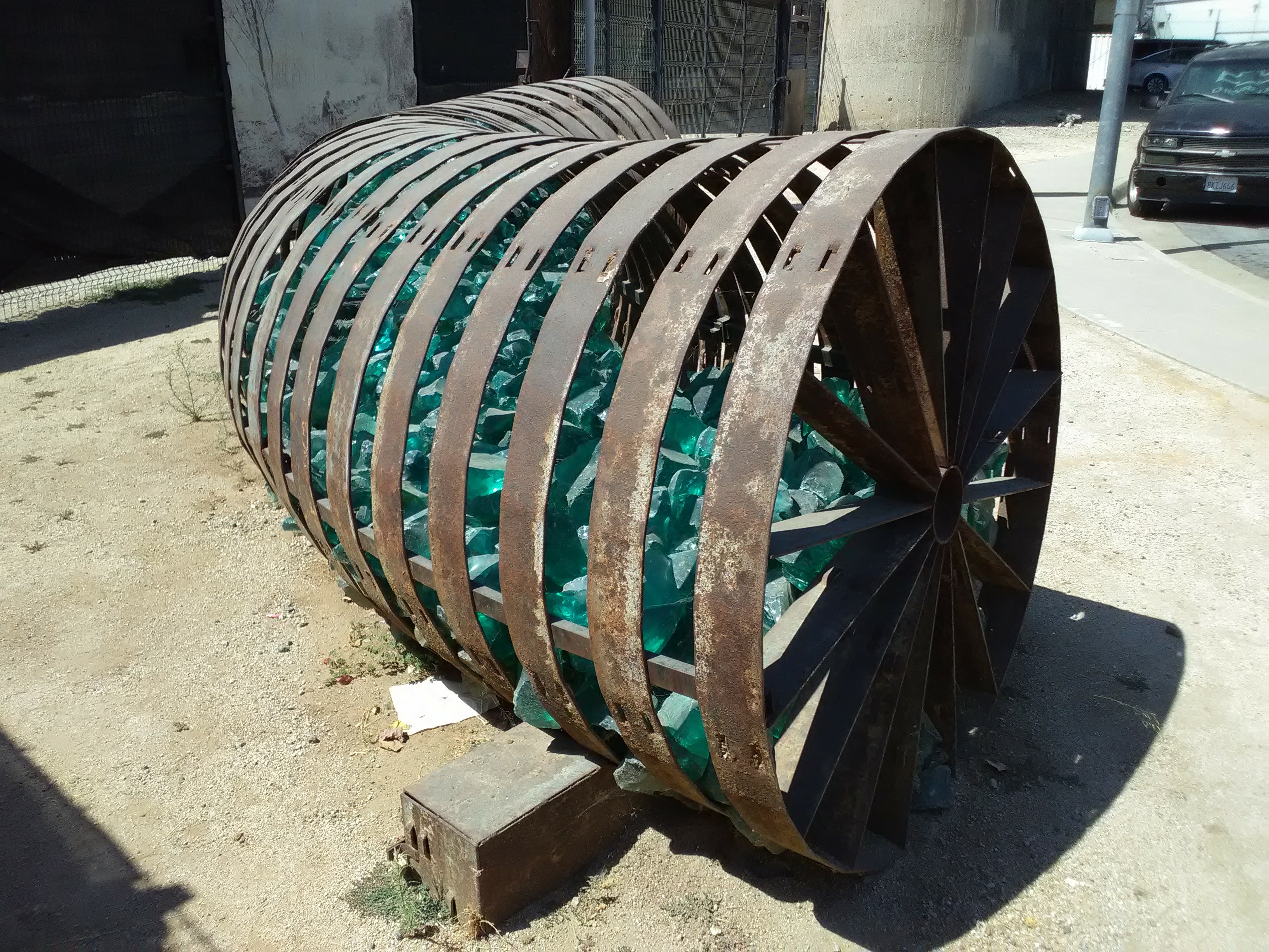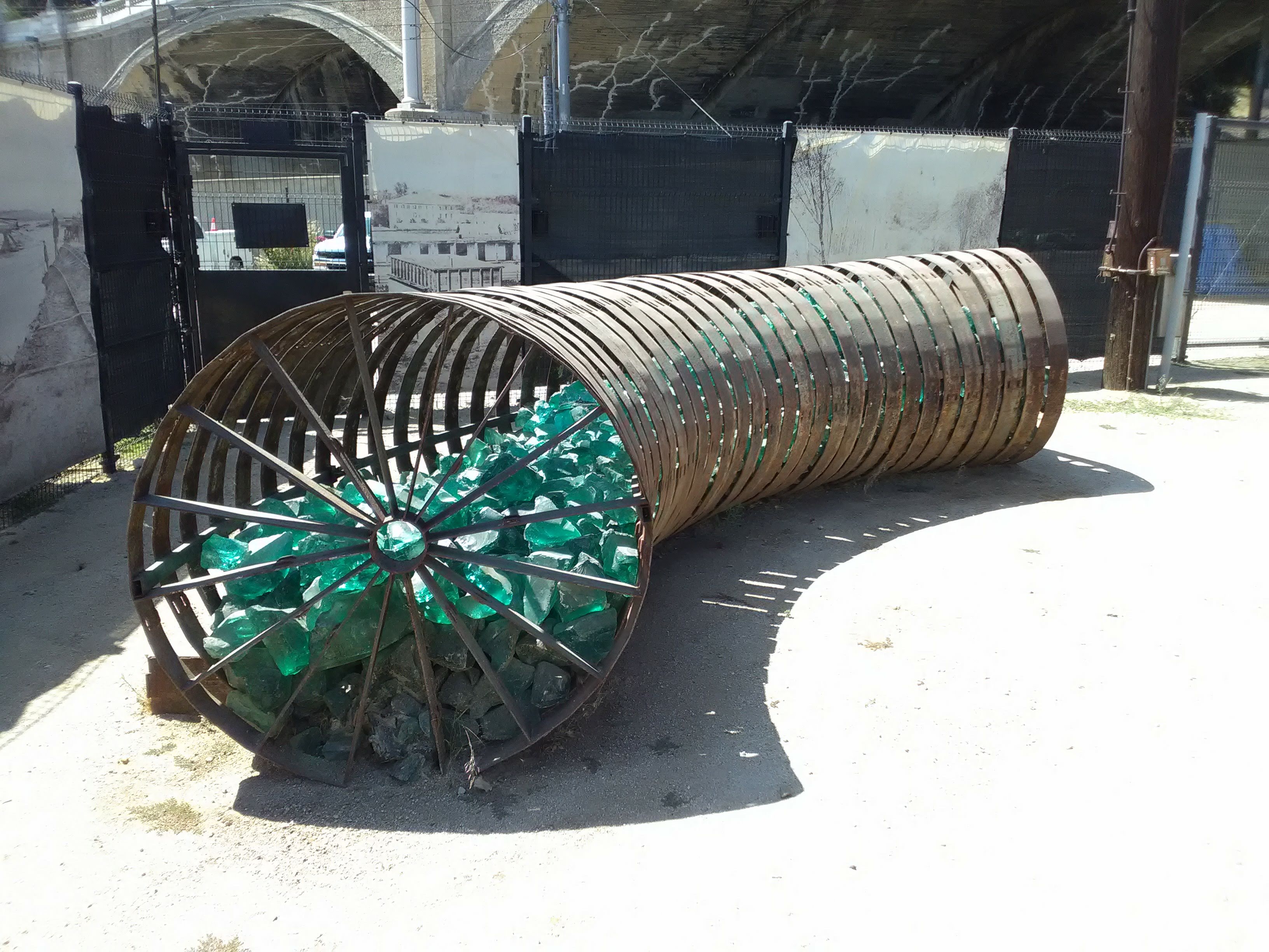 Across the street from Metabolic Studios sits an interesting sculpture. A stream of translucent green rocks sits within the rusty confines of a series of metal bands. The organic matter within is visible, and tantalizingly within reach—but someone must break the cage.