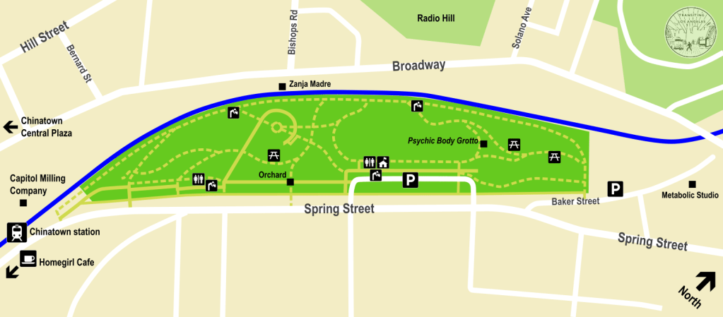 As the vegetation grows and the tree canopy expands, the different parts of the park are becoming more distinct from each other. The field at the center of the park is more defined now that there are fully-grown trees surrounding it, and the more naturalistic areas are feeling more wooded. As the park matures and softens, it’s hard to believe that this spot was once central to the development of Los Angeles.