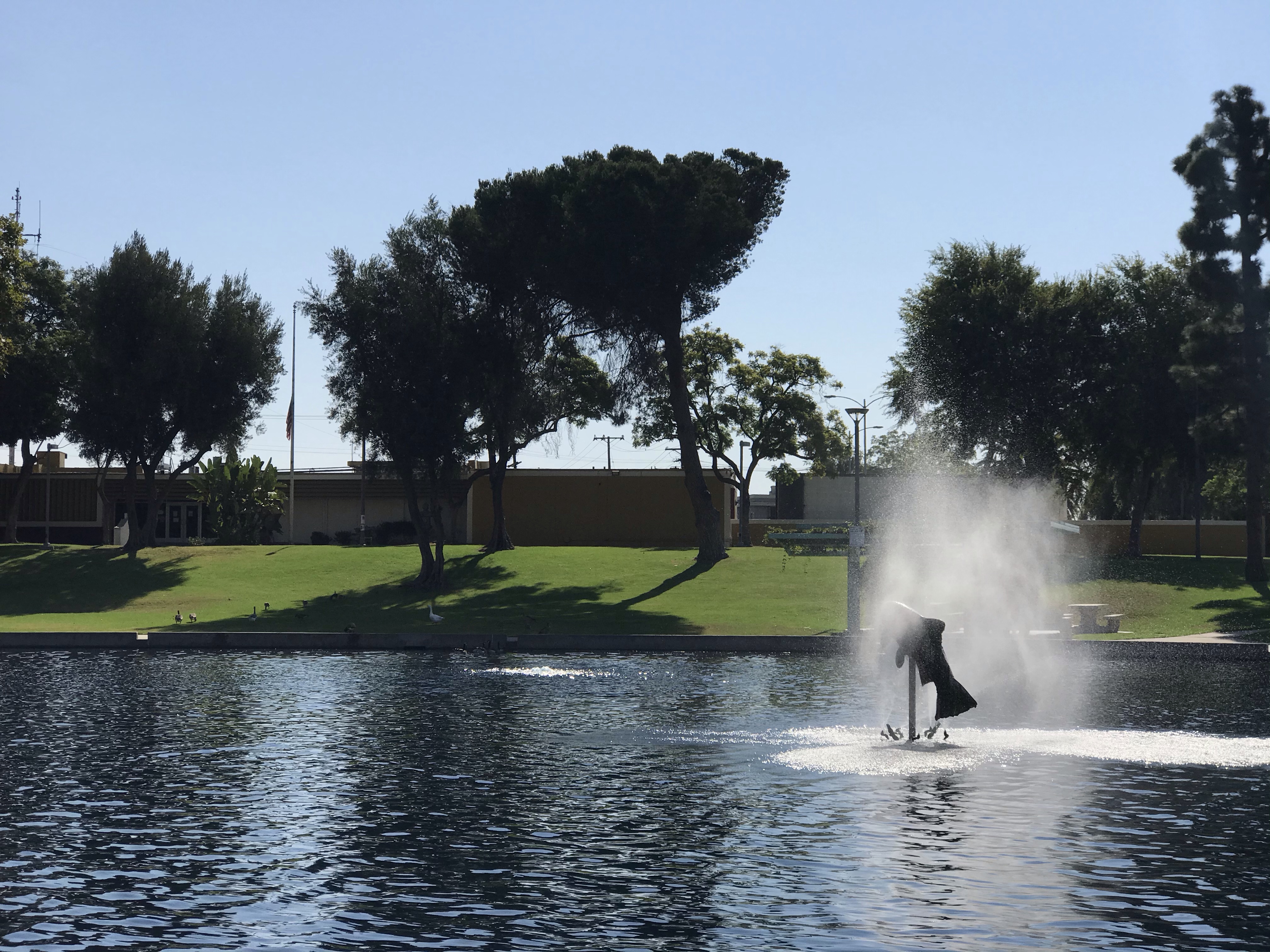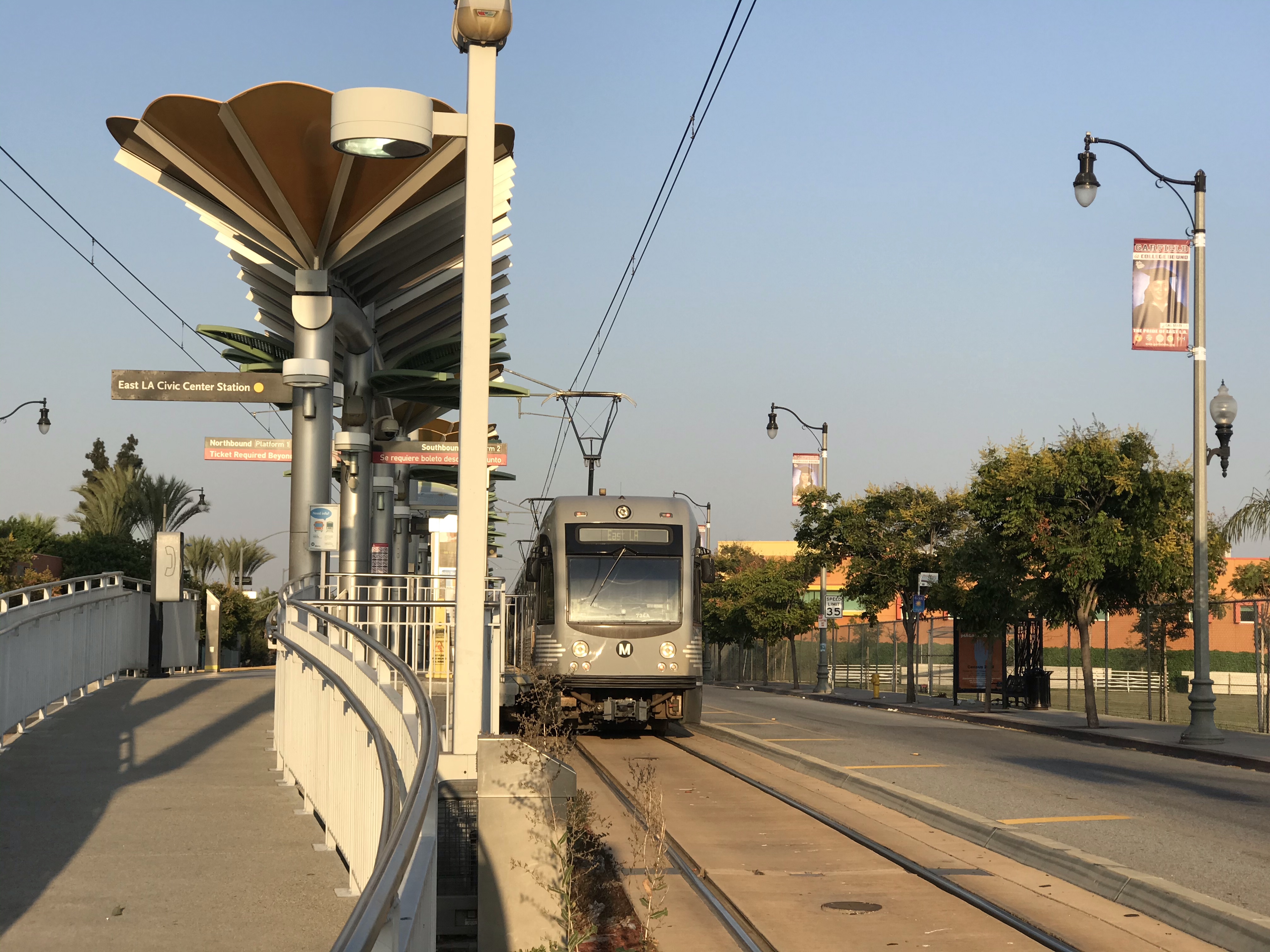 The next stop is East LA Civic Center Station, at 3rd & Mednik. From here, you can see the end of the E Line, Atlantic Station, just a few blocks further east. East LA Civic Center serves its namesake across the street, which holds a bunch of county facilities that serve East LA, including a library, a courthouse, a clinic, and the rather bleak sheriff’s station. The best feature of the civic center is Belvedere Park, a well-kept park surrounding a trout-stocked lake. Indeed, the middle of the lake sports a pair of fountains spraying from the sculptures of fish leaping out of the water, and fishing is a common pastime here. Many charismatic flocks of waterfowl have taken up residence at the park, and you’re sure to see lots of ducks and geese walking around. One side of the lake holds an island amphitheater, and the 4th of July fireworks show typically held in the park is particularly audacious.
