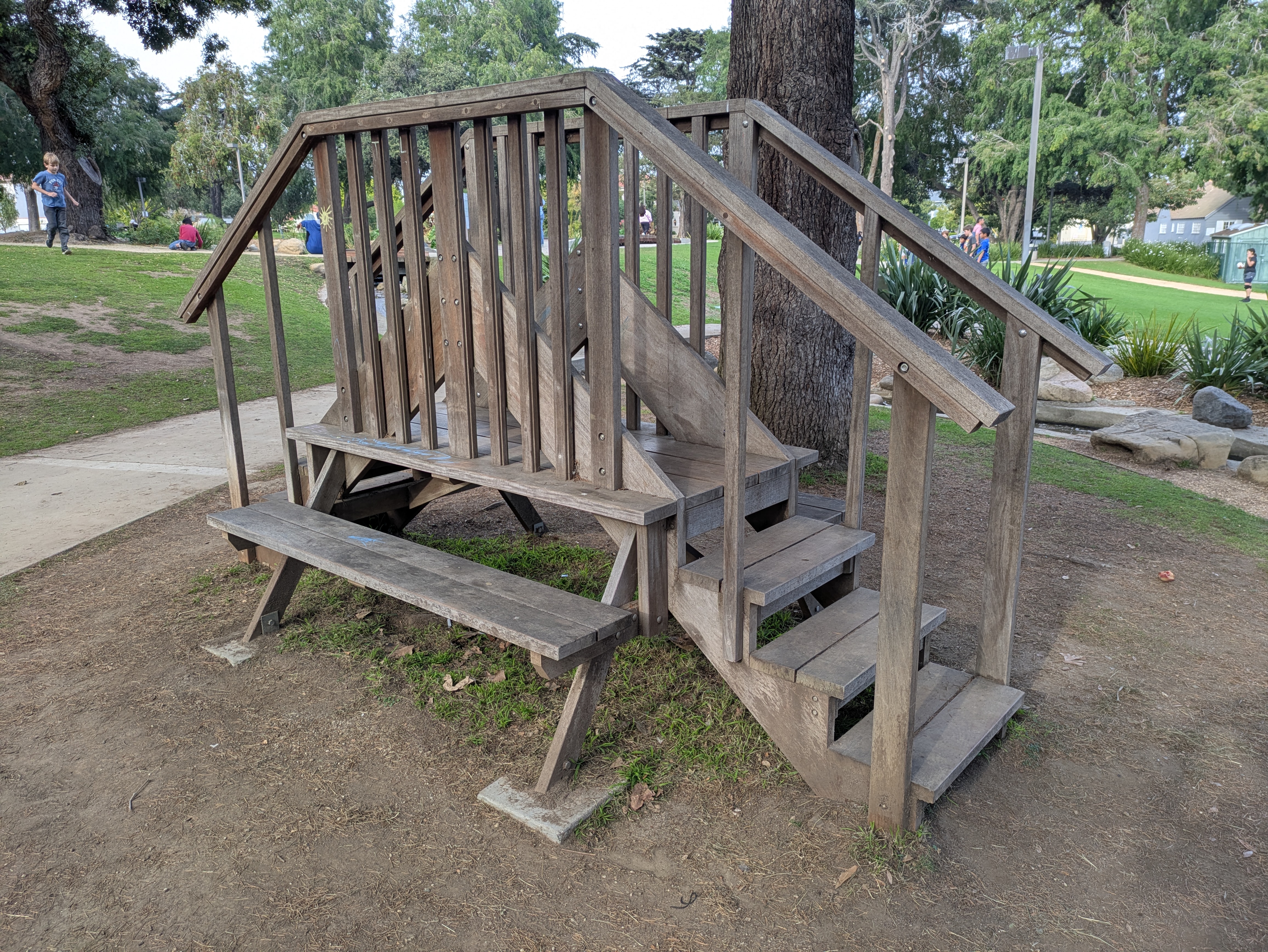 The pond and the large, shady trees are lovely, but our favorite feature of Douglas Park is the picnic tables. Scattered around the park are picnic tables designed by artists Ellen and Allen Wexler that are each just a little… off. One has a tree growing through it. One has a roof. One has the actual table seemingly folded down to create two benches. And another has a bridge built through the middle of it, rendering it useless as a table but really fun for kids to walk across.