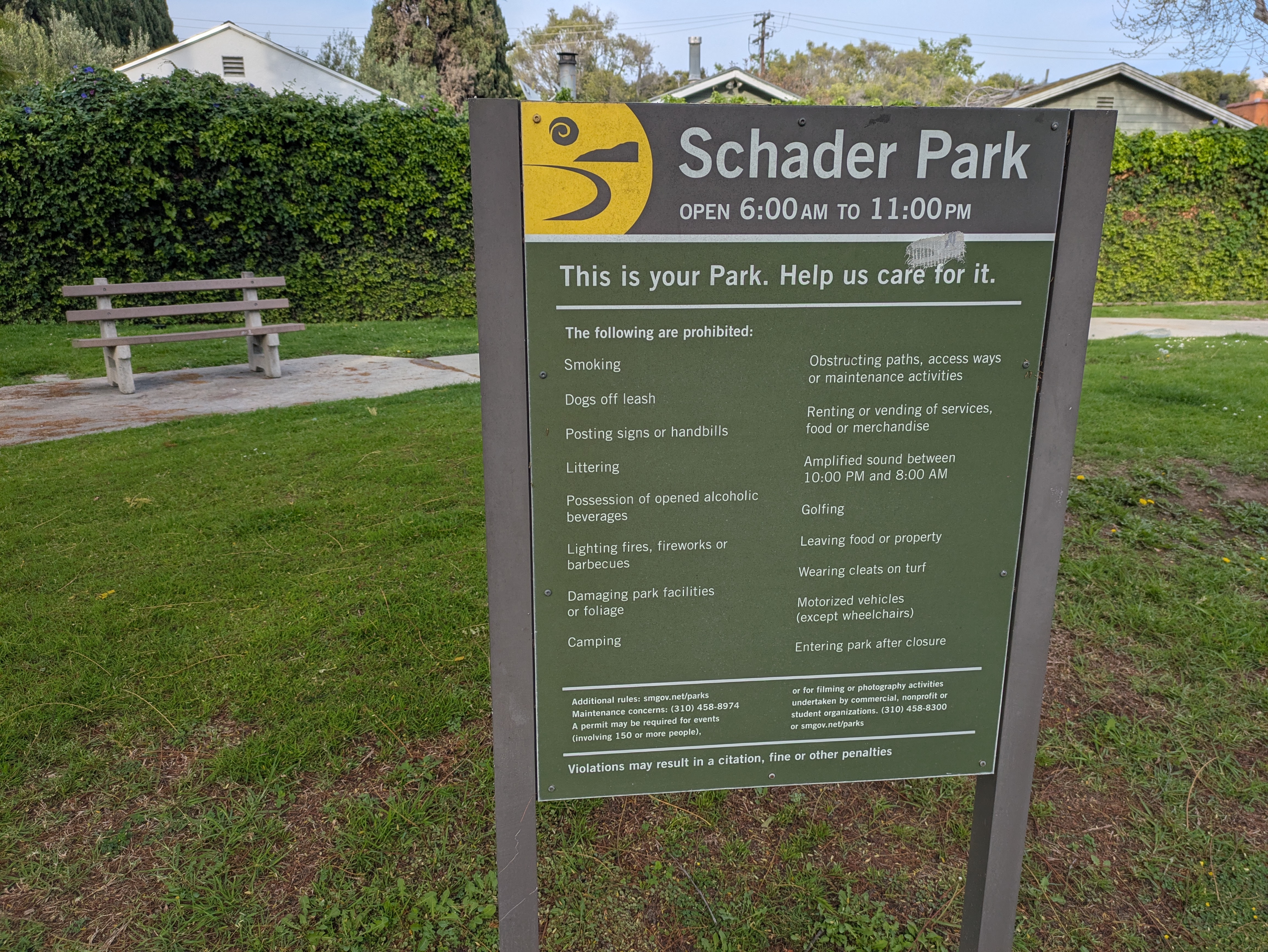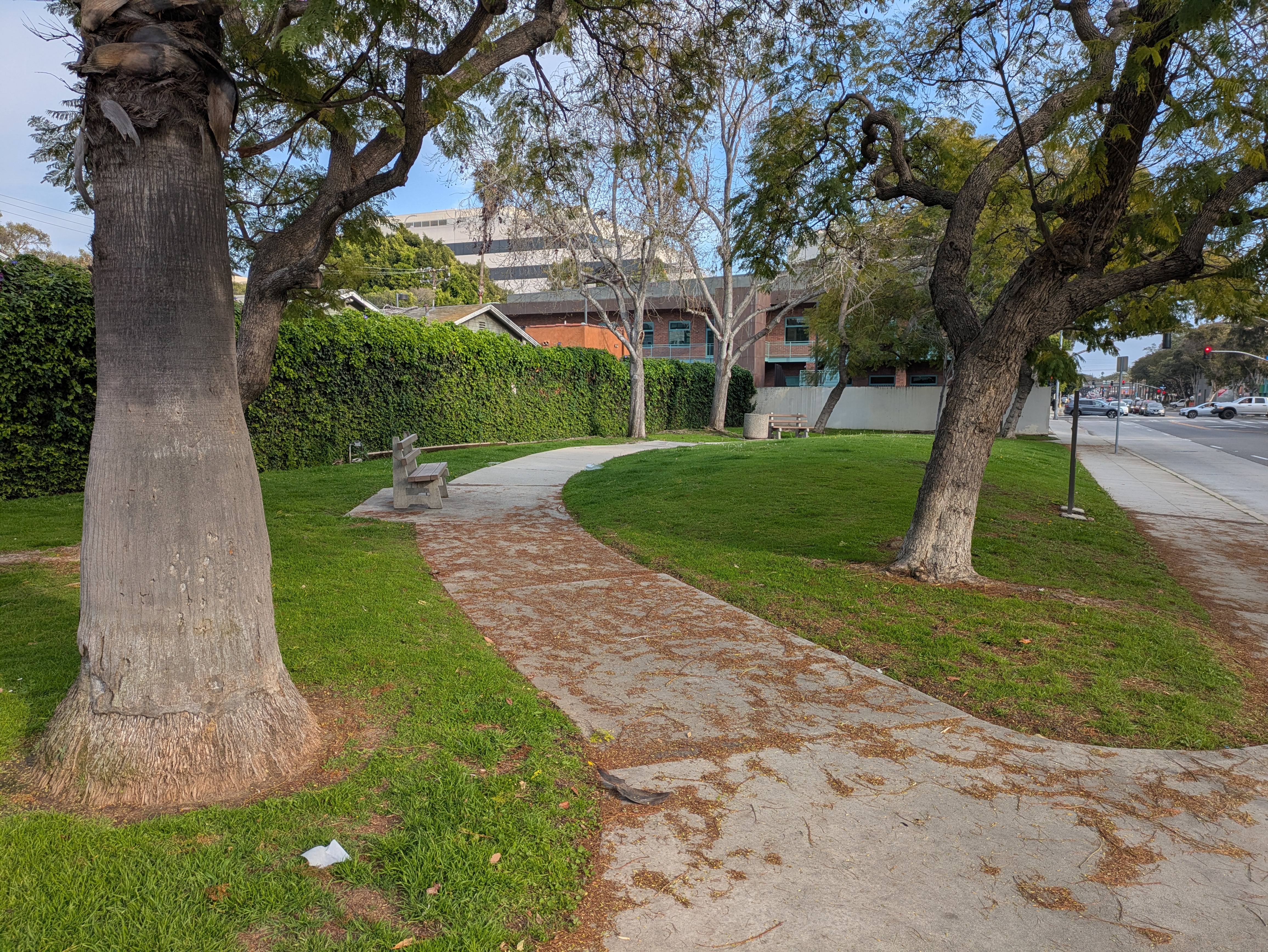 From the Water Garden, walk north up Cloverfield a couple of blocks to Santa Monica Blvd. Along the way, you’ll pass by Schader Park, a dinky city park that is likely Santa Monica’s smallest. It basically consists of only a lawn, a pair of benches, and a handful of trees wedged between the street and the apartment complexes next door. But it’s a spot to sit and relax on the way.