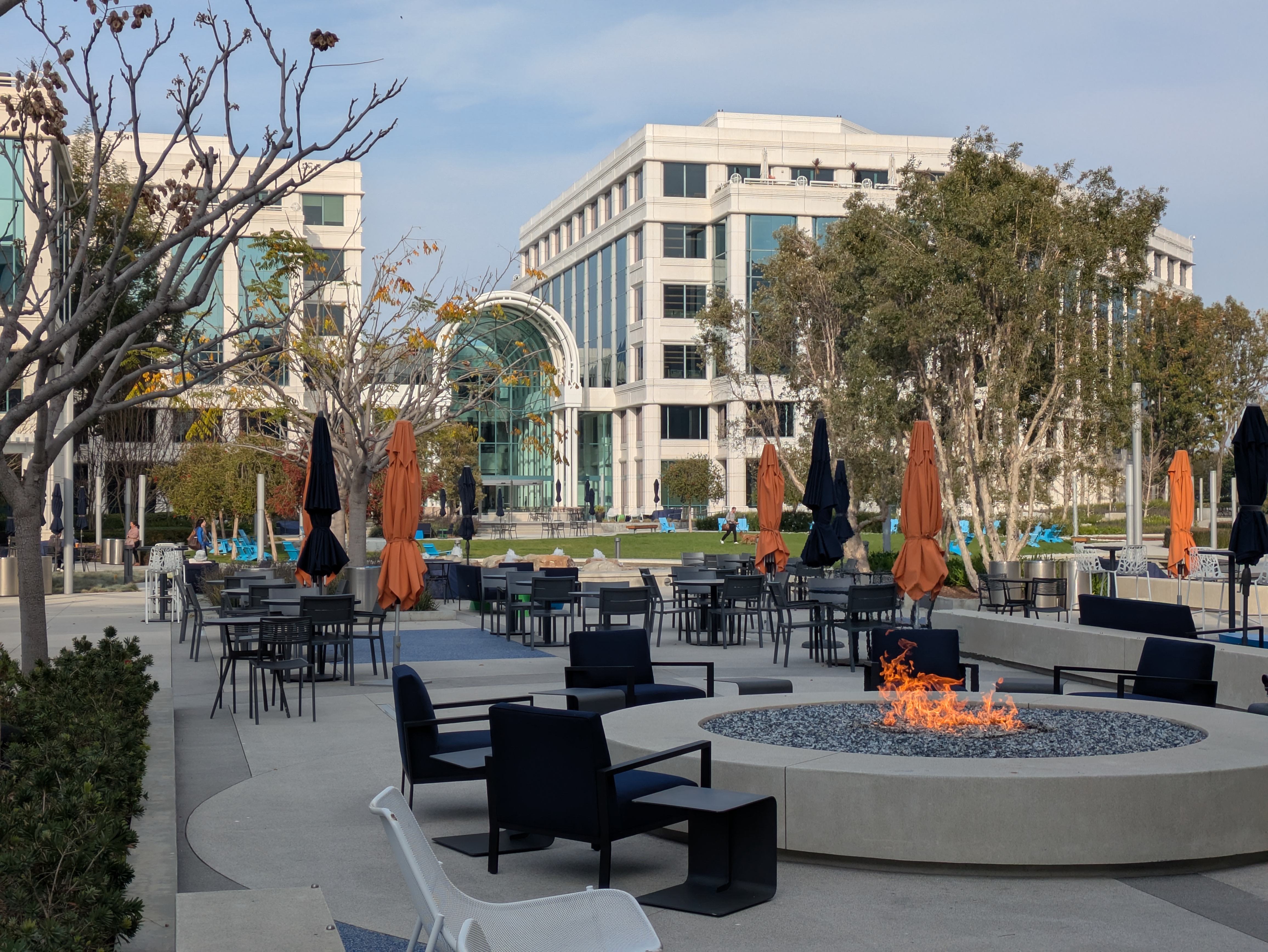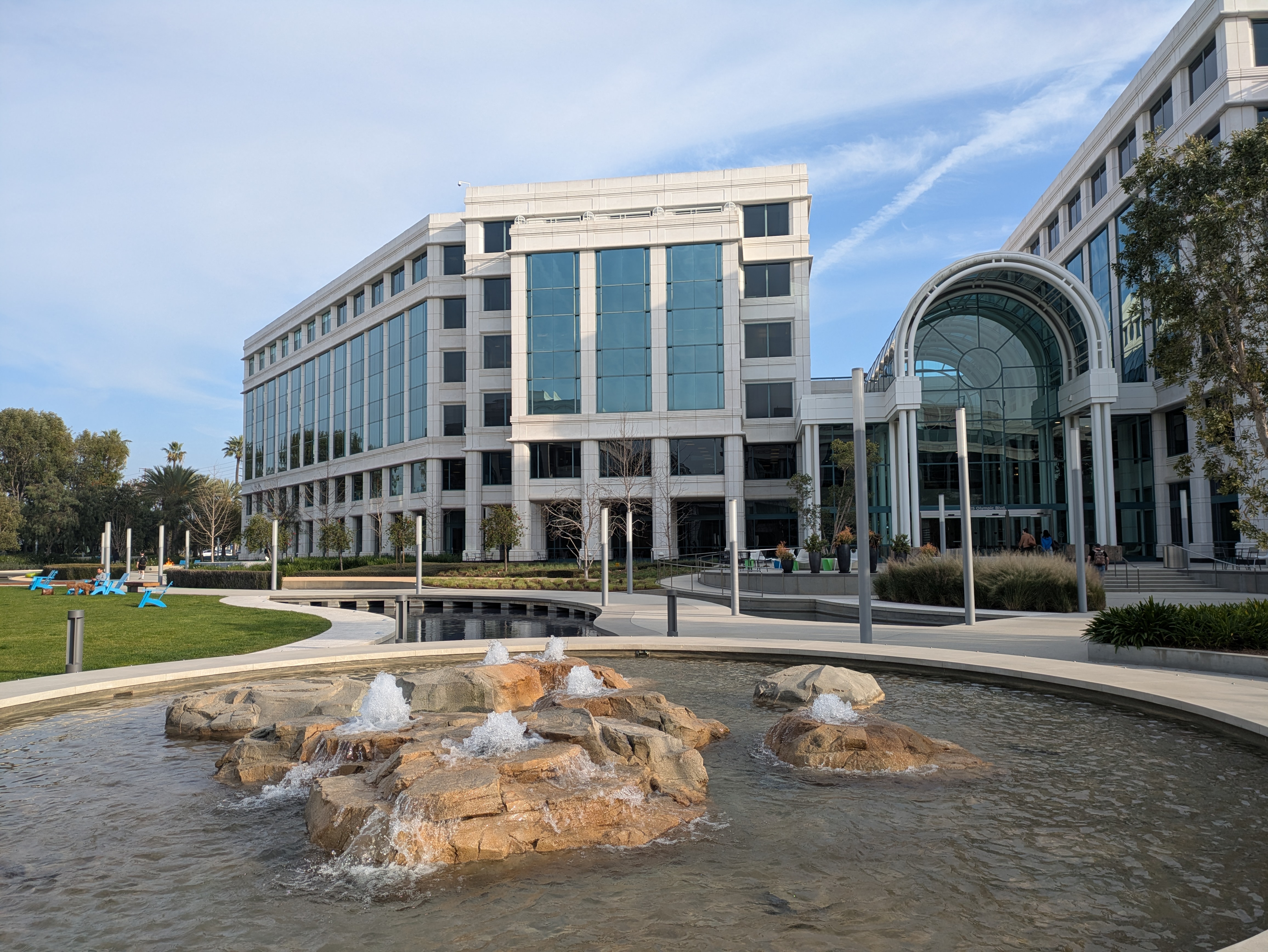 Cross 26th and Olympic and make your way into the complex of gleaming white office buildings across the street from the station. This is the Water Garden, a high-end office complex with an elaborate plaza in the middle. A large fountain sits on the corner facing the Metro station, from which flows a stream into the complex, crisscrossed by multiple paths. The stream is minimalist but beautifully designed, with a shallow concrete bed colored in a gradient between sandy yellow and a reflective blue, like an abstract beach. The stream flows into the plaza at the center, surrounded by grassy lawns and seating areas designed for the office workers who populate the site, some outfitted with fire pits. In the corners you can find some shady areas where you can take a seat beneath a grove of trees.