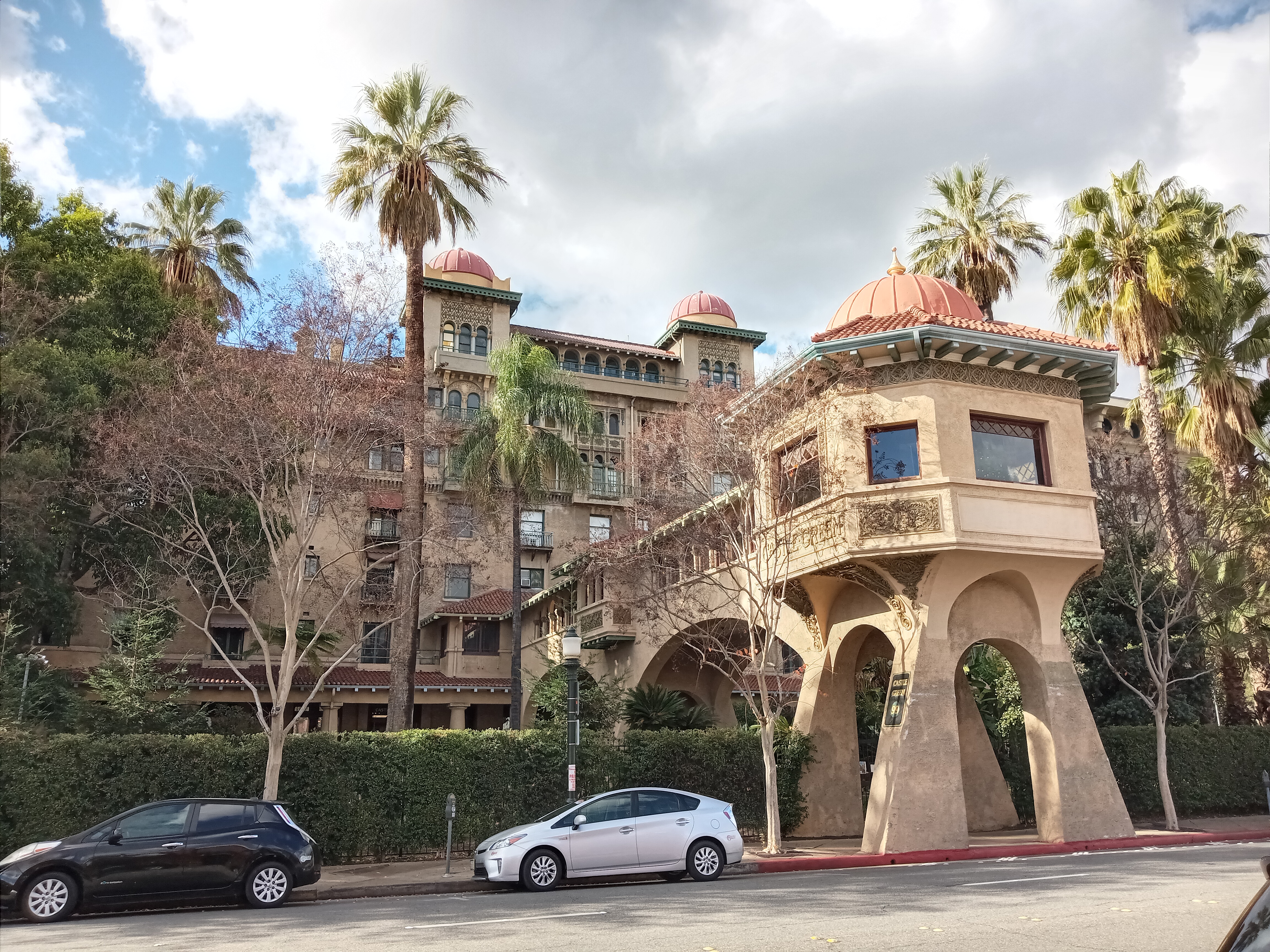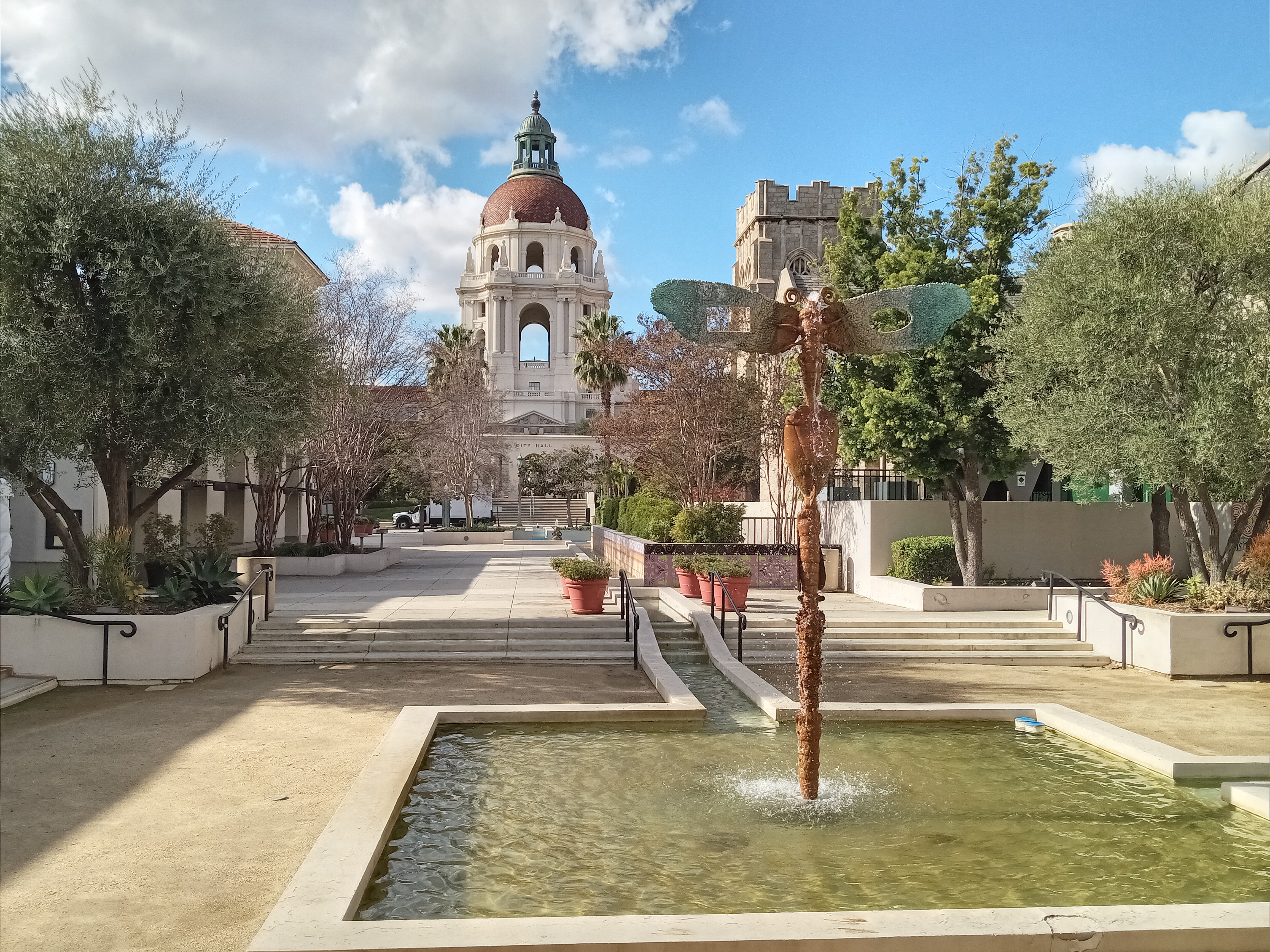 Just to the east of Orange Grove, located between Del Mar and Green Street, is the campus of the former Ambassador College, a former university run by an evangelical ministry. Most of the campus has been redeveloped into housing, although portions of the old college remain, namely the modernist auditorium building with its reflecting pool and striking crane sculpture. The best feature of the campus, however, is the little Japanese-style garden with a running stream, tucked on the hillside beneath another preserved mansion.
