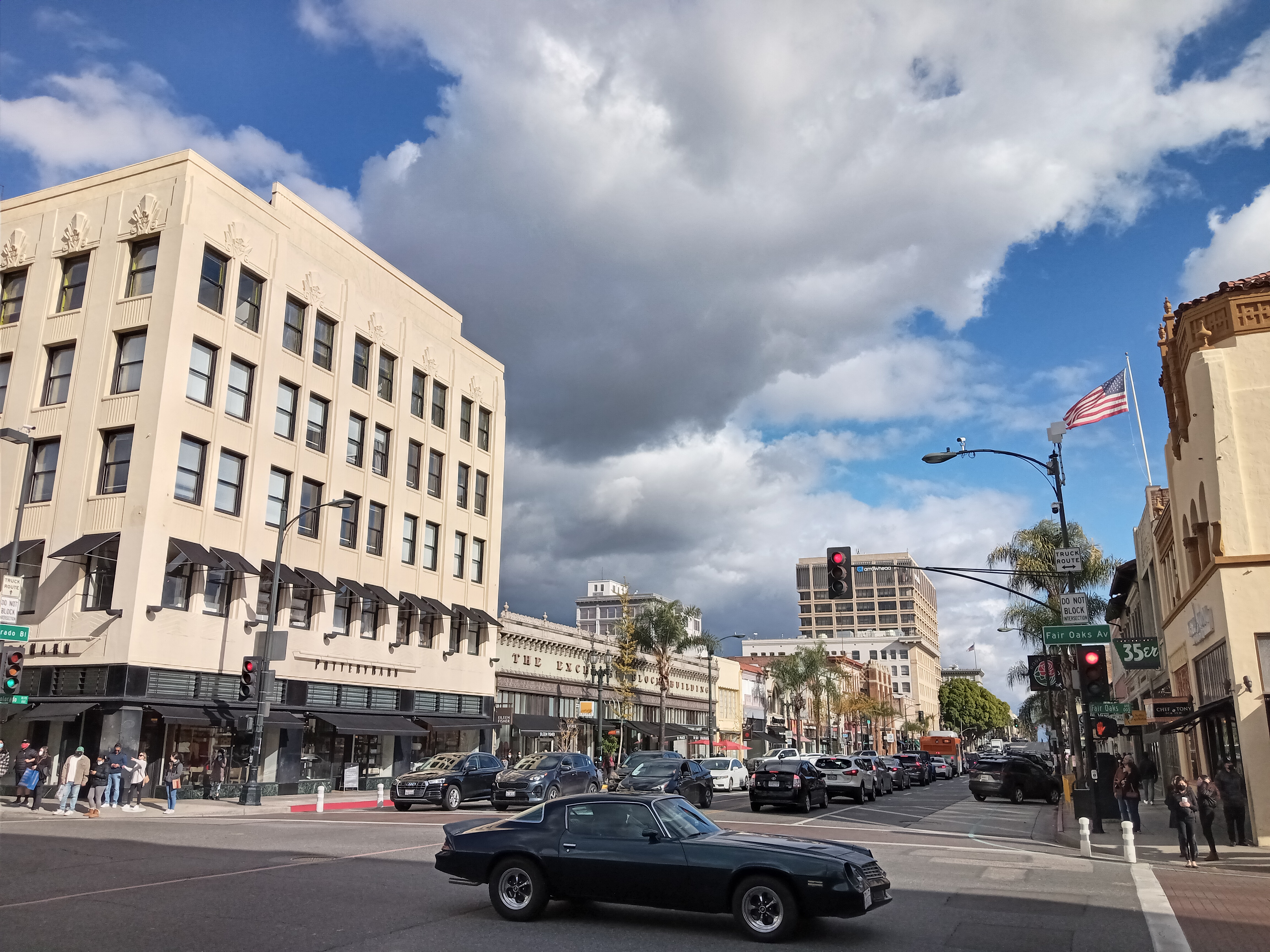 One spot very much worth checking out is CAR Artisan Chocolate, at the corner of Colorado and Catalina, two blocks east of Lake. This bustling café specializes in chocolate made in-house, with the tastiest chocolate croissants and most decadent hot chocolate in town, a must-have on a chilly parade morning. Three blocks further east, at 1234 Colorado Blvd, is Andy’s Coffee Shop, a beloved old diner dating back to 1960 and open only for breakfast and lunch. Behind the unassuming storefront, you’ll find a cozy diner with excellent breakfast dishes, including a particularly delicious breakfast burrito. Between Hill and Allen Avenues, Colorado passes the pleasant exterior of the Pasadena City College campus, although the much more scenic campus of Caltech sits just a few blocks to the southwest; see our walking tour for more on what that campus has to offer.