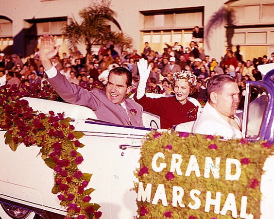 Another thing that becomes clear from the list of Grand Marshals is how much the Rose Parade once reflected Republican Party domination of Californian politics and culture in the post-WWII decades, and the very conservative, buttoned-down culture of Pasadena at the time. In an era when the Democratic Party was at its strongest, prominent Democrats are notably absent. Meanwhile, four consecutive Republican presidents served as Grand Marshal: Herbert Hoover in 1945, Dwight Eisenhower in 1964, Gerald Ford in 1978 (a mere fourteen months after losing to Jimmy Carter), and native Californian Richard Nixon twice, once as the Vice President-elect in 1953 and again as the current Vice President in 1960, right when he was gearing up for the next presidential election (and the same year that fellow future president Ronald Reagan hosted the ABC televised broadcast of the parade). Earl Warren shows up both as the newly elected Republican Governor of California and as the Chief Justice of the Supreme Court. Even the cultural figures selected for the role reflect conservative tastes of the time: Walt Disney, Bob Hope, John Wayne, Billy Graham, Roy Rogers, Kate Smith, Frank Sinatra… it all underscores what a very different political landscape California was back then.