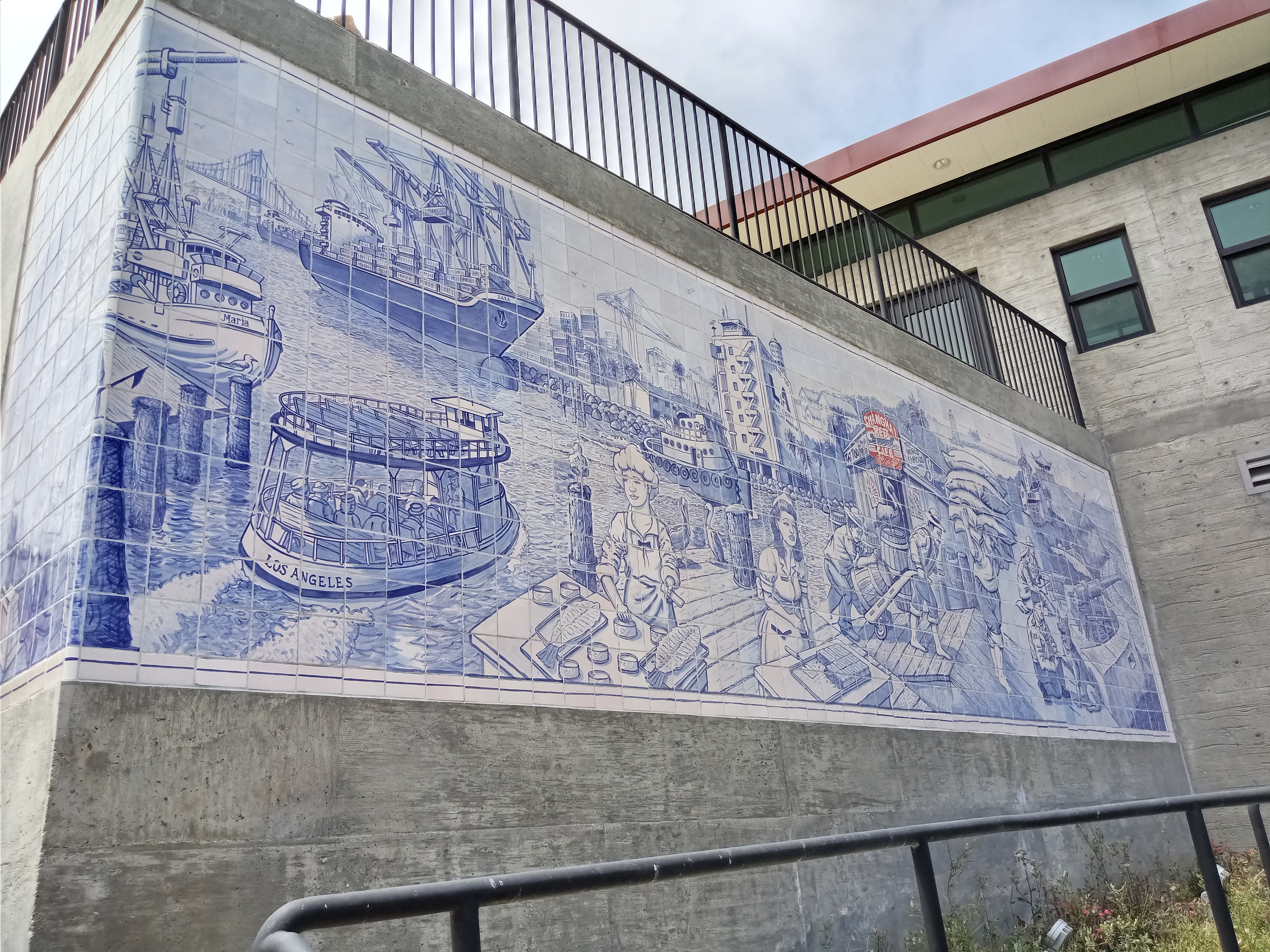 Before heading back down to the street, take a moment to enjoy the little overlook at the top of the stairs. Here you can admire the spectacular view of San Pedro before descending back into town. On the way down, you can also admire the beautiful blue-and-white tile mural on the wall facing the stairs outside of the pool, which depicts a historical maritime scene from San Pedro’s heyday as a bustling port town. The tall-mast ships and wooden docks might be gone, but that port still awaits you in town.