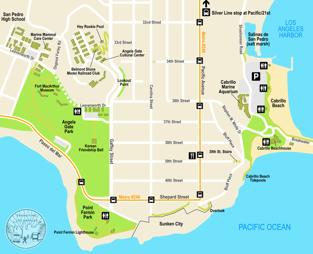 Getting to San Pedro by transit takes some time, depending on where you’re coming from, so you want to make sure you take that into account when planning your trip. The best option into San Pedro is the Silver Line (now renamed to the J line), an express bus service that mostly operates in freeway bus lanes between El Monte, Downtown LA, and San Pedro. It takes a little over an hour to get from Union Station (use the El Monte Busway stop) to San Pedro.