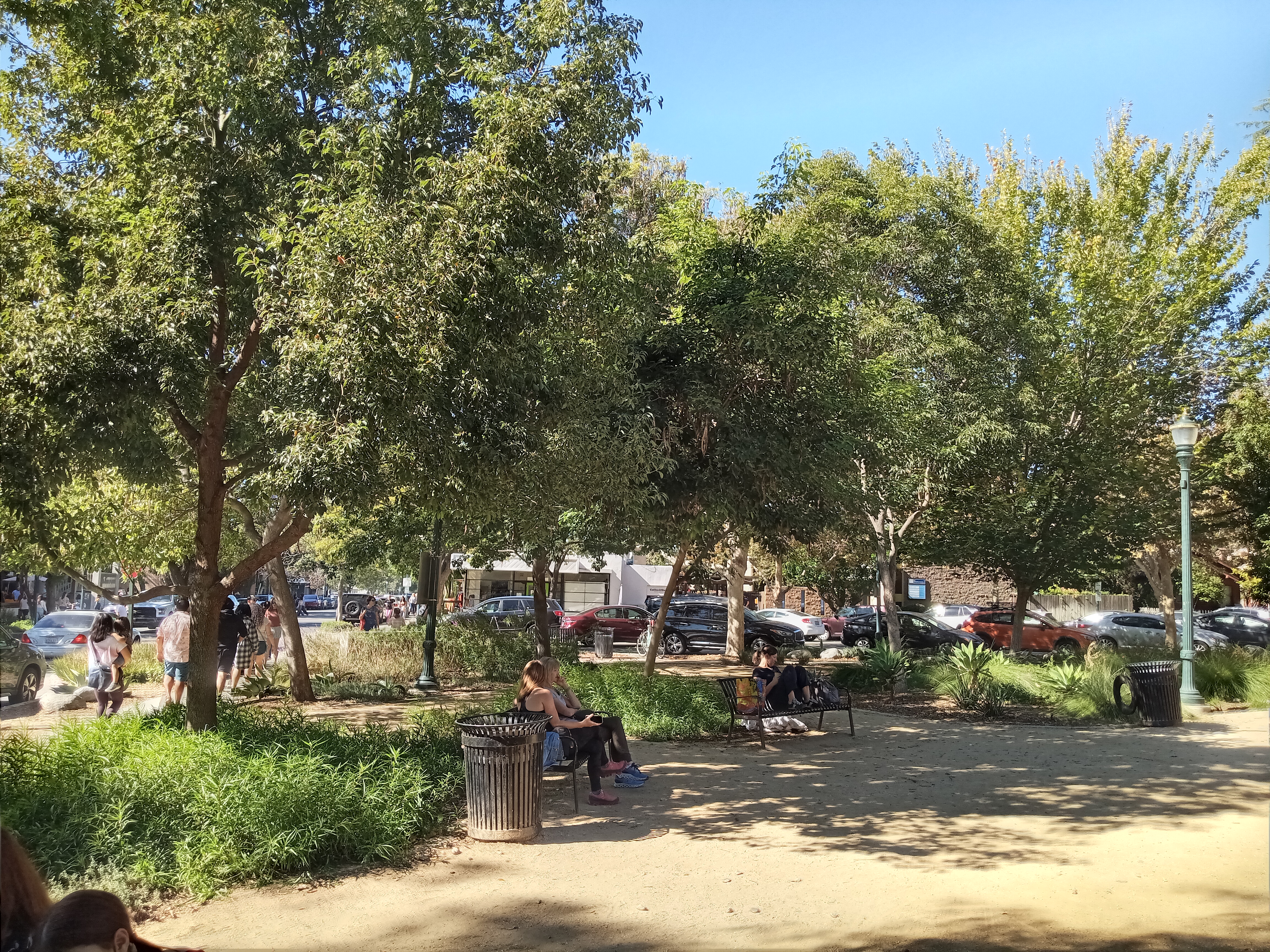 This stretch of Harvard Avenue essentially acts as Claremont’s civic center, lined with cute storefronts and lovely tall trees. A block up, at the corner of 2nd, you’ll find city hall, the library, and the town post office, all with very nice landscaping. Another block up, at the corner of Bonita Avenue, is a really charming set of local businesses, particularly the set inside what appears to be a former auto repair shop on the northwestern corner. Inside, you’ll find an acai bowl shop facing the corner, with a vintage store and a really nice nursery, Noren’s Nursery, around the back facing the Bonita Avenue side. And just across the street is the very pleasant Shelton Park, which has a lawn, a bandstand, and plenty of nice benches.