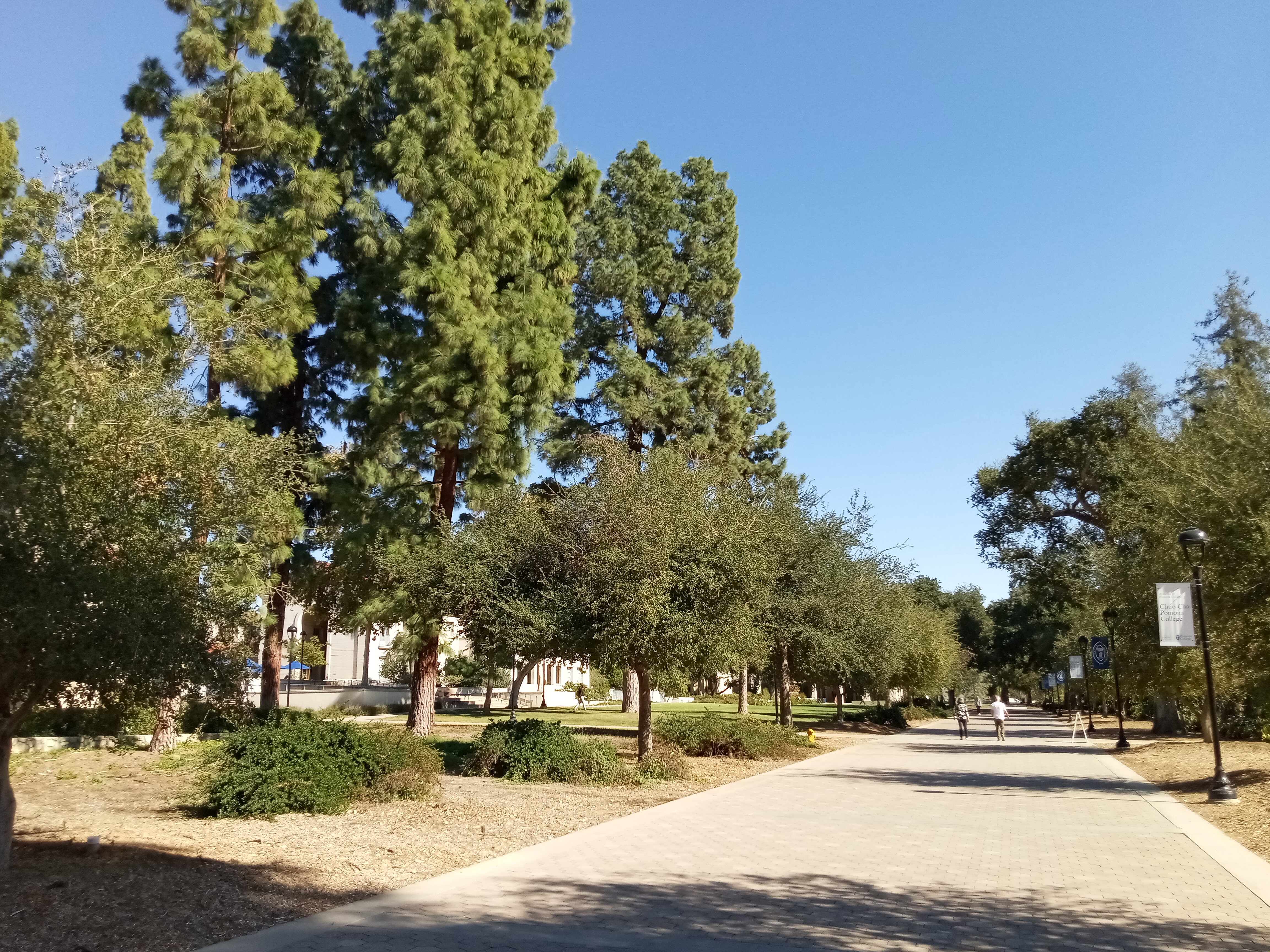 “The Beach” is the northern extent of Pomona College’s campus. Across the street is the Claremont Colleges Library, which serves all of the separate colleges. From here, the other college campuses are quite a bit smaller, with some being barely more than a block wide. A good example of this is Claremont McKenna College, whose modernist buildings bathed in orange sit just across 8th Street from The Beach. Claremont McKenna’s campus is centered around its narrow western end, where two rows of buildings frame a long pedestrian mall.