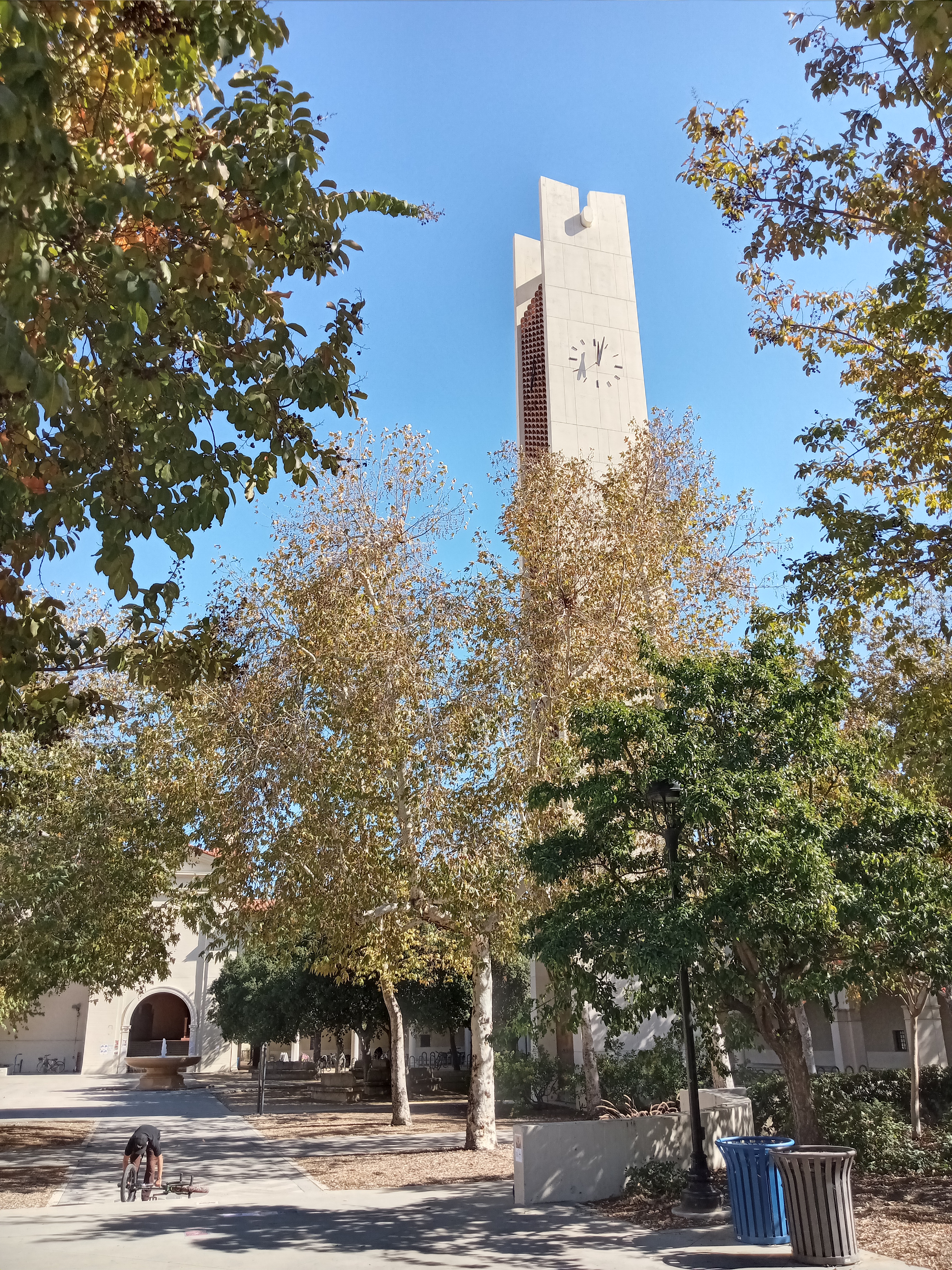 Just to the east of the science complex are the residential halls of Pomona College, where a nice little pedestrian mall leads to a large courtyard holding the campus’ clock tower. Just around the corner from this is a large lawn referred to as “The Beach,” (why it’s called that is beyond us, although there is a sand volleyball court and a few palm trees) which has a long retaining wall along the northern edge covered in graffiti art made by the college students.