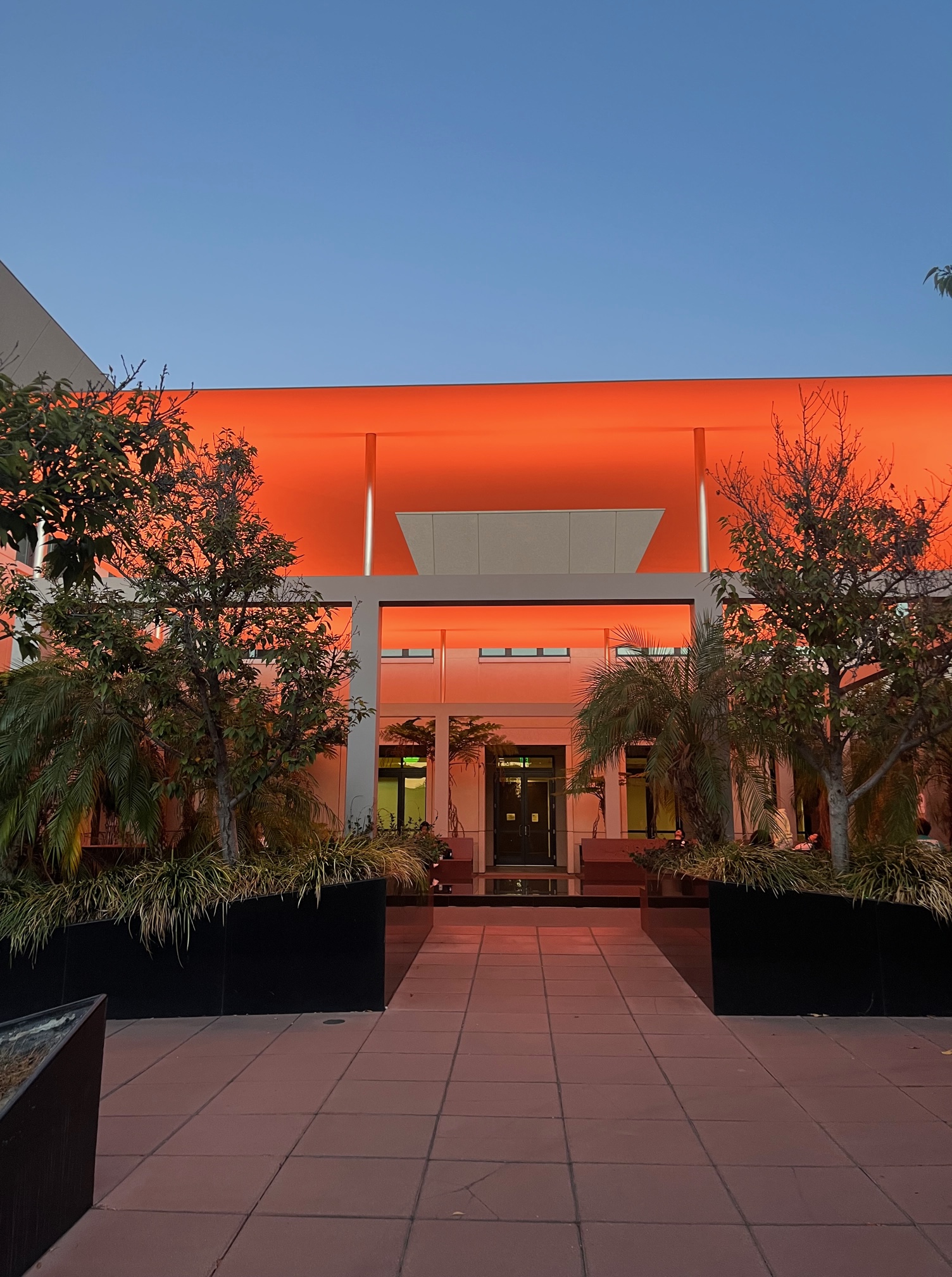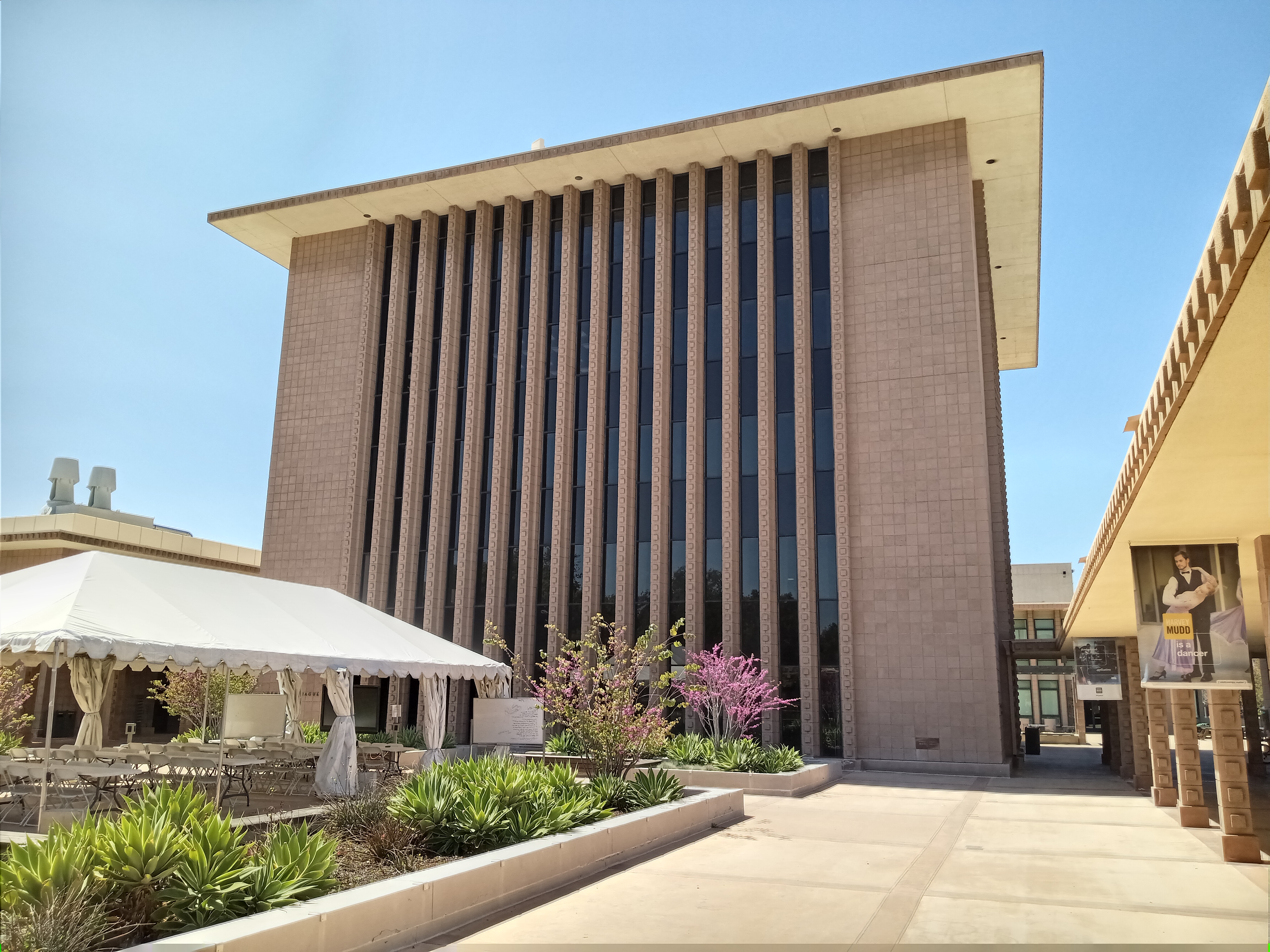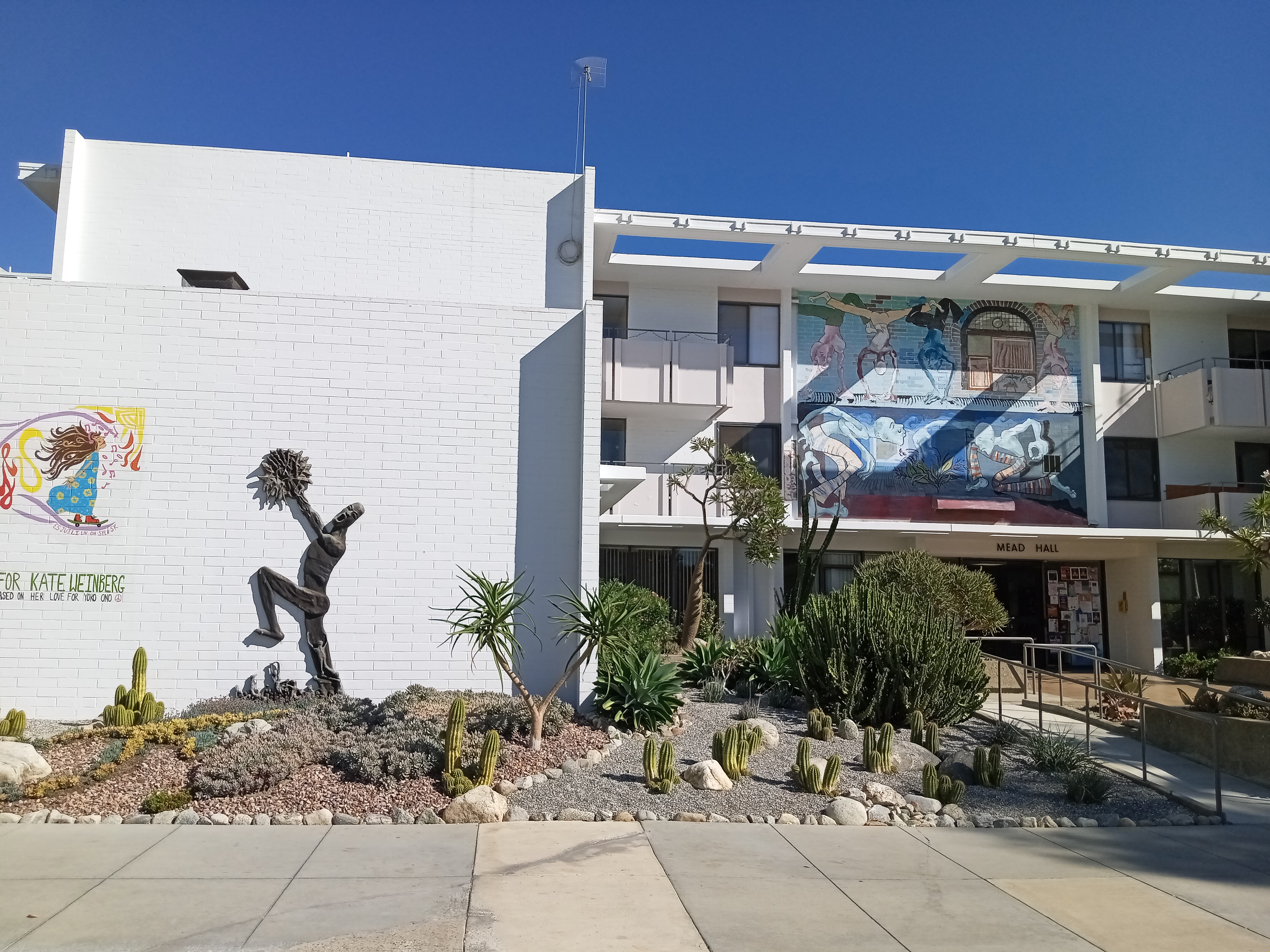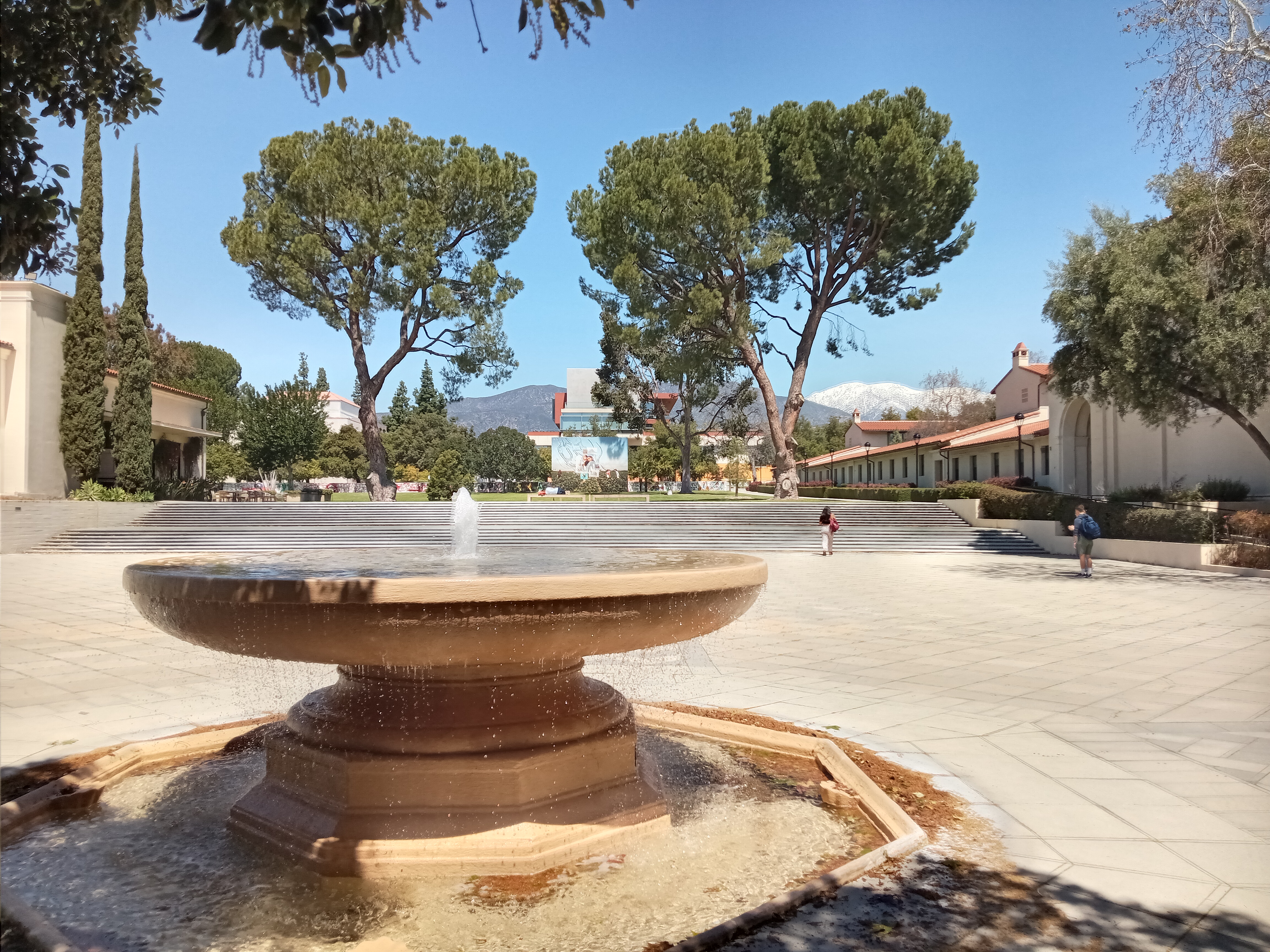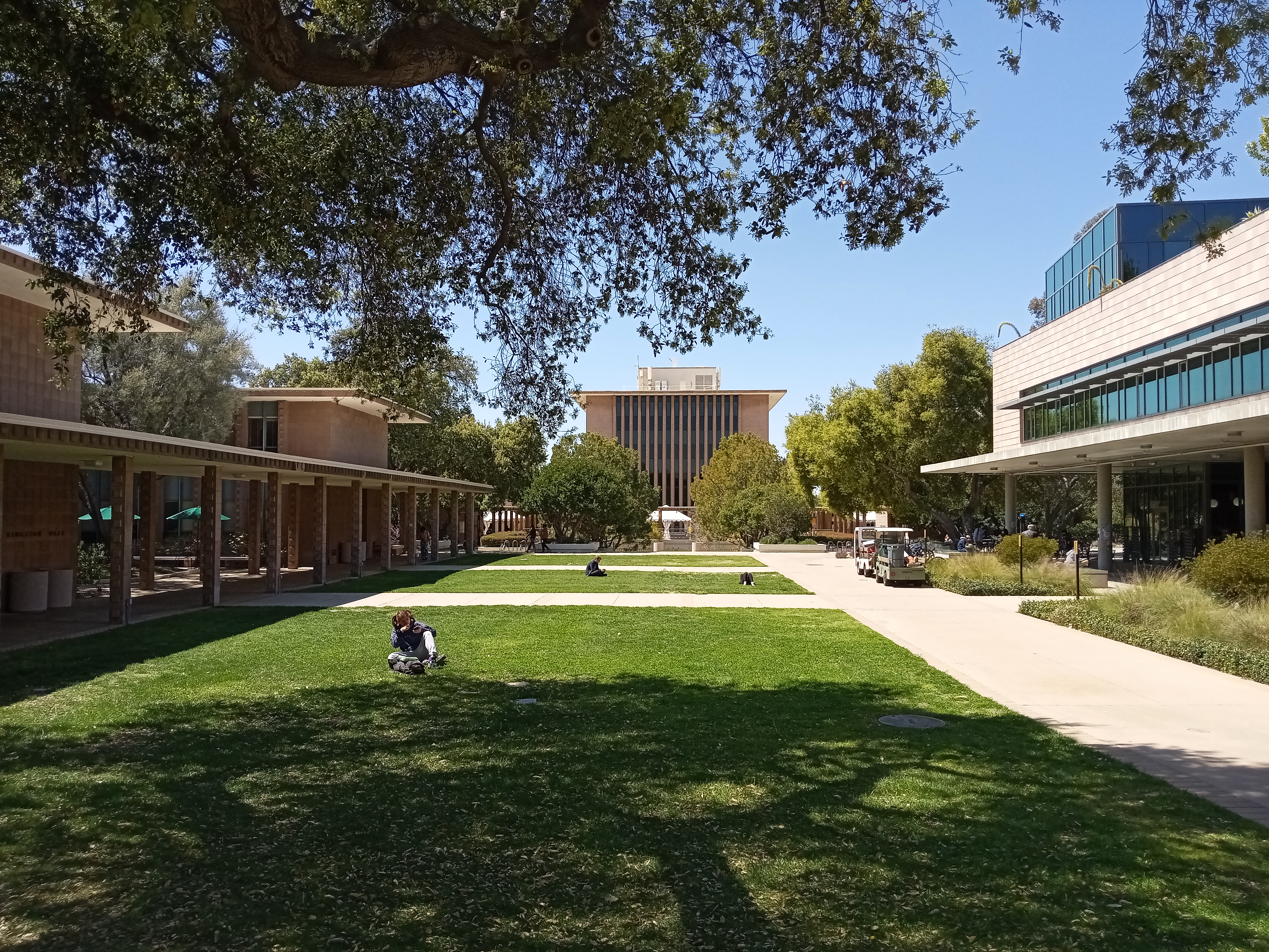 Claremont McKenna’s curriculum is mainly focused on poly sci, economics, and public affairs. Compared to the older and grander Pomona College, the campus here is rather dull. The only visual highlight is a large glass cube holding a study room, surrounded by a reflecting pool in the shadow of the giant orange building at the entrance. The landscaping of the pedestrian mall is quite nice, with some native plants and fountains, although the architecture itself is decidedly midcentury, down to the motel-style dorm rooms.