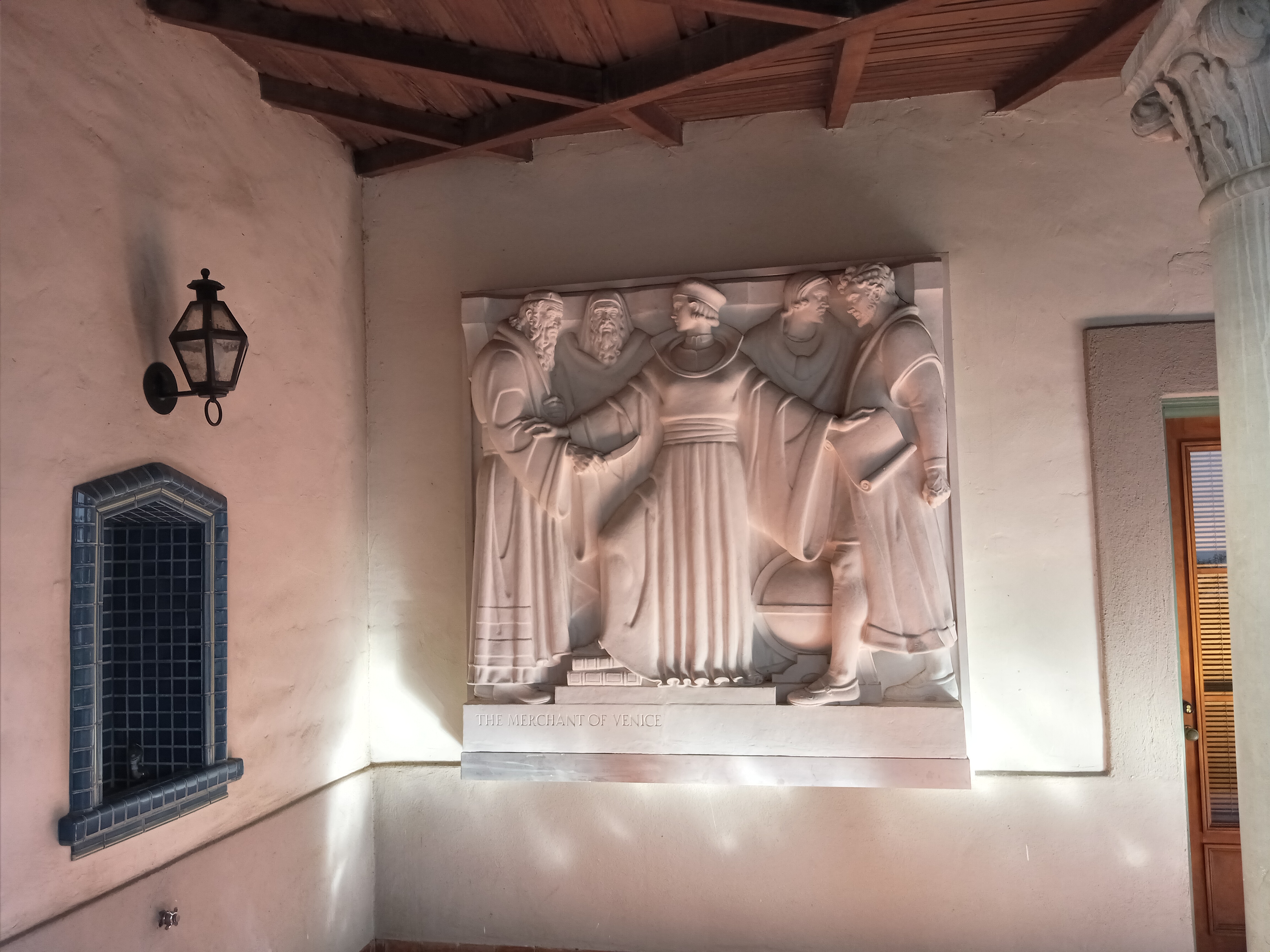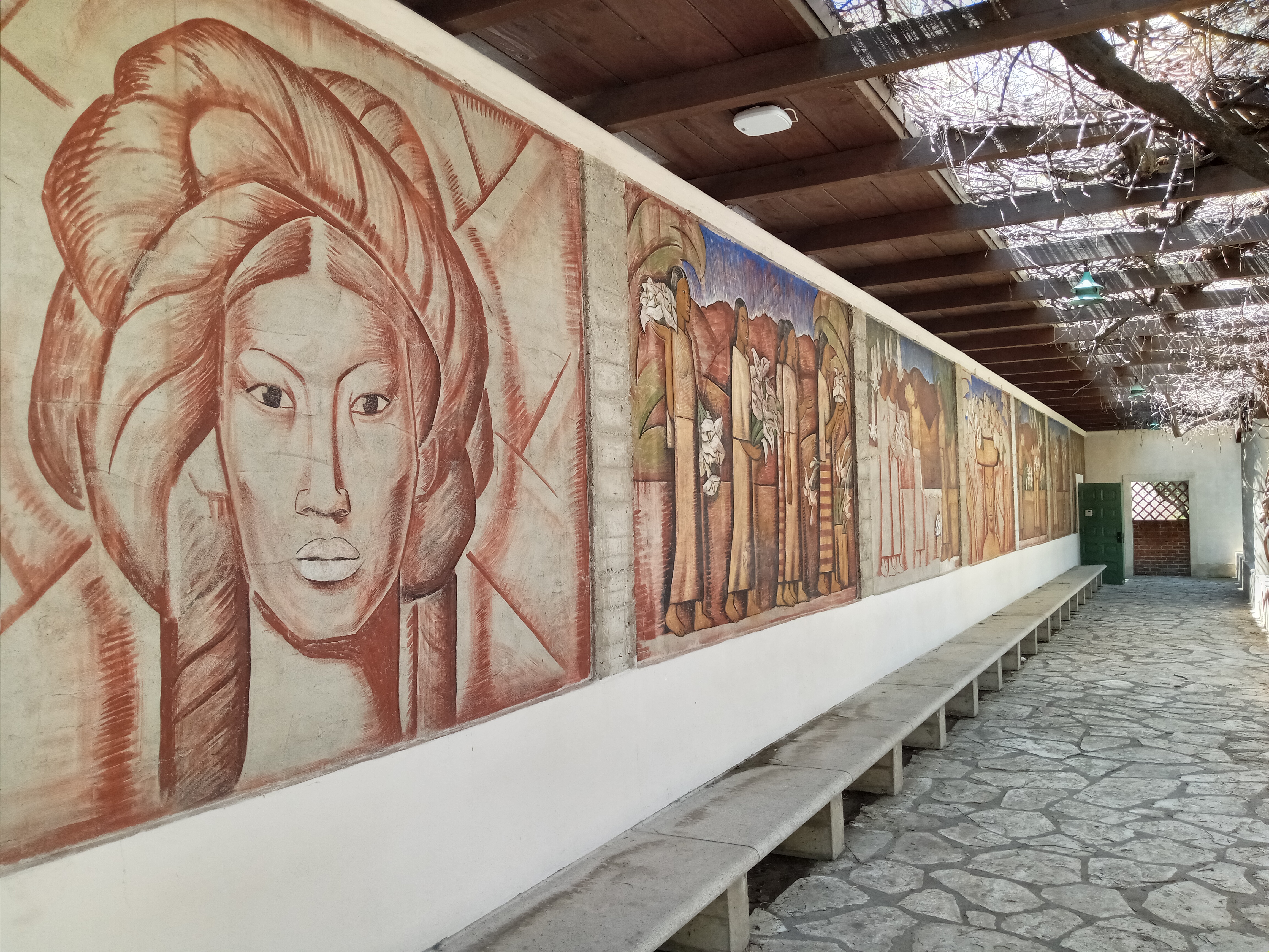 Continuing up the quad and around the corner to the right, you can find a secret, walled-off garden, the Margaret Fowler Garden, tucked on the north side of the Humanities Building. It’s only open on weekdays, but well worth a visit if it’s open. Inside you’ll find a Medieval cloister-style garden with a fountain, elaborately carved columns, beautiful murals along one side, and even a small chapel in the corner.