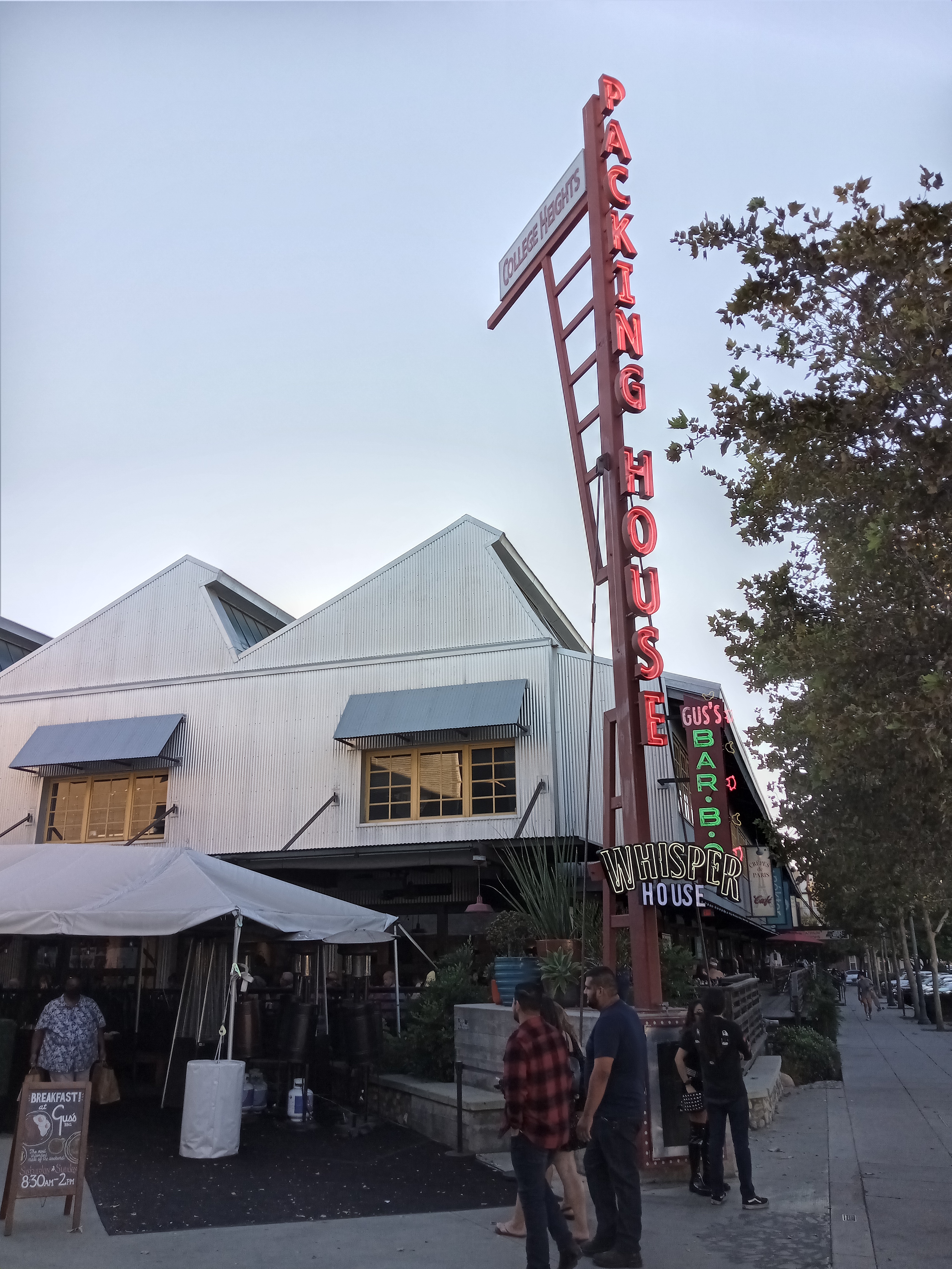 Returning to the train station, Claremont “Village” (or Downtown Claremont if you prefer) has plenty of nice shops and restaurants to enjoy. As the day comes to a close, an excellent place to eat while you wait for your train back is the Claremont Packing House, which sits on 1st Street just a couple blocks west of the Metrolink station. This part of Claremont is a bustling business district, with an outdoor mall, Village Square, across the street. The Packing House is a former citrus packing warehouse where produce from the numerous citrus groves of the Pomona Valley was brought and packed for shipment by rail. Today, it has been refurbished into a dining and entertainment center, with some historic displays and community functions like an art center and a bookstore inside.