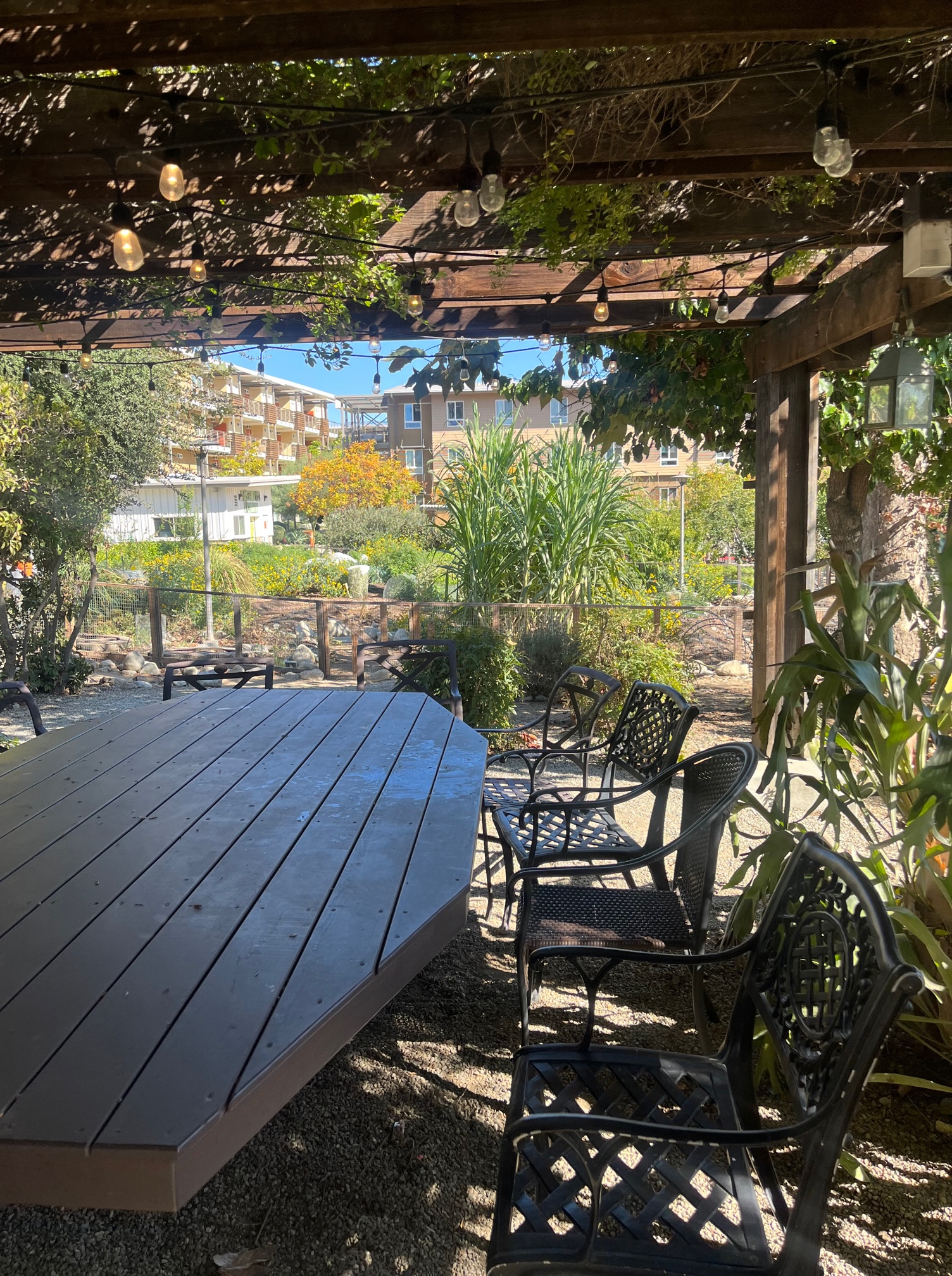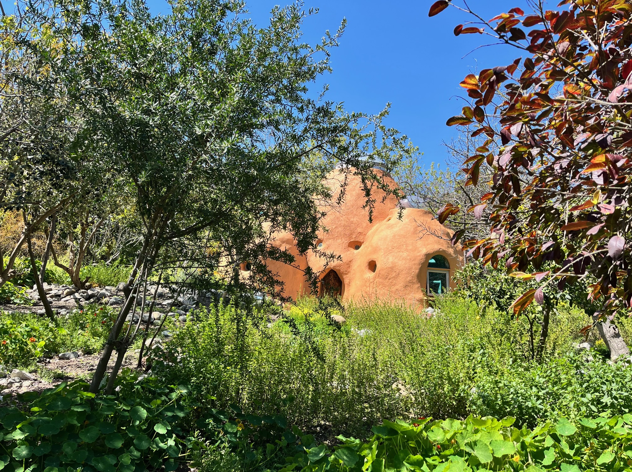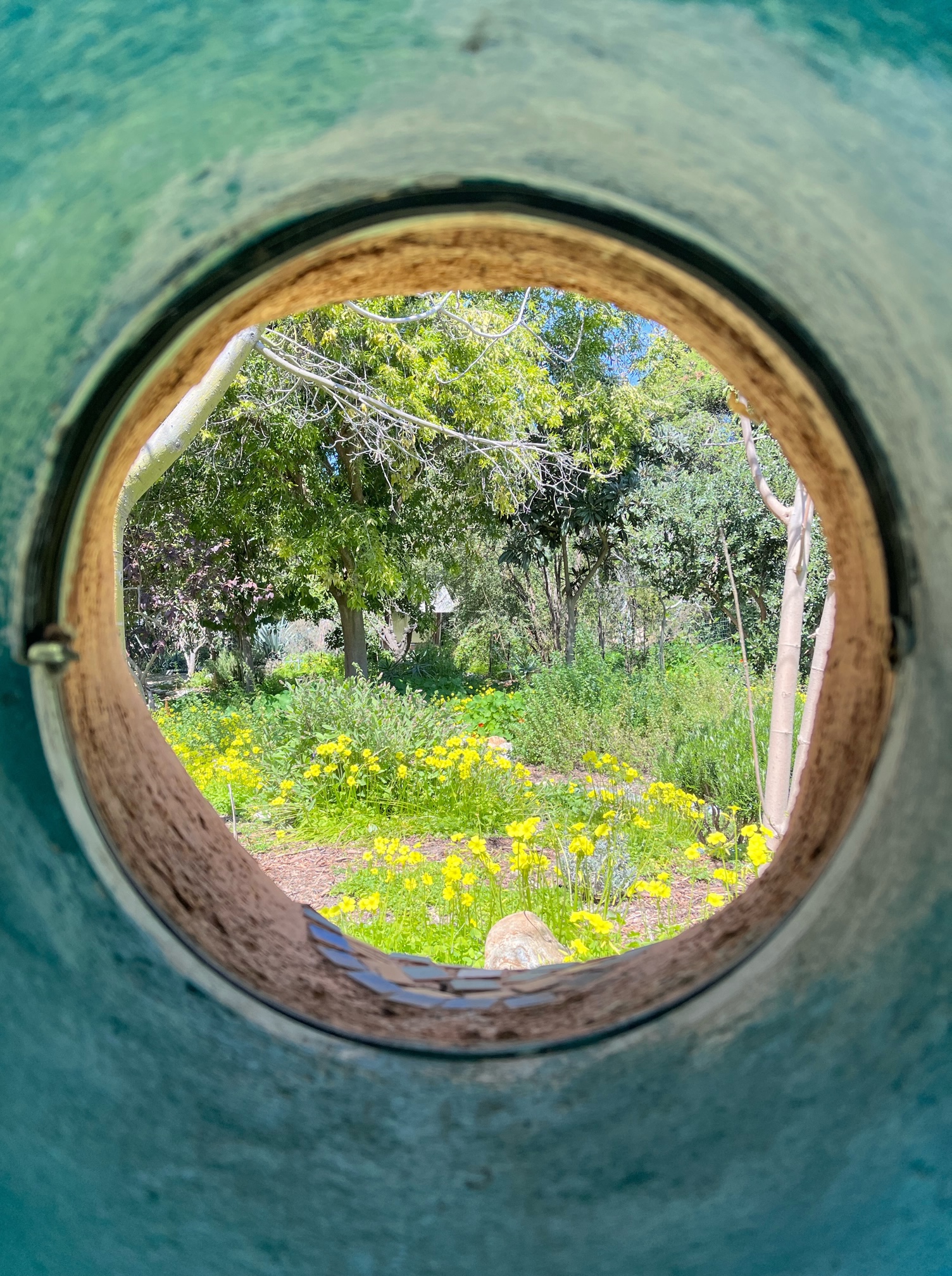 Continue downhill to the back of the Greek Theater and you should find an opening onto a small gravel road that cuts through the woods. Continue to the south, and the road will take you to the Pomona College Farm, a student-run organic farm that’s open to the public. In addition to the numerous flower and vegetable beds and even a chicken coop, the highlight is a small earth house that sits in the middle of the garden. When we visited, we found the front door (which is elaborately carved with garden motifs, like something out of the The Hobbit) wide open, allowing us to enter and admire the earthen architecture.